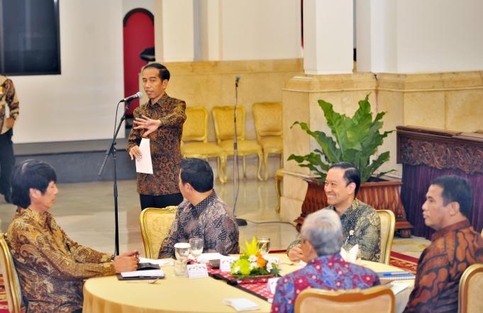 Presiden Joko Widodo berdialog dengan pedagang dan pengusaha beras serta pemilik penggilingan padi yang diundang di Istana Negara, Jakarta, Senin (28/9). Dalam pertemuan yang juga dihadiri Mendag Thomas Lembong, Menteri Pertanian Amran Sulaiman, Kepala Staf Presiden Teten Masduki, serta Dirut Perum Bulog, Djarot Kusumayakti tersebut, Presiden mendengarkan masukan dari pengusaha dan pedagang beras serta meminta mereka tidak mempermainkan harga demi mendapat untung besar. ANTARA FOTO/Yudhi Mahatma/aww/15.