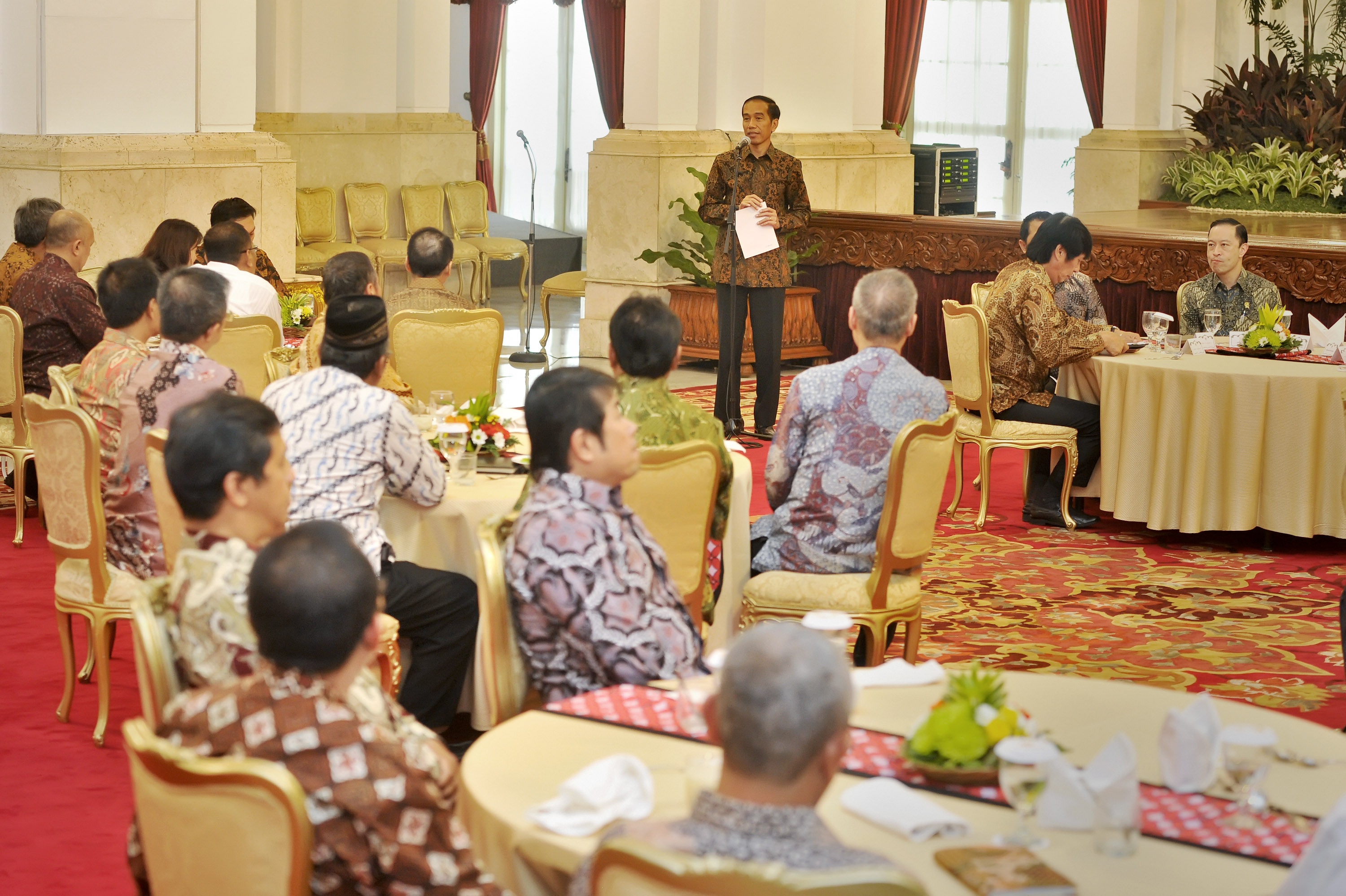Presiden Joko Widodo (kedua kanan) berdialog dengan pedagang dan pengusaha beras serta pemilik penggilingan padi yang diundang di Istana Negara, Jakarta, Senin (28/9). Dalam pertemuan yang juga dihadiri Mendag Thomas Lembong, Menteri Pertanian Amran Sulaiman, Kepala Staf Presiden Teten Masduki, serta Dirut Perum Bulog, Djarot Kusumayakti tersebut, Presiden mendengarkan masukan dari pengusaha dan pedagang beras serta meminta mereka tidak mempermainkan harga demi mendapat untung besar. ANTARA FOTO/Yudhi Mahatma/aww/15.