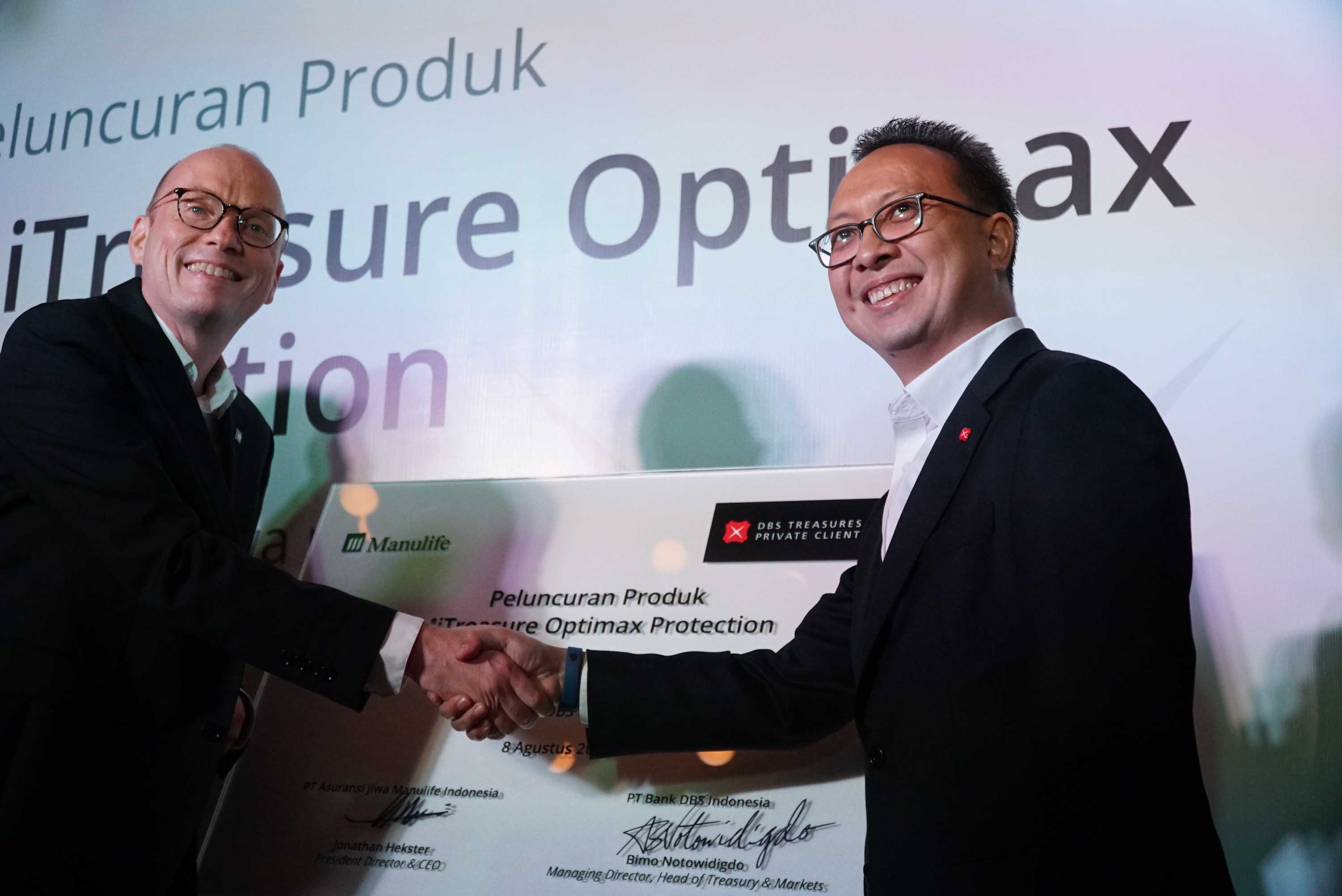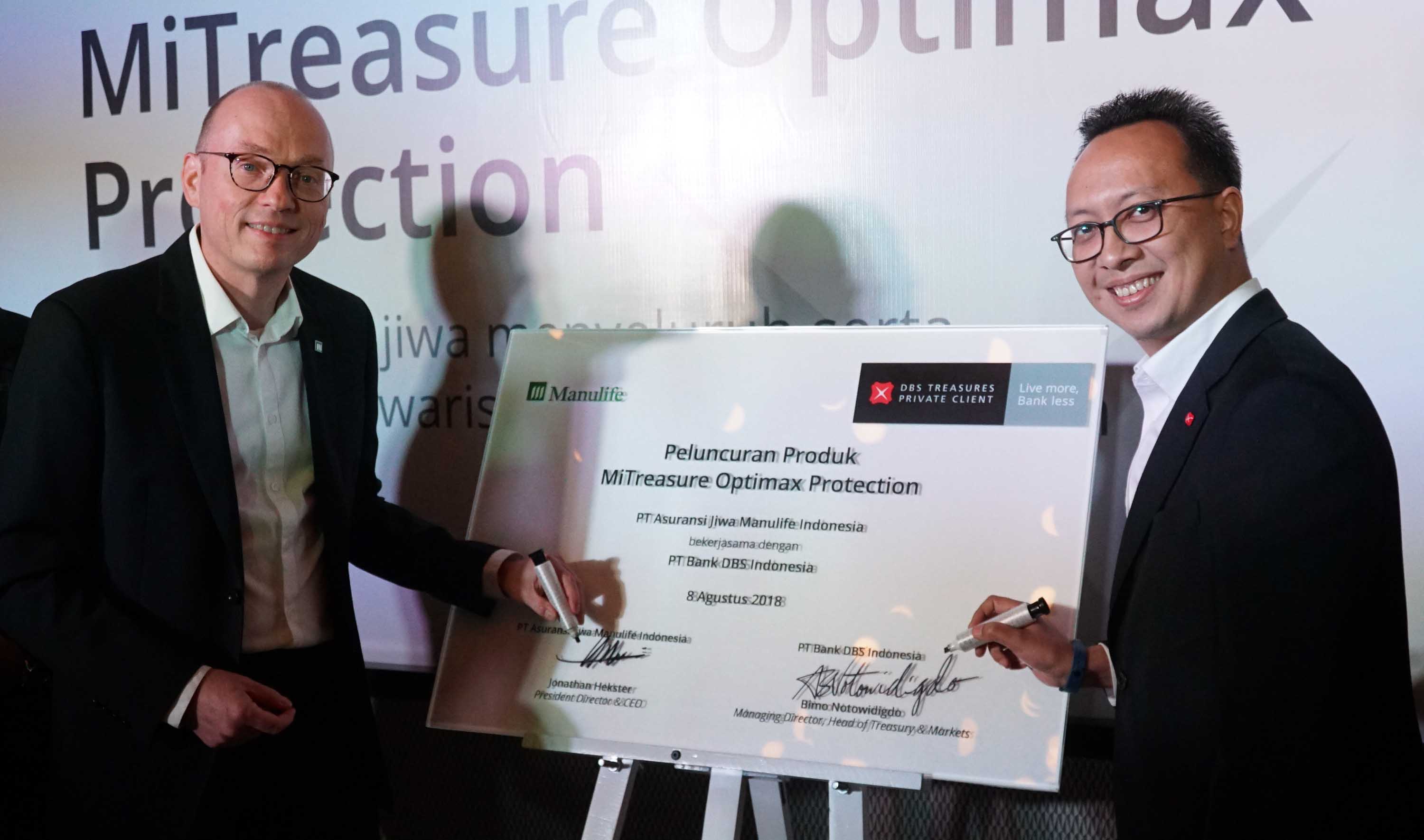 Presdir & CEO Manulife Indonesia Jonathan Hekster (kiri) dan Managing Director, Head of Treasury & Markets PT Bank DBS Indonesia (DBSI) Bimo Notowidigdo (kanan), menandatangani piagam kerja sama peluncuran produk asuransi MiTreasure Optimax Protection, disaksikan Bancassurance Head DBSI Natalina Syabana, di Jakarta, Rabu (8/8). Produk asuransi tersebut dirancang untuk melindungi para nasabah yang memiliki nilai aset tinggi (High Net Worth) dan berharap dapat menyiapkan pengelolaan warisan (legacy planning). AKTUAL/Eko S Hilman