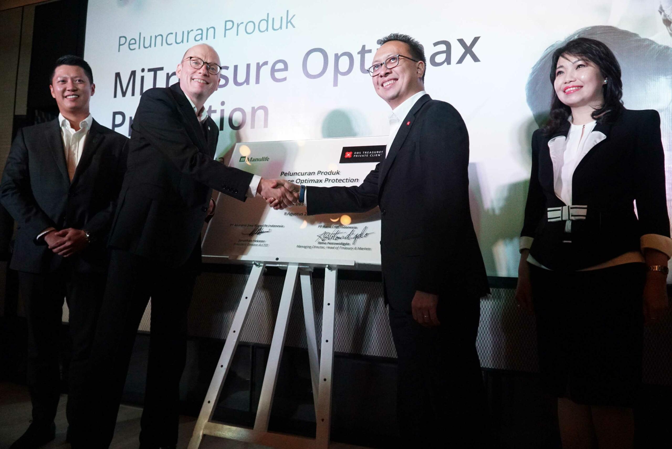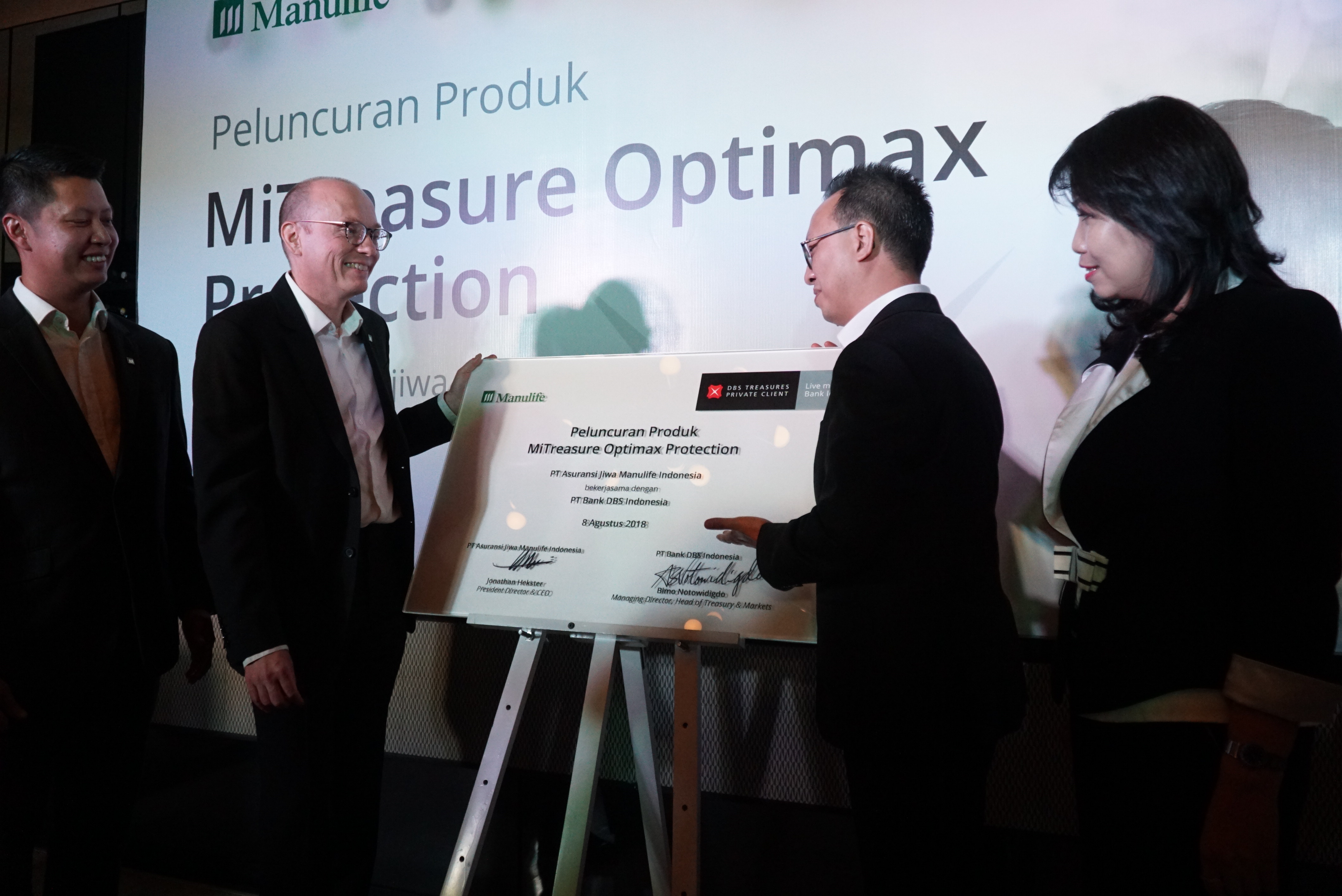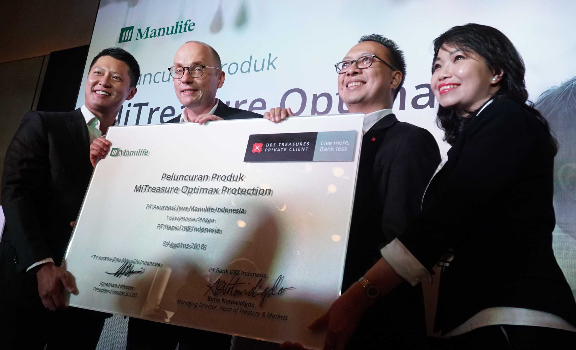 Presdir & CEO Manulife Indonesia Jonathan Hekster (kedua kiri) dan Managing Director, Head of Treasury & Markets PT Bank DBS Indonesia (DBSI) Bimo Notowidigdo (kedua kanan), menandatangani piagam kerja sama peluncuran produk asuransi MiTreasure Optimax Protection, disaksikan Bancassurance Head DBSI Natalina Syabana, di Jakarta, Rabu (8/8). Produk asuransi tersebut dirancang untuk melindungi para nasabah yang memiliki nilai aset tinggi (High Net Worth) dan berharap dapat menyiapkan pengelolaan warisan (legacy planning). AKTUAL/Eko S Hilman