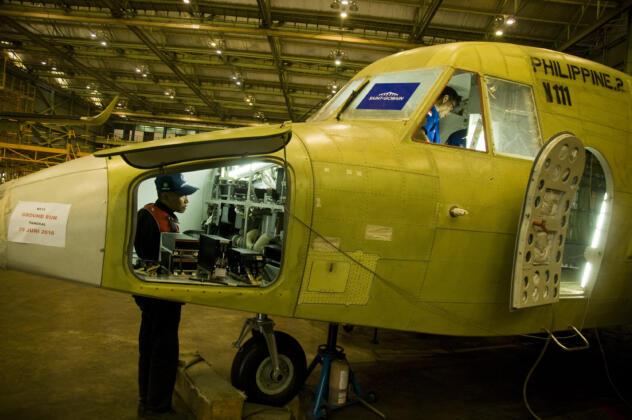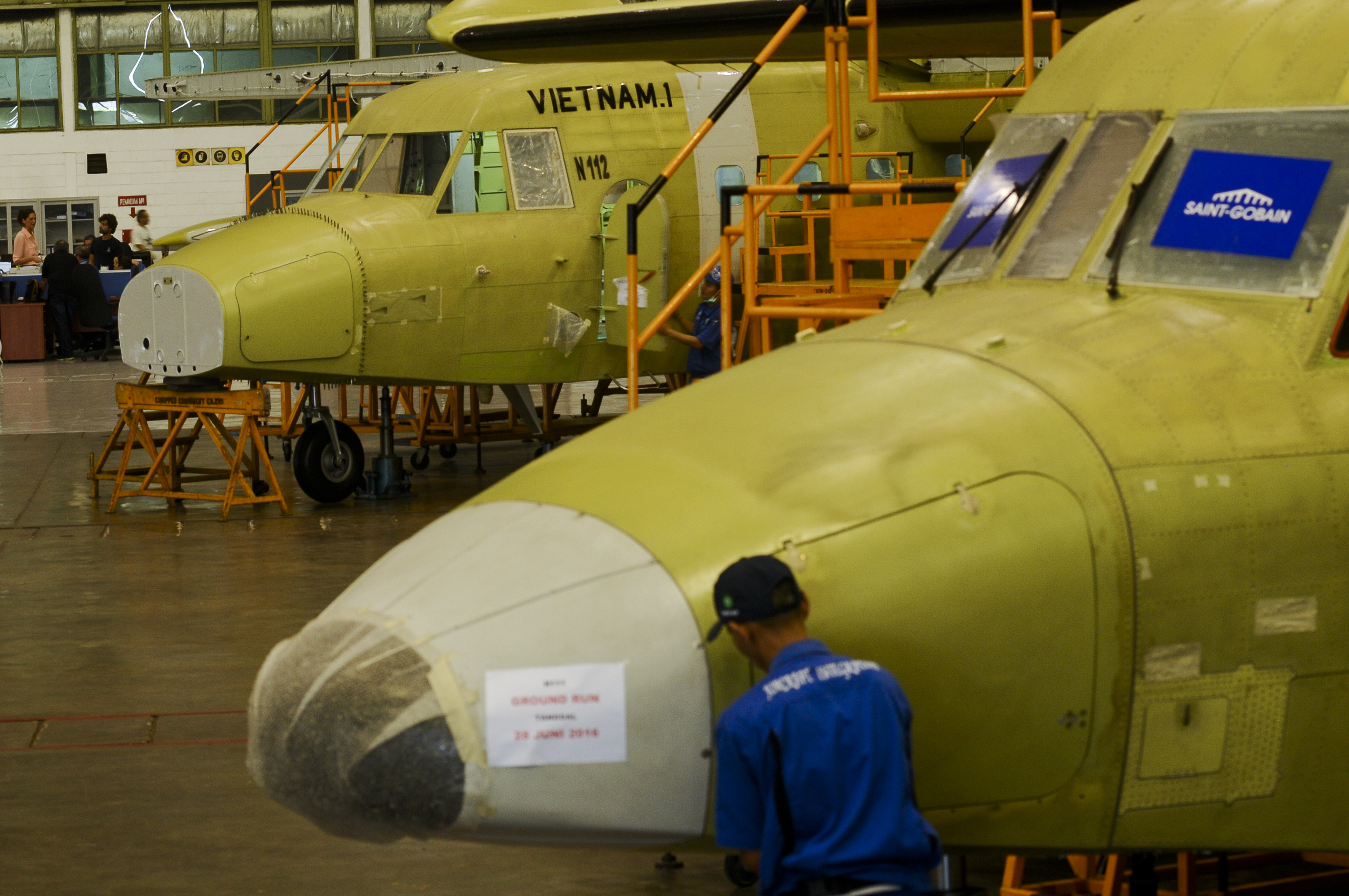 Sejumlah teknisi menyelesaikan produksi pesawat NC212i di hanggar PT Dirgantara Indonesia (DI), Bandung, Jawa Barat, Jumat (24/6). Pesawat NC212i merupakan pesawat multiguna generasi terbaru dengan daya angkut 28 penumpang, yang sepenuhnya dikerjakan oleh PT DI dan diproduksi untuk memenuhi pesanan dari Negara Filipina sebanyak dua unit dan 3 unit pesanan dari Negara Vietnam untuk kebutuhan militer seperti patroli maritim dan penjaga pantai. ANTARA FOTO/Novrian Arbi/ama/16