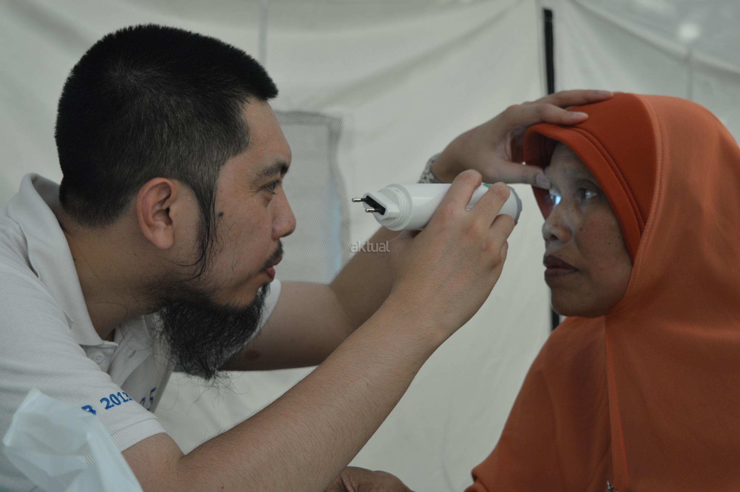 Salah satu dokter spesialis mata memeriksa salah seorang warga Rusun Marunda, Jakarta Utara, di acara Baksos Akbar OK CARE Anies Sandi yang digelar di 100 titik se-DKI Jakarta, di Rusun Marunda RW 010, Jakarta Utara, Minggu (9/4/2017). Program ini kerjasama antara Jakarta Fly (Jakarta Forum Lembaga dan Yayasan) dan Komunitas Medis Peduli (KMP). AKTUAL/HO
