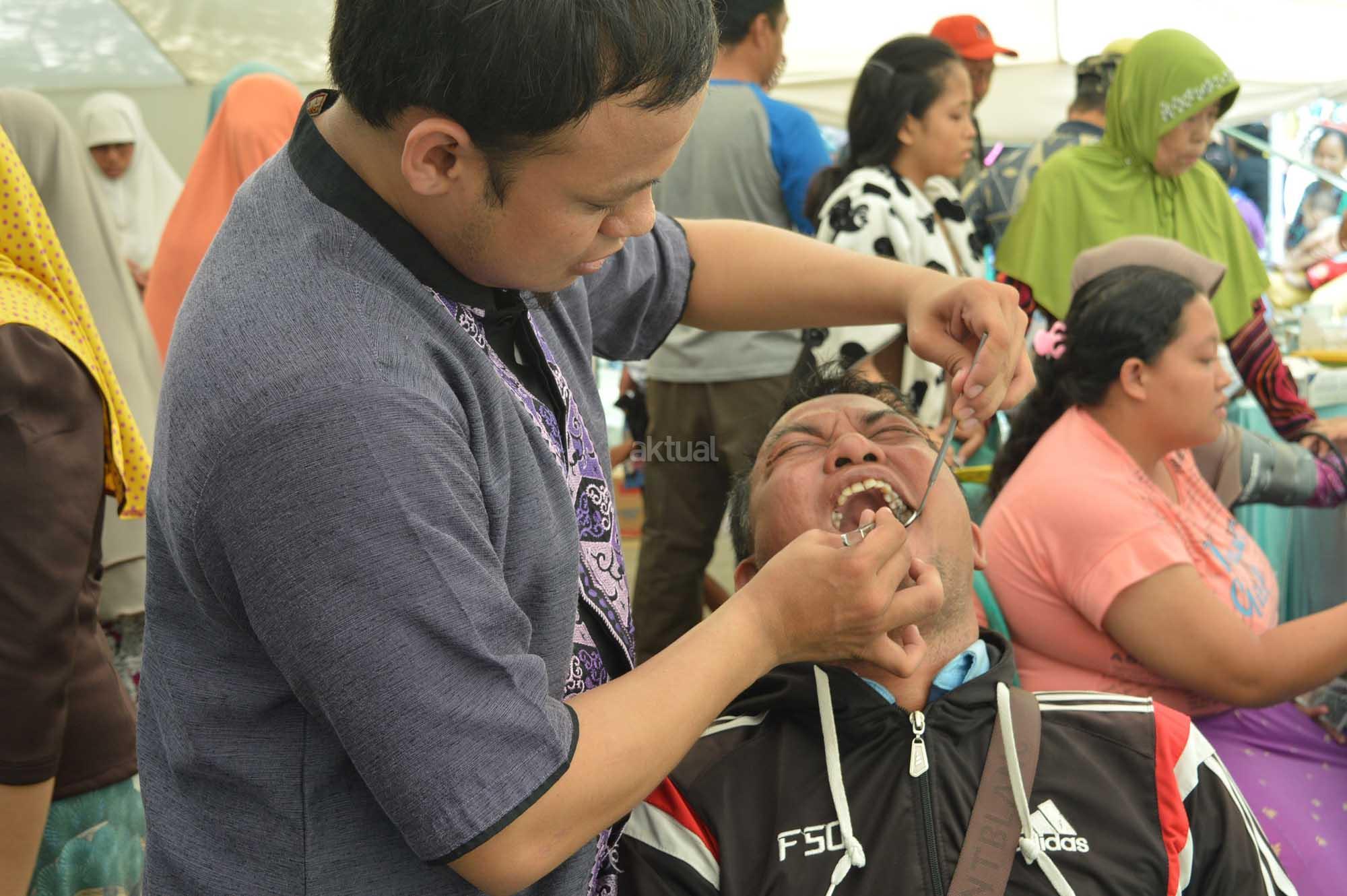 Salah seorang warga sedang diperiksa mulut dan giginya oleh dokter spesialis gigi di acara Baksos Akbar OK CARE Anies Sandi yang digelar di 100 titik se-DKI Jakarta, di Rusun Marunda RW 010, Jakarta Utara, Minggu (9/4/2017). Program ini kerjasama antara Jakarta Fly (Jakarta Forum Lembaga dan Yayasan) dan Komunitas Medis Peduli (KMP). AKTUAL/HO