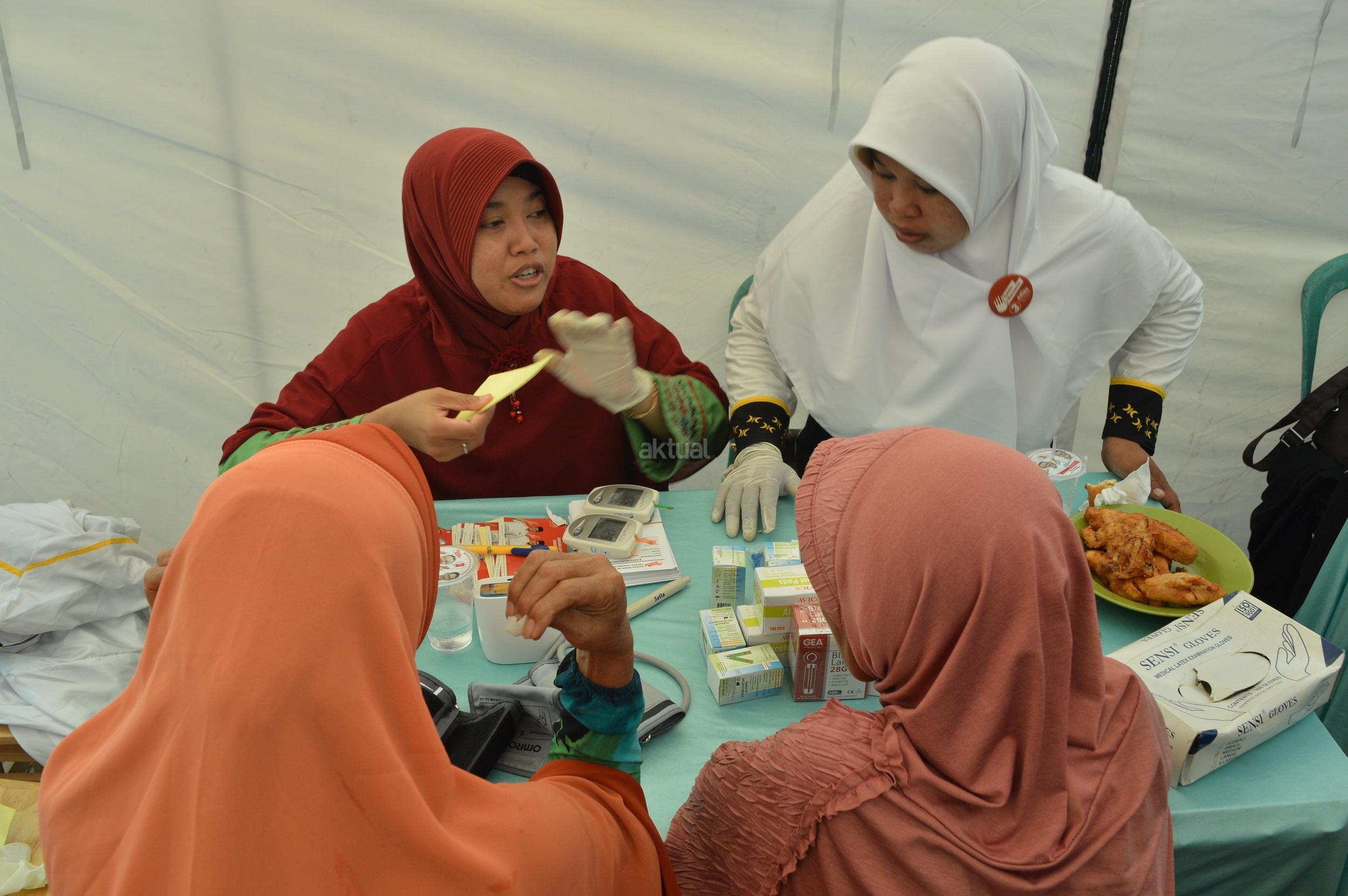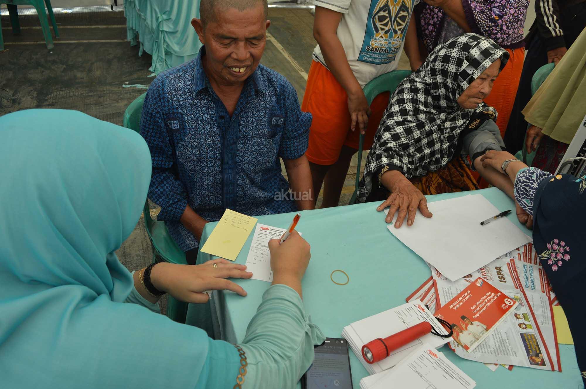 Suasana pengecekan Asam Urat, Gula Darah dan Kolesterol, pada Program Baksos Akbar OK CARE Anies Sandi yang digelar di 100 titik se-DKI Jakarta diminati 90 Ribu Warga Jakarta, salah satunya terlihat di salah satu dari 3 titik besar yang dilengkapi dengan 13 dokter spesialis, juga ada 33 titik dilengkapi dengan spesialis kebidanan di Rusun Marunda RW 010, Jakarta Utara, Minggu (9/4/2017). Program ini kerjasama antara Jakarta Fly (Jakarta Forum Lembaga dan Yayasan) dan Komunitas Medis Peduli (KMP). AKTUAL/HO