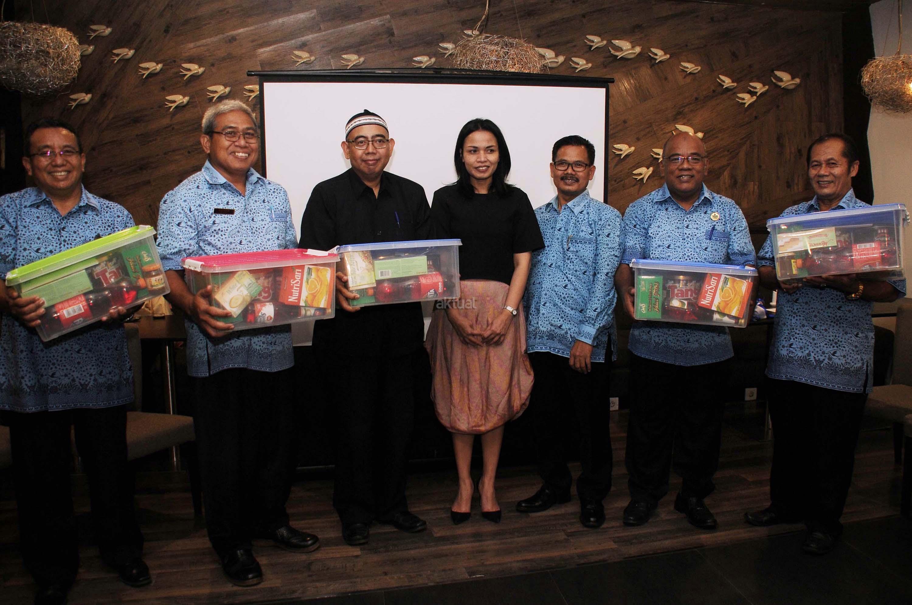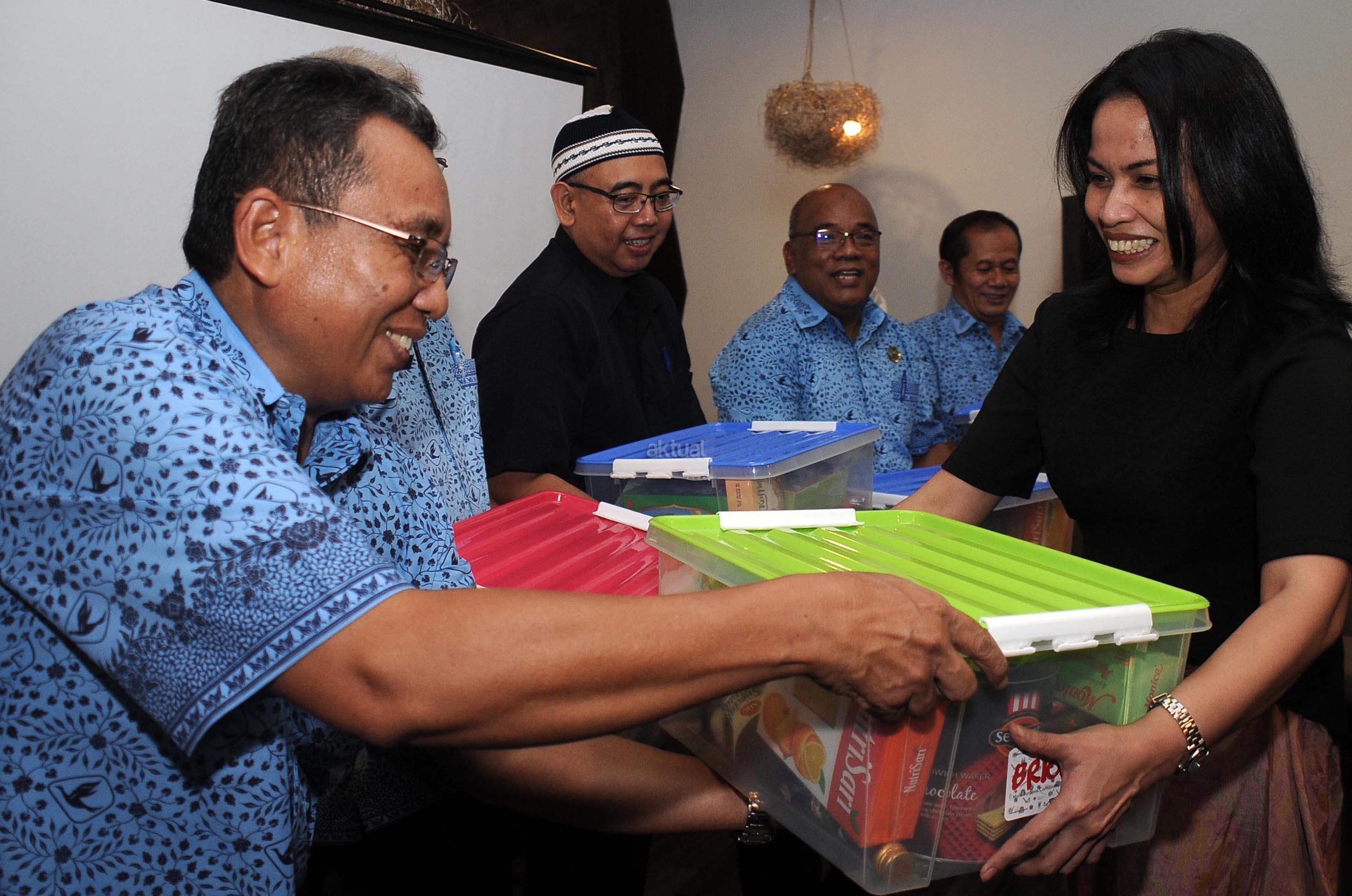 Direktur Marketing PT Blue Bird Tbk Amelia Nasution (kanan) memberikan bingkisan kepada pengemudi Blue Bird yang telah menunaikan Ibadah Umroh dengan biaya perusahaan dalam acara buka puasa bersama bersama para awak media di Jakarta, Rabu (21/6/2017). Pada kesempatan tersebut Blue Bird juga memberikan perlengkapan menggambar untuk penderita kanker Yayasan Rumah Harapan Valencia yang diterima oleh Mieke Randa sebagai ‘Founder’ Rumah Singgah Harapan Valencia. AKTUAL/Munzir