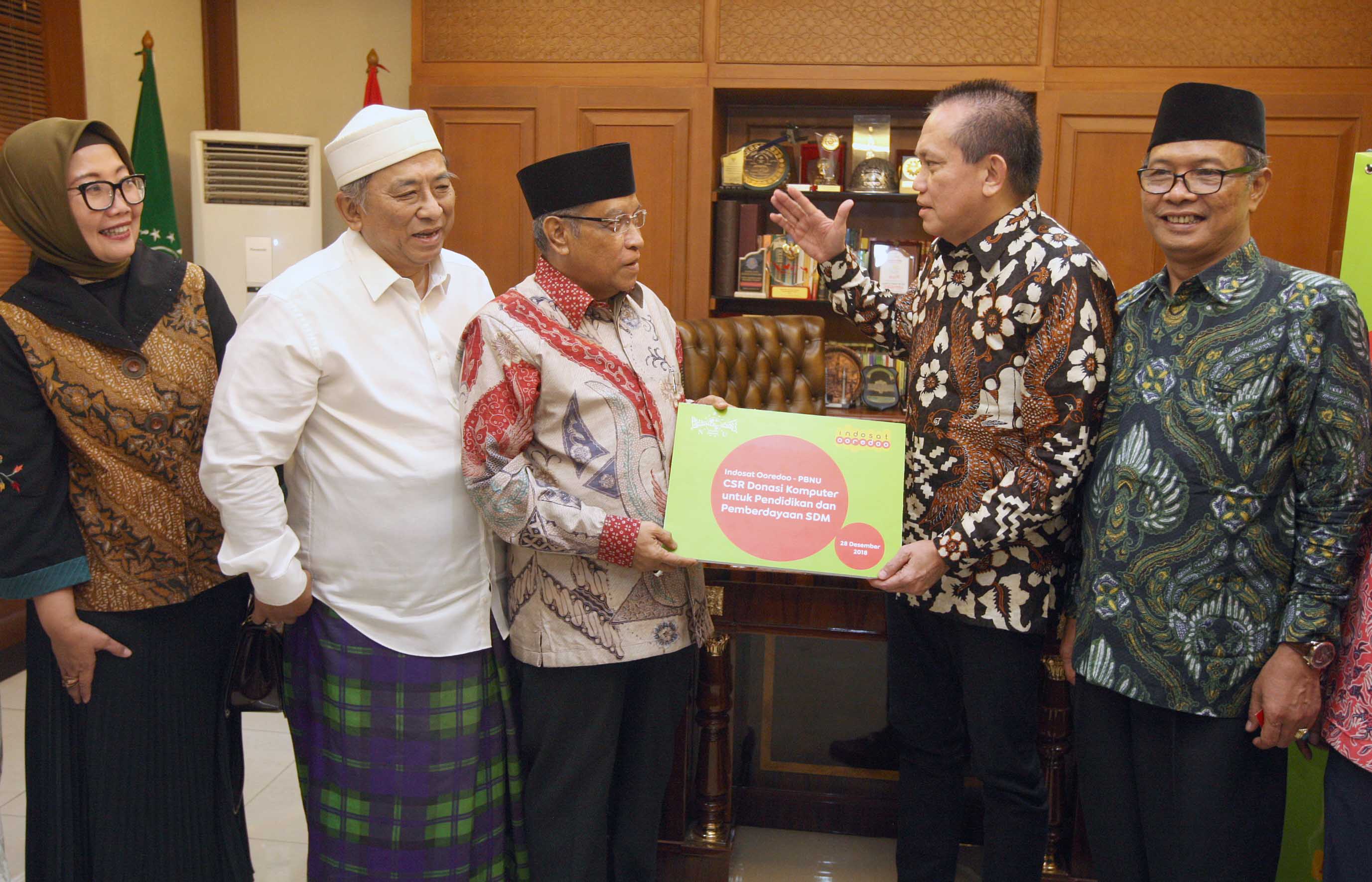 President Director & CEO Indosat Ooredoo Chris Kanter didampingi Head Corporate Communications Indosat Turina Farouk menyerahkan secara simbolis Donasi Komputer yang diterima oleh Ketua Umum Pengurus Besar Nahdlatul Ulama (PBNU) KH Said Aqil Siroj, Bendahara NU Dr.–Ing H. Bina Suhendra, Ketua Pengurus Besar Nahdlatul Ulama (PBNU) Robikin Emhas dan jajaran pengurus lainnya di Kantor Pusat PBNU, Jakarta, Jumat (28/12). Indosat Ooredoo memiliki dua pilar program CSR itu yaitu Pendidikan & Pengembangan Komunitas (Community Develepment). “Indosat Ooredoo berharap pemberian CSR donasi komputer ini dapat dimanfaatkan seoptimal mungkin guna mendukung program pengembangan pendidikan dalam organisasi PBNU. AKTUAL/Eko S Hilman