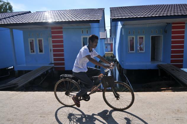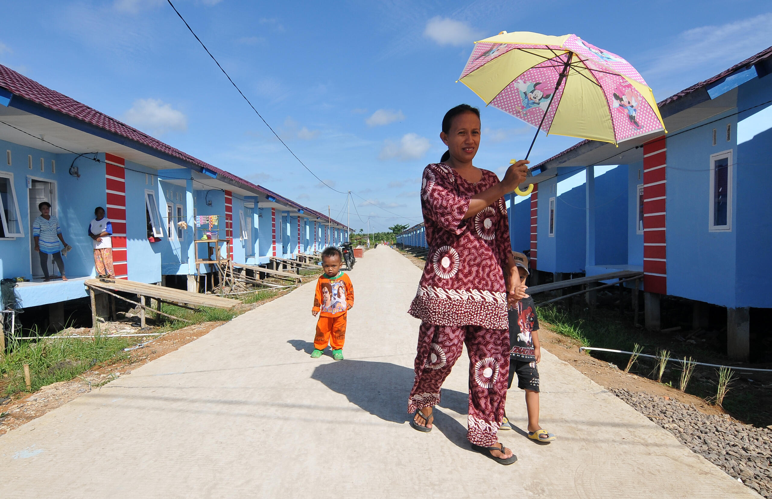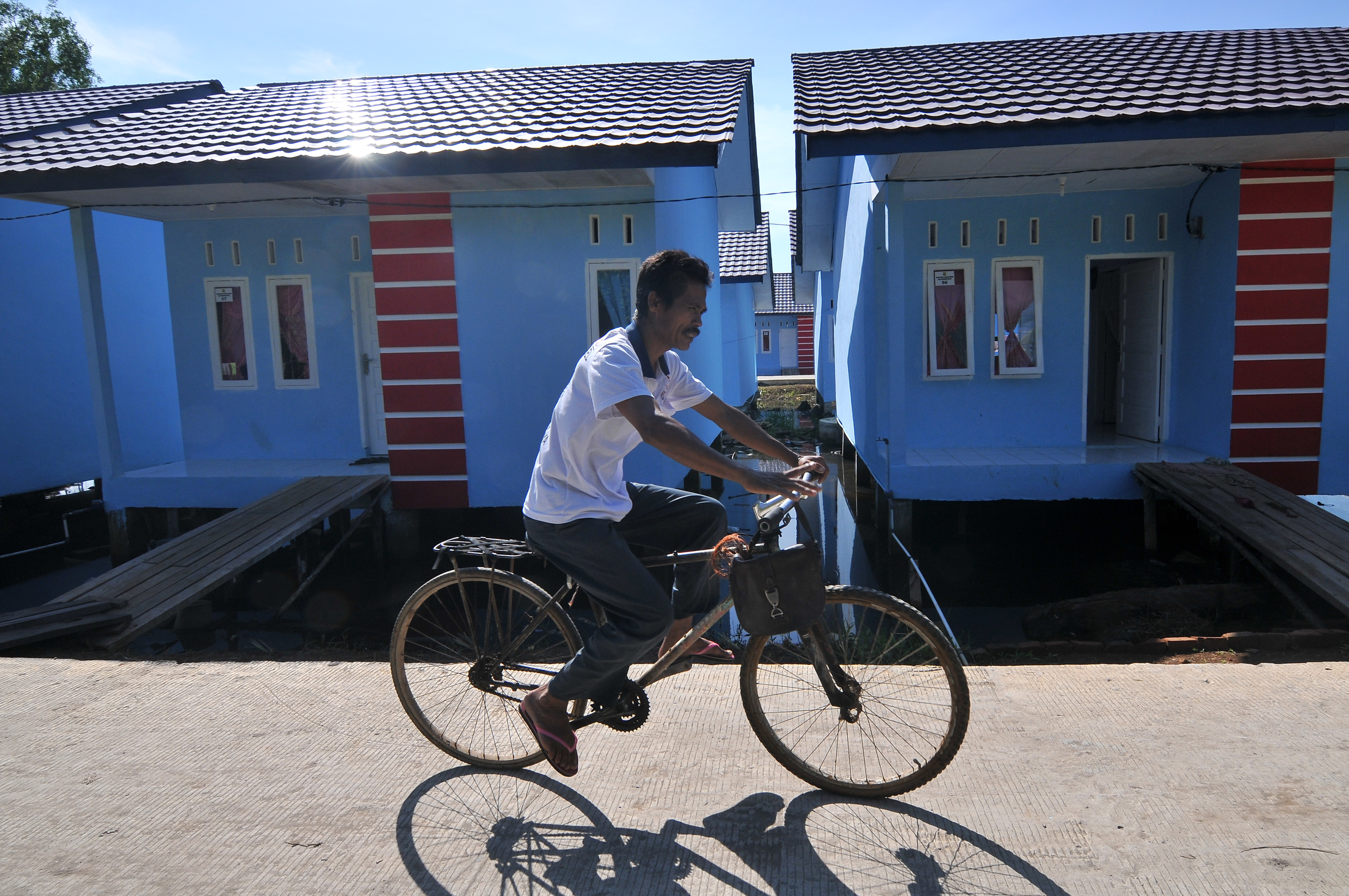 Warga beraktivitas di kompleks perumahan nelayan Kabupaten Tanjung Jabung Timur di Majelis Hidayah, Kuala Jambi, Jambi, Rabu (18/5). Sebanyak 80 kepala keluarga (KK) dari 100 KK yang mendapatkan bantuan 100 unit rumah dari Kementerian Pekerjaan Umum dan Perumahan Rakyat di daerah itu mulai menempati bangunan rumah, dan berharap janji pemerintah untuk secepatnya mengalirkankan listrik dan air segera terwujud. ANTARA FOTO/Wahdi Septiawan/pd/16.