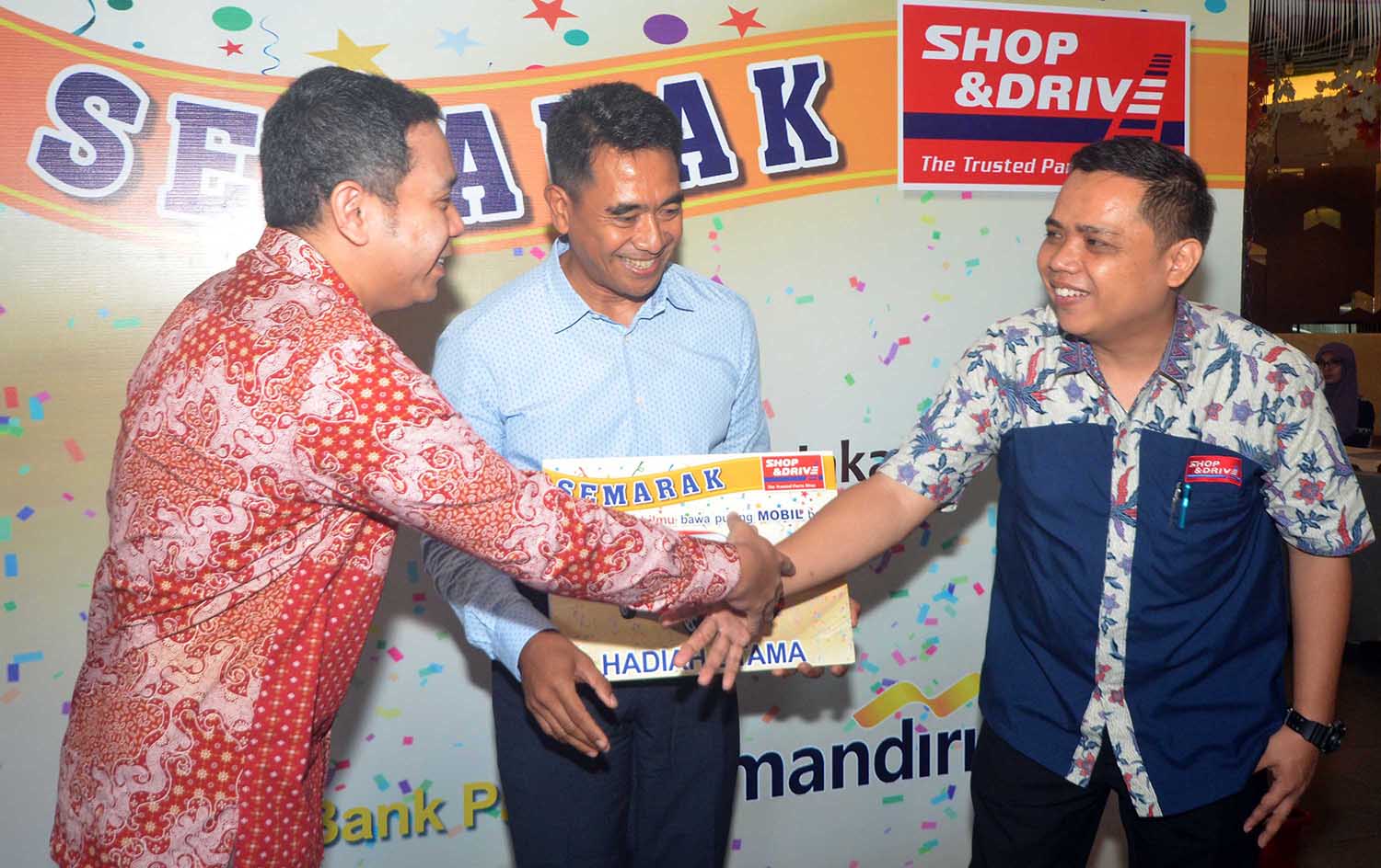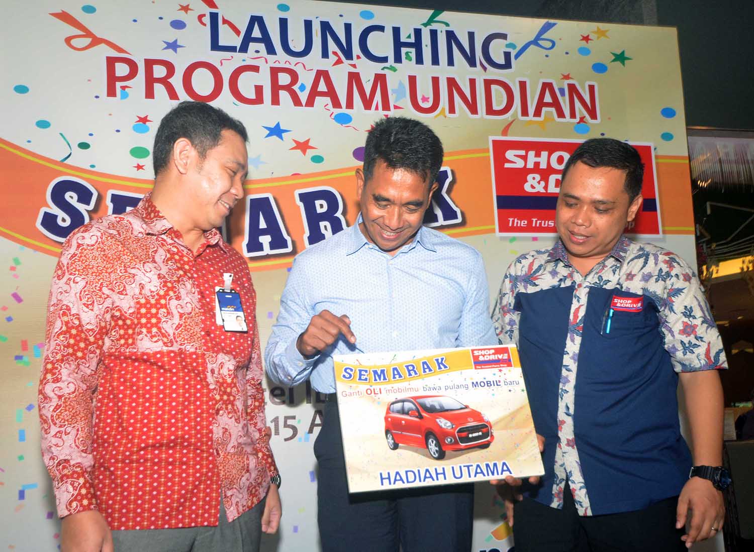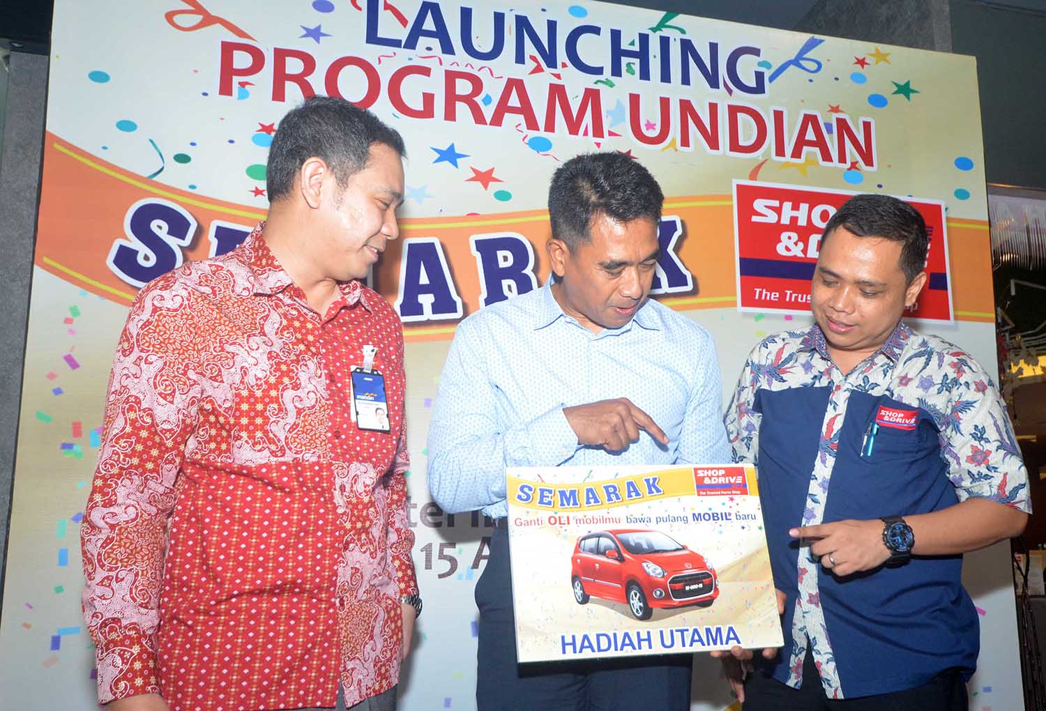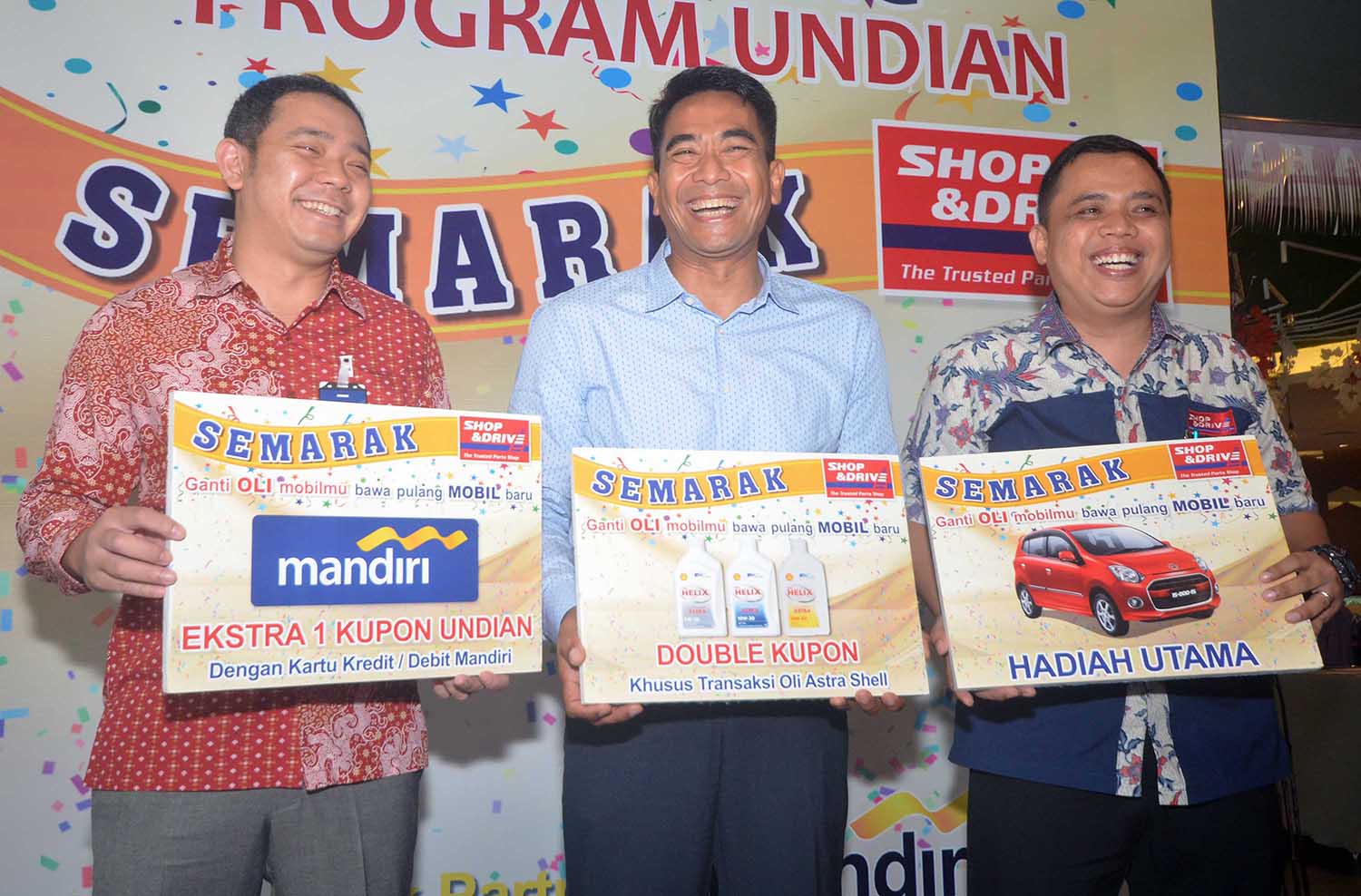 Chief Marketing Executive Astra Otoparts, Rio Sanggau (tengah) bersama Vice President Consumer Deposit Group Bank Mandiri, Reza Adriansyah (kiri) dan Retail Division Head Astra Otoparts, Indra Nugraha saat peluncuran program undian " Semarak Shop& Drive, Ganti Oli Mobilmu, Bawa Pulang Mobil Baru" di Jakarta, senin (15/8). Program ini ditujukan untuk seluruh pelanggan yang melakukan transaksi oli di seluruh outlet shop& drive di Indonesia. Saat ini, Shop & drive merupakan salah satu bisnis ritel modern otomotif milik Astra Otoparts dan menjadi bisnis ritel modern otomotif yang terbesar di Indonesia. Shop&Drive telah memiliki 363 outlet yang tersebar di seluruh Indonesia (Jawa, Bali, Sumatera, Batam, Kalimantan, Sulawesi,dan Nusa Tenggara). Program ini akan berlangsung hingga 31 Desember 2016.