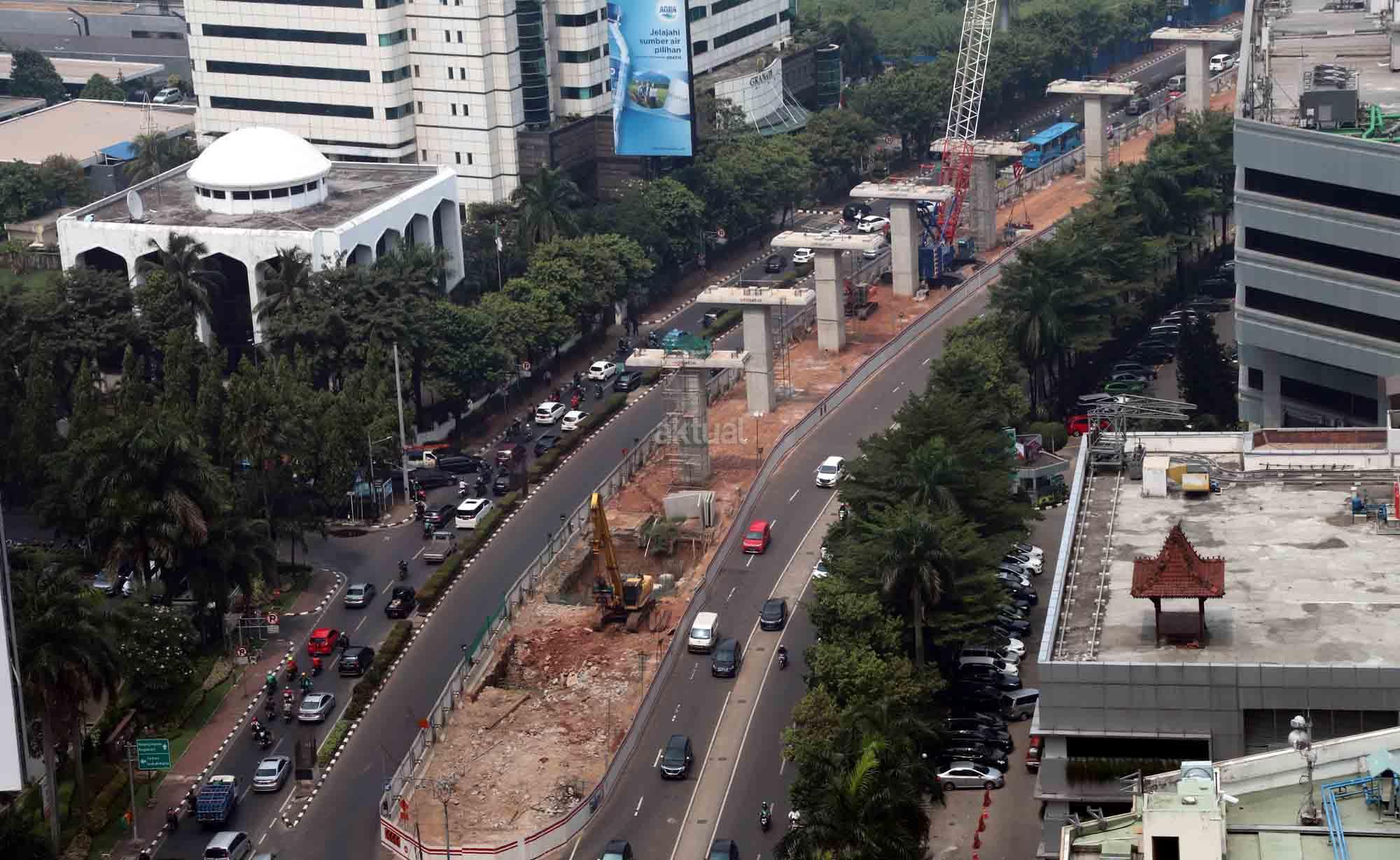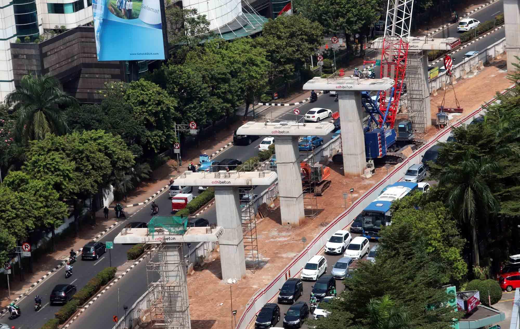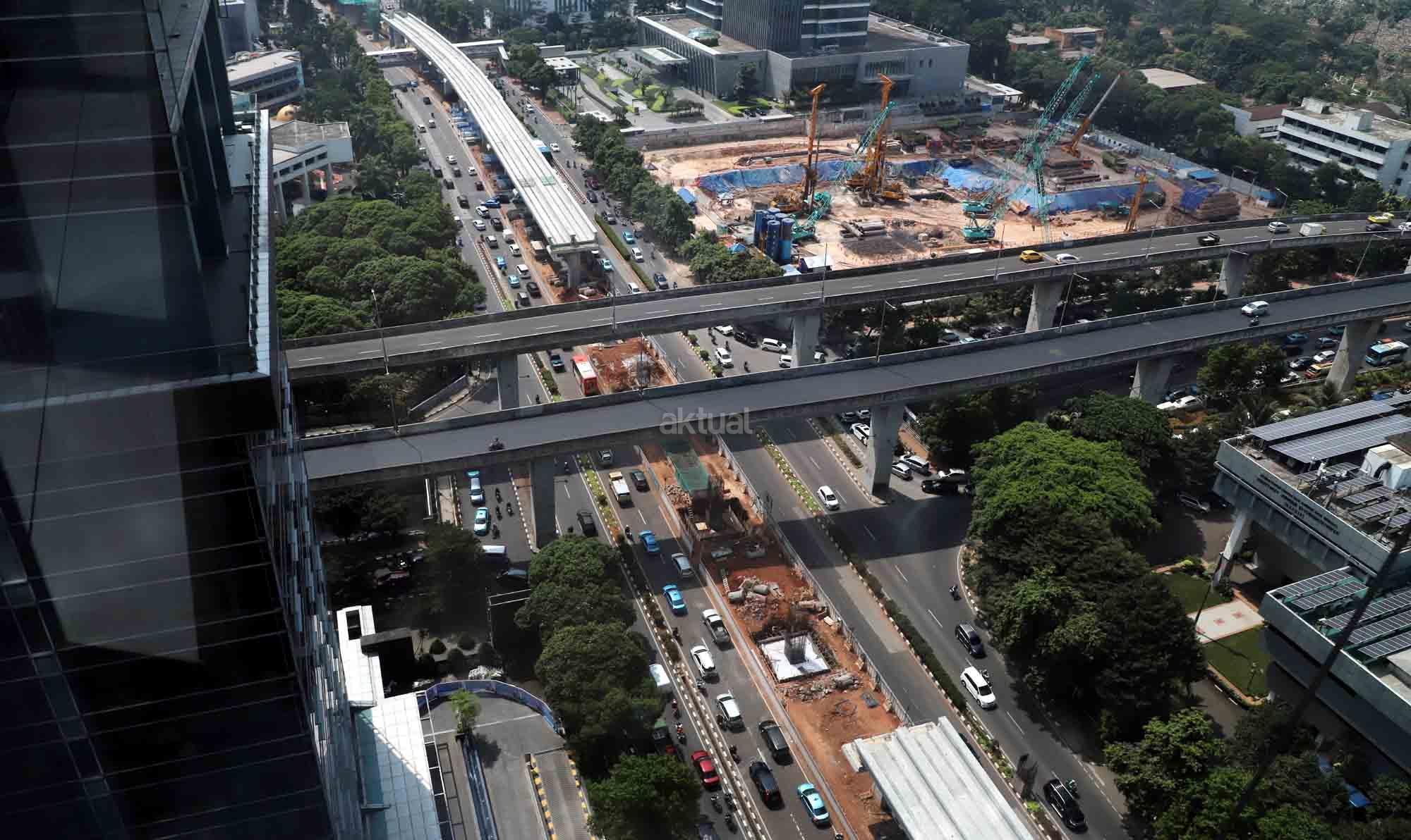 Suasana proyek pembangunan proyek light rail transit atau LRT di Jalan HR Rasuna Said, Jakarta, Senin (28/5/18). Progres pembangunan LRT Jakarta, Bogor, Depok, dan Bekasi (Jabodebek) tahap pertama sampai dengan awal Mei 2018 sudah mencapai 37,40 persen. Untuk trase Cawang-Cibubur mencapai 59 persen, Cawang-Kuningan-Dukuh Atas 21,20 persen, dan Cawang-Bekasi Timur 33,30 persen, Jadi progres LRT Jabodebek saat ini masih sesuai dengan target penyelesaian proyek pada 2019. AKTUAL/Tino Oktaviano