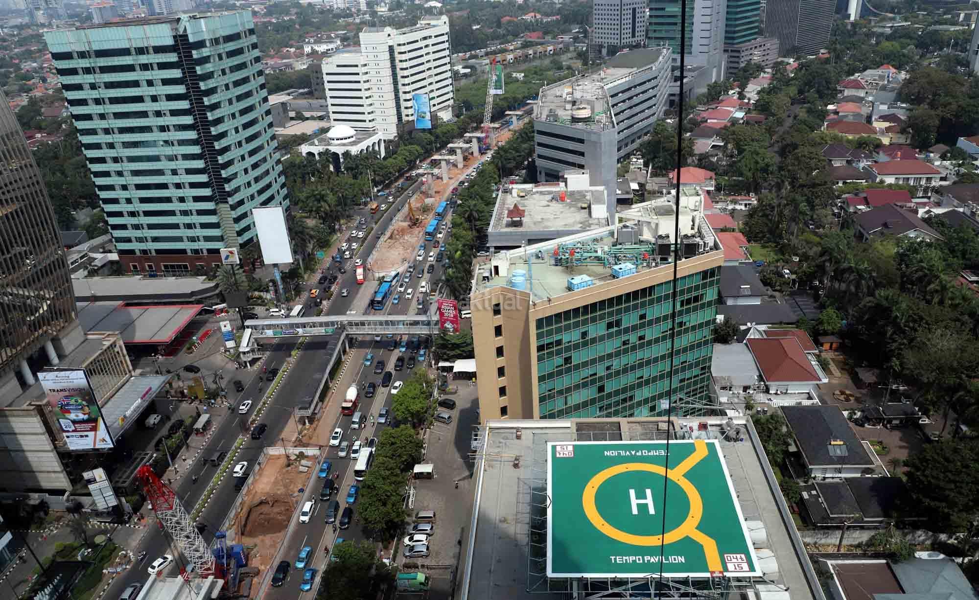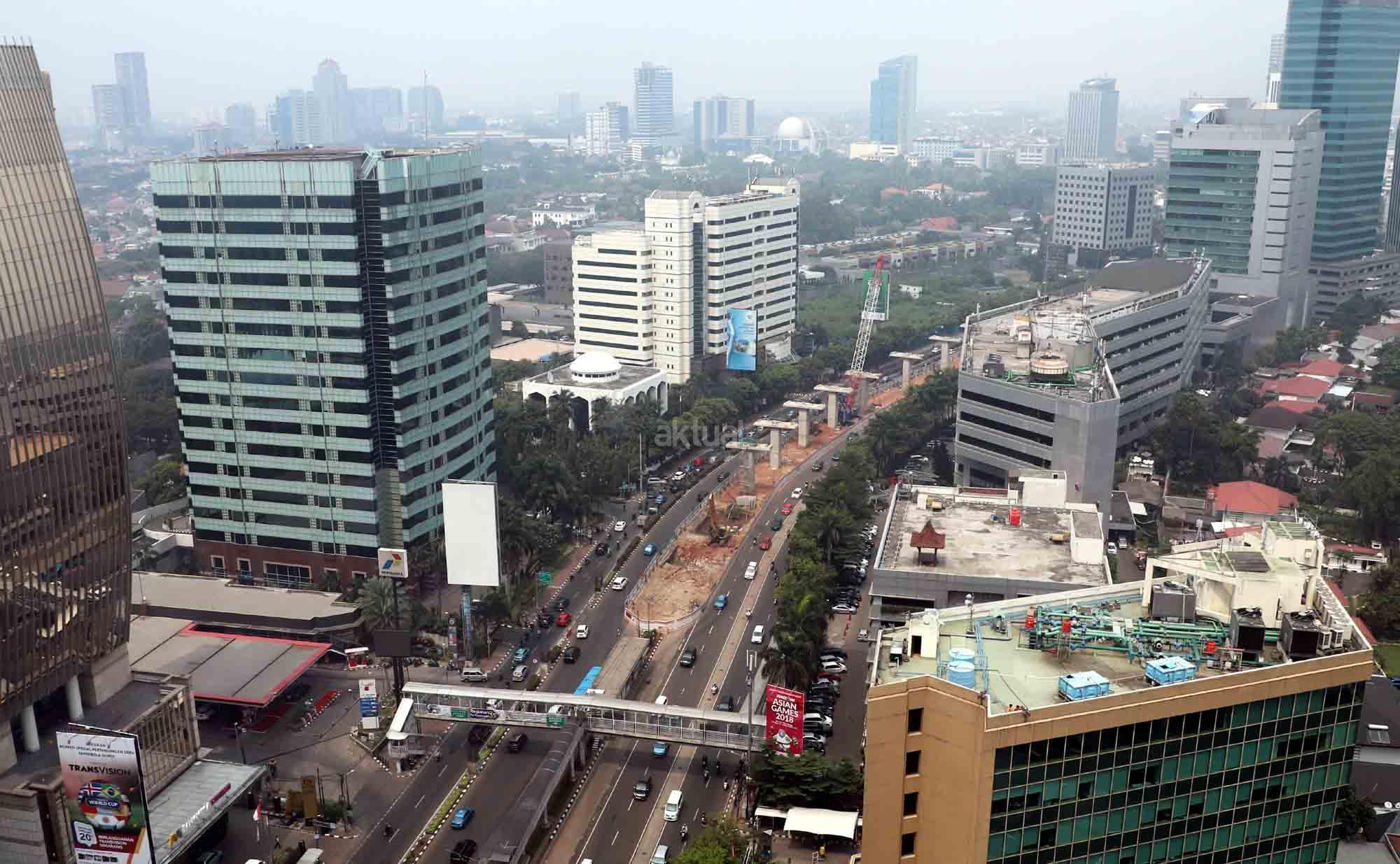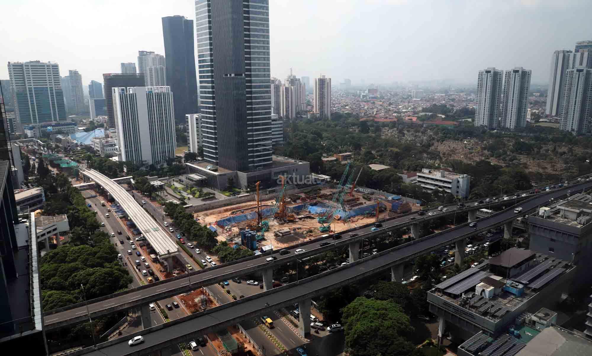 Suasana proyek pembangunan proyek light rail transit atau LRT di Jalan HR Rasuna Said, Jakarta, Senin (28/5/18). Progres pembangunan LRT Jakarta, Bogor, Depok, dan Bekasi (Jabodebek) tahap pertama sampai dengan awal Mei 2018 sudah mencapai 37,40 persen. Untuk trase Cawang-Cibubur mencapai 59 persen, Cawang-Kuningan-Dukuh Atas 21,20 persen, dan Cawang-Bekasi Timur 33,30 persen, Jadi progres LRT Jabodebek saat ini masih sesuai dengan target penyelesaian proyek pada 2019. AKTUAL/Tino Oktaviano
