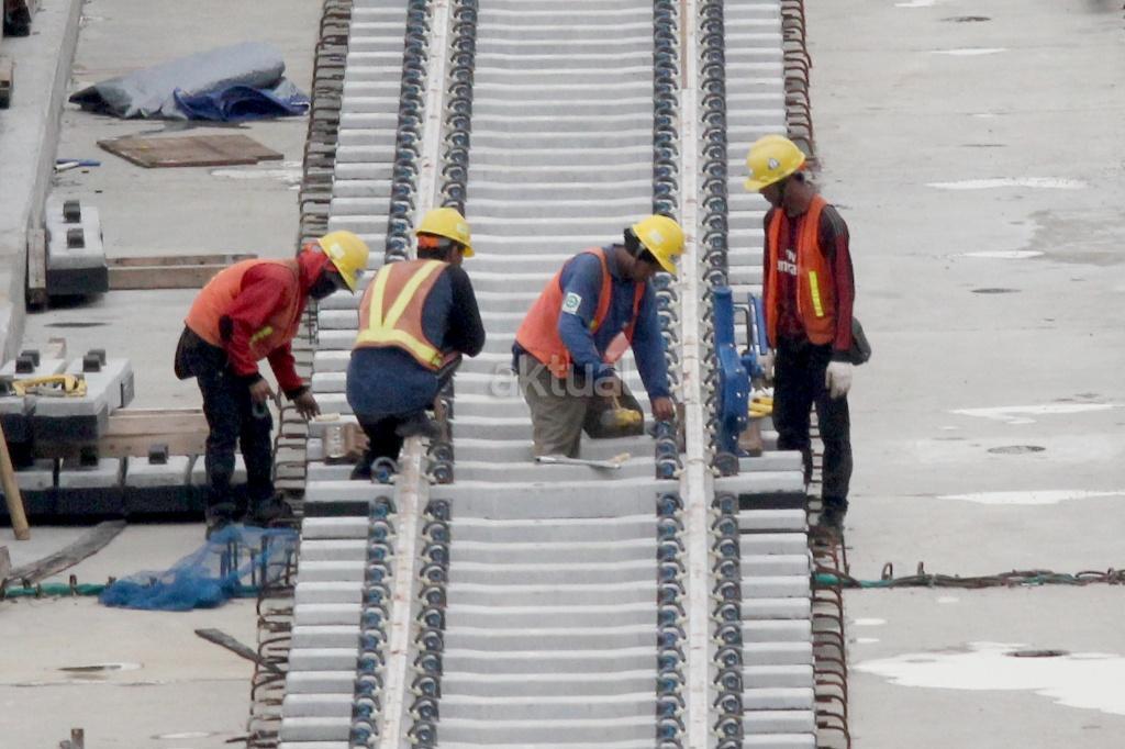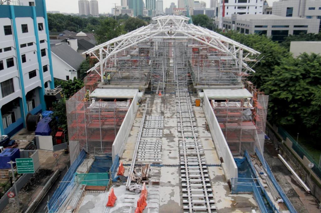 Pekerja menyelesaikan proyek pembangunan Stasiun MRT Sisingamangaraja di Jakarta, Selasa (5/12). Progres pembangunan proyek MRT Jakarta sudah mencapai angka 86,12 persen. Diyakini target penyelesaian hingga 90 persen di akhir tahun dapat tercapai. Percepatan pengerjaan proyek moda raya terpadu tersebut salah satunya dipicu oleh kedatangan rangkaian kereta MRT Jakarta yang dijadwalkan mulai menjalani berbagai uji coba di Jepang pada 18 Desember 2017. AKTUAL/Tino Oktaviano