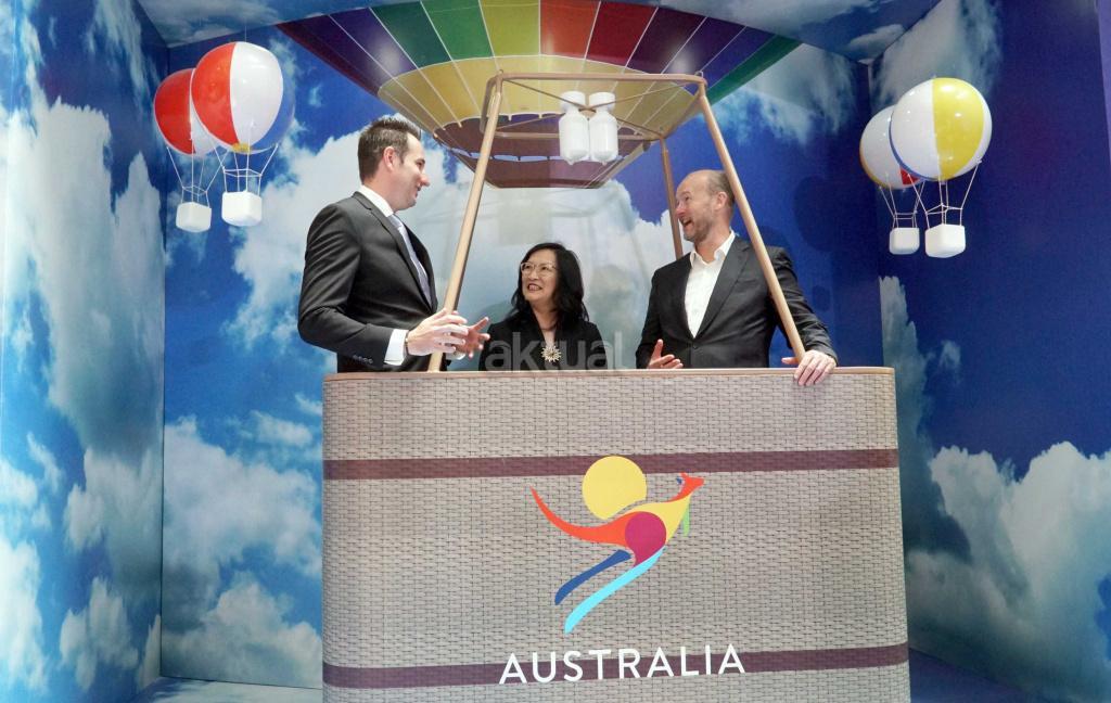 Executive Vice President Transaction Banking Business Development BCA Mira Wibowo (tengah) bersama Deputy Head of Mission of the Australian Embassy Allaster Cox (kanan) dan Country Manager Indonesia and Singapore Tourism Australia Scott Walter (kiri) usai pembukaan BCA Australia Travel Fair 2019 di Jakarta, Kamis (14/3/2019). AKTUAL/STR-Eko S Hilman