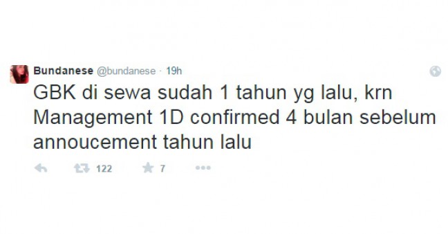 “GBK di sewa sudah 1 tahun yg lalu, krn Management 1D confirmed 4 bulan sebelum annoucement tahun lalu,” kicau Bundanese dalam akun twitternya @bundanese, Selasa (17/3).