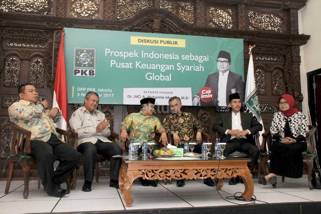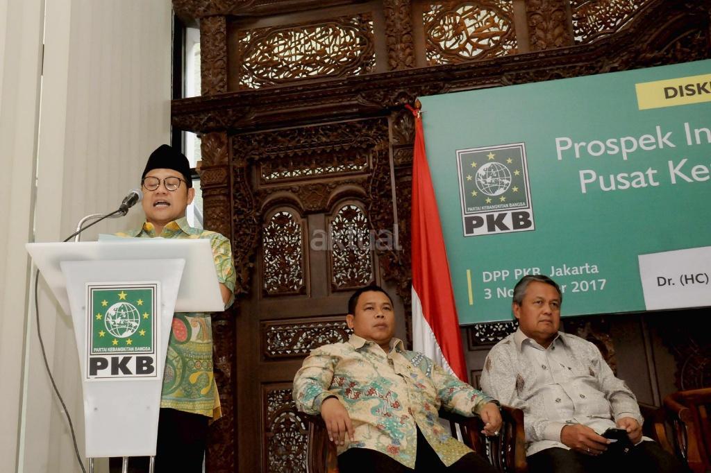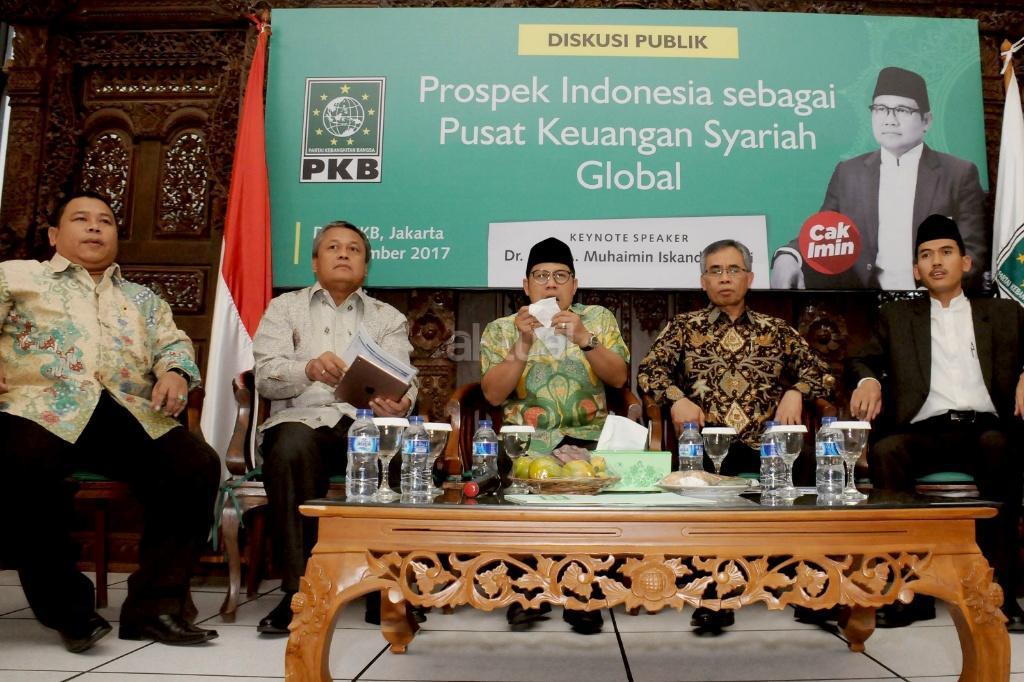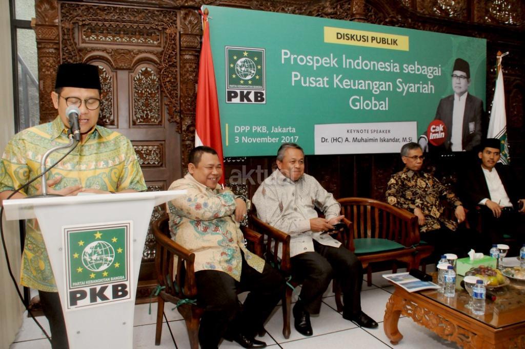 Ketua Umum PKB Muhaimin Iskandar saat berpidato dalam pembukaan diskusi tentang perkembangan keuangan syariah di Indonesia di kantor DPP PKB, Jakarta, Jumat (3/11/2017). Diskusi publik tersebut membahas mengenai perkembangan keuangan syariah di Indonesia dengan tema ‘Prospek Indonesia Sebagai Pusat Keuangan Syariah Global. AKTUAL/Munzir
