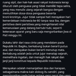 Ia juga menyinggung maraknya militerisasi ruang sipil dan tindak kekerasan aparat terhadap warga. Tragedi di Pati, Jawa Tengah, yang baru saja menelan korban jiwa menjadi salah satu sorotan. “Tidak sampai hati merayakan hari kemerdekaan ke-80 tanpa rasa iba, dengan peristiwa demi peristiwa yang mengkhianati nilai kemanusiaan, seperti kekerasan aparat yang baru saja mengorbankan jiwa di Pati minggu ini,” lanjutnya.