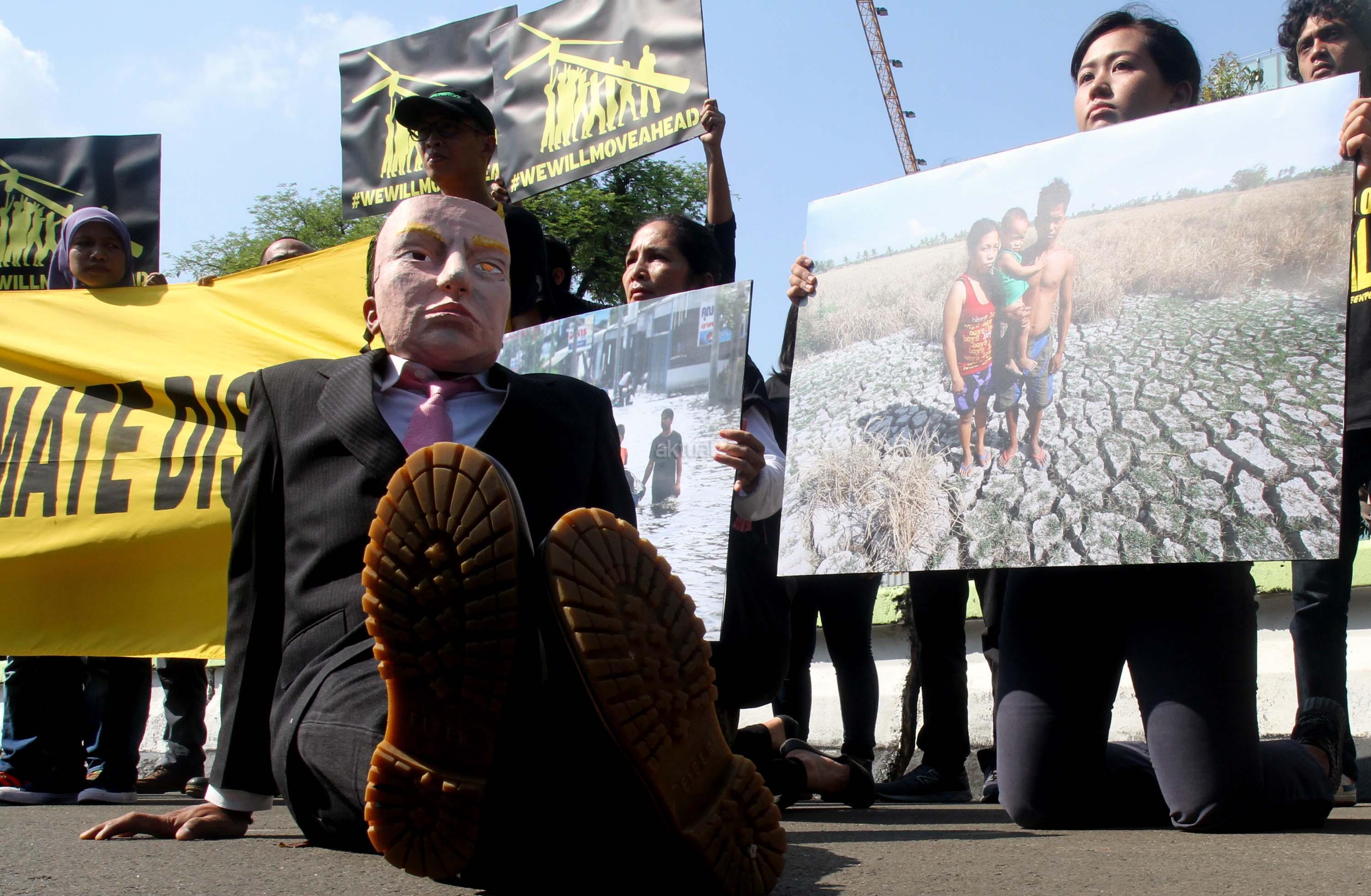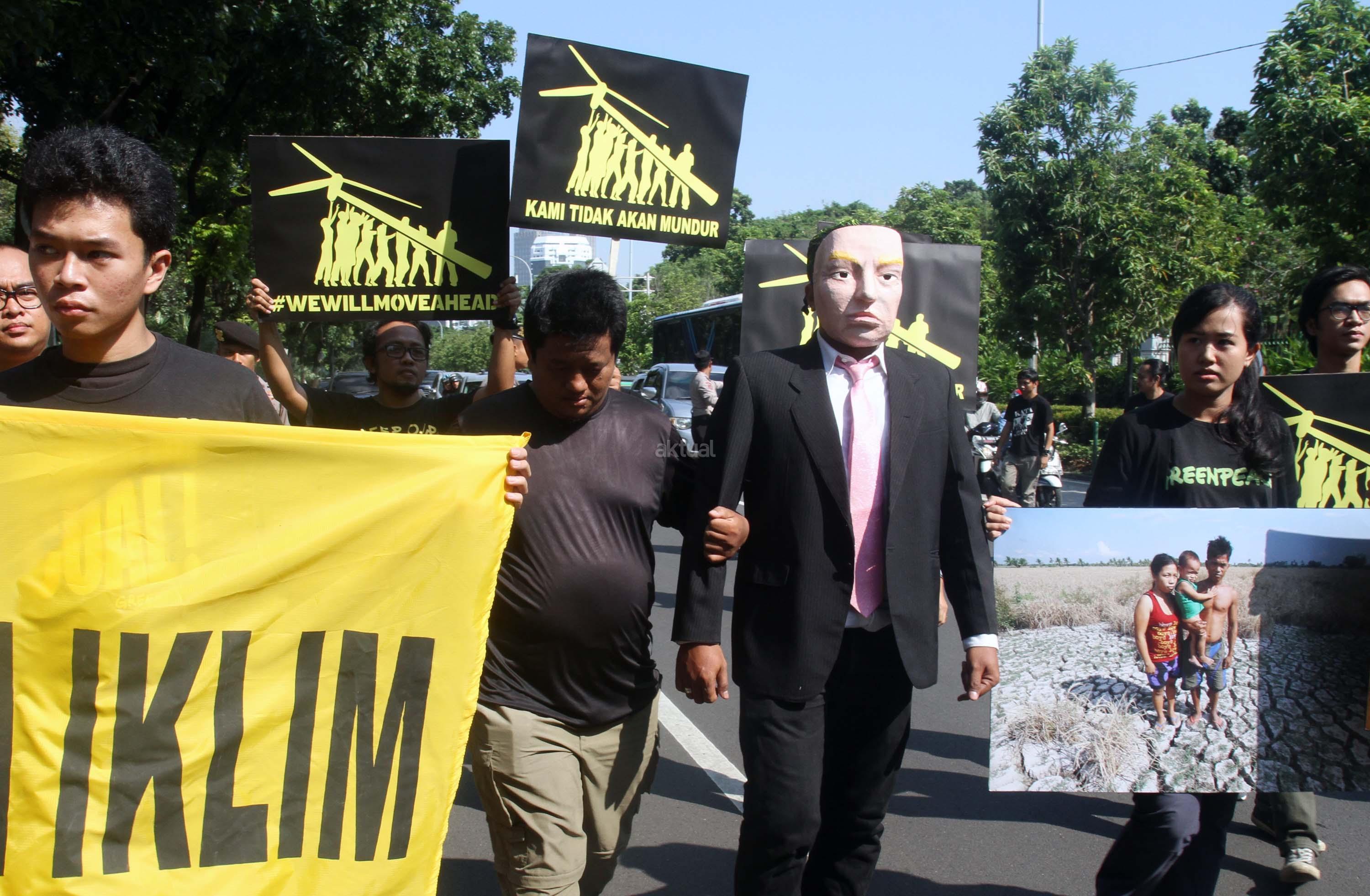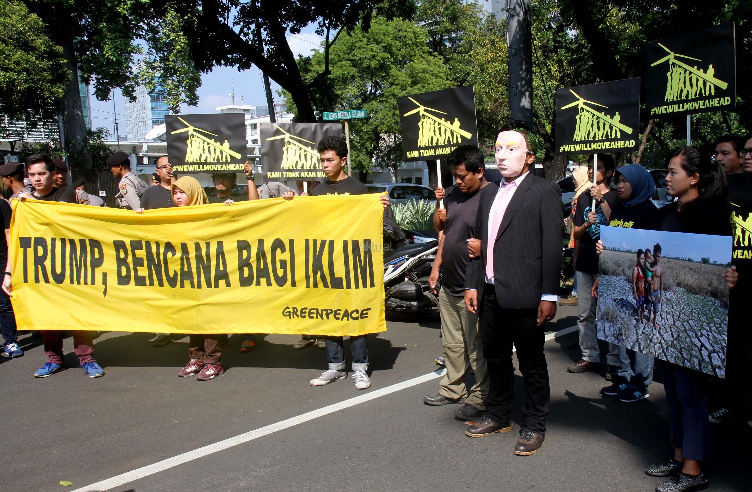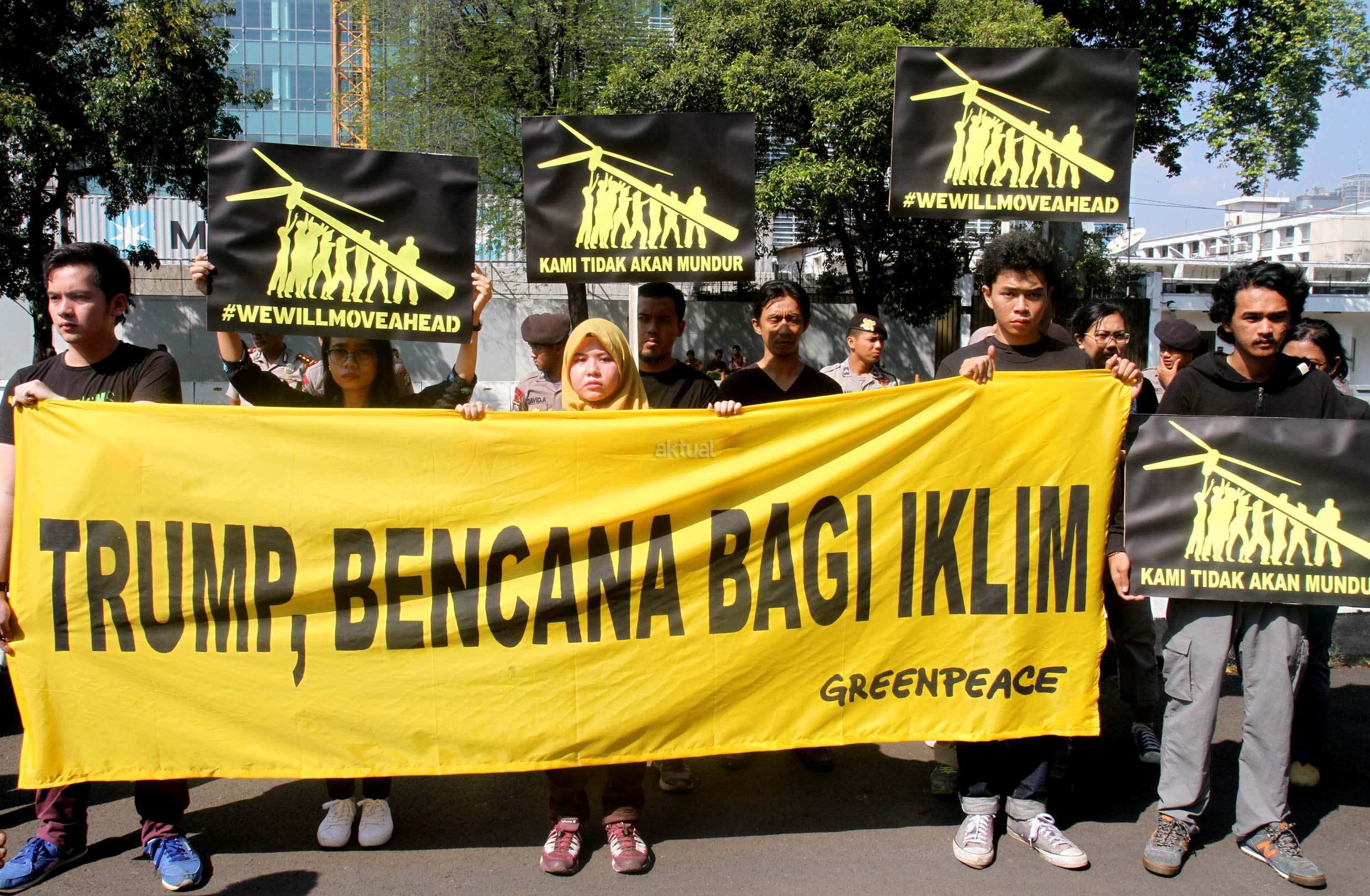 Aktivis Greenpeace Indonesia berunjuk rasa di depan Kedutaan Besar Amerika Serikat, Jakarta, Rabu (7/6/2017). Mereka memprotes kebijakan Presiden Donald Trump yang menyatakan Amerika Serikat mundur dari Perjanjian Paris.