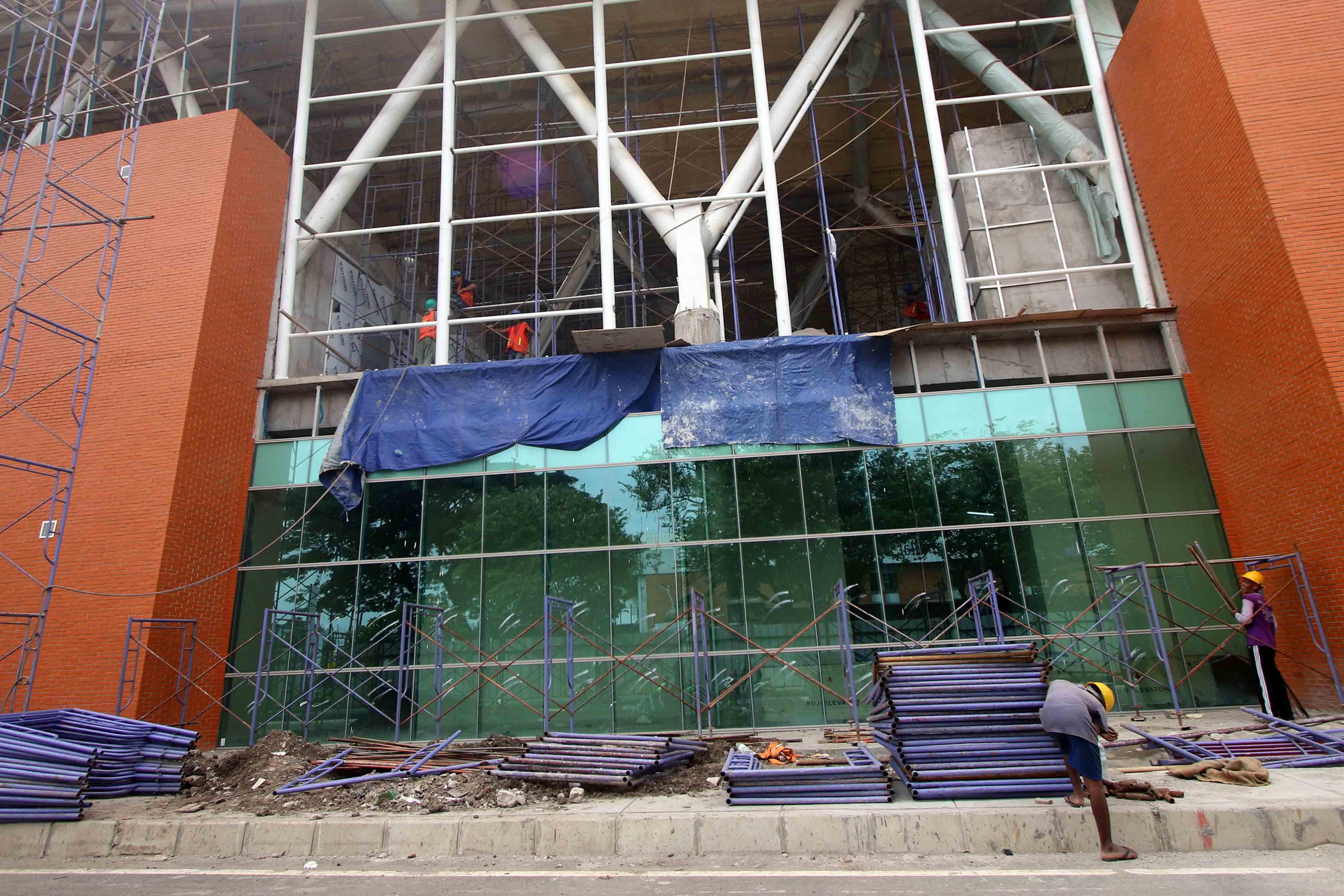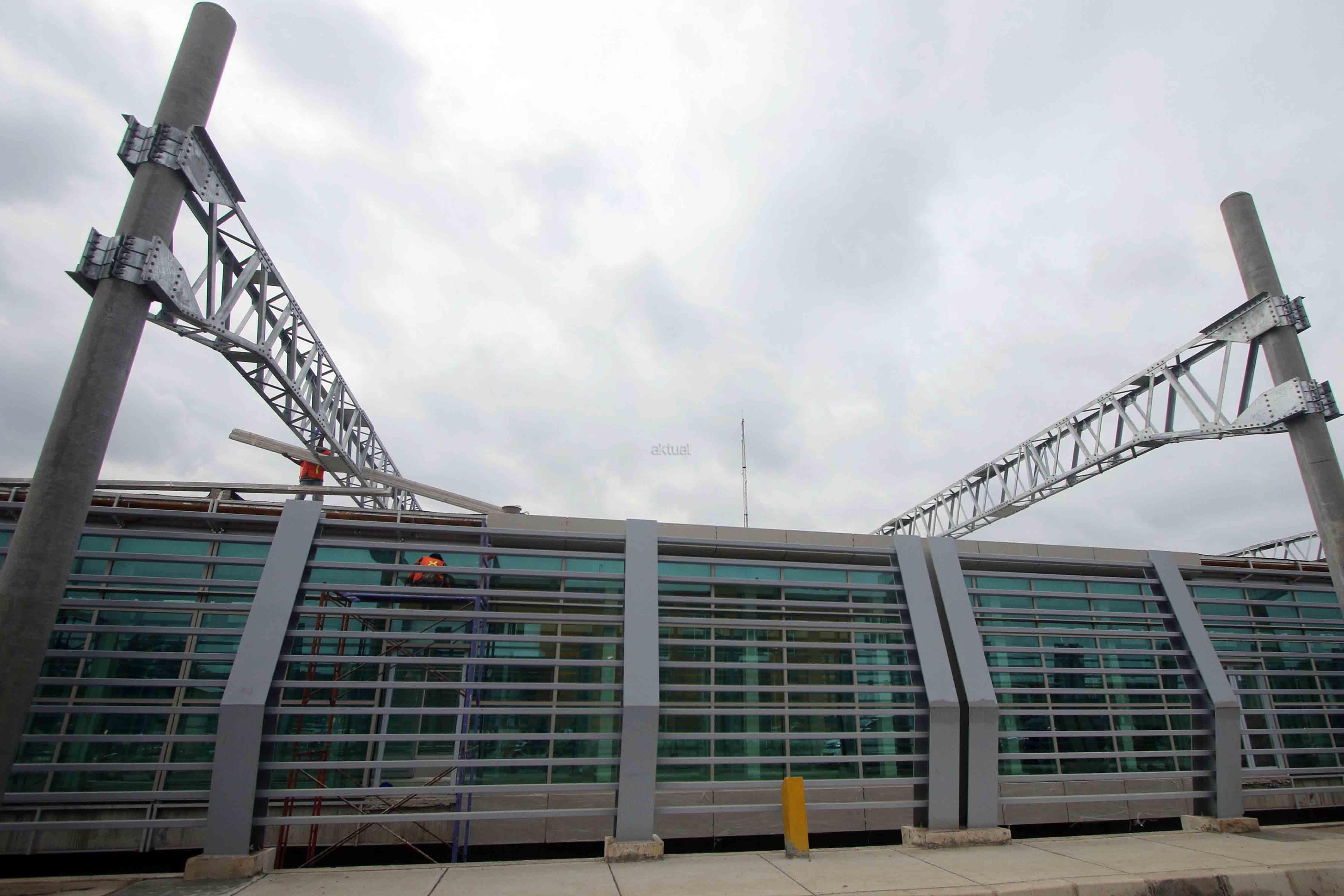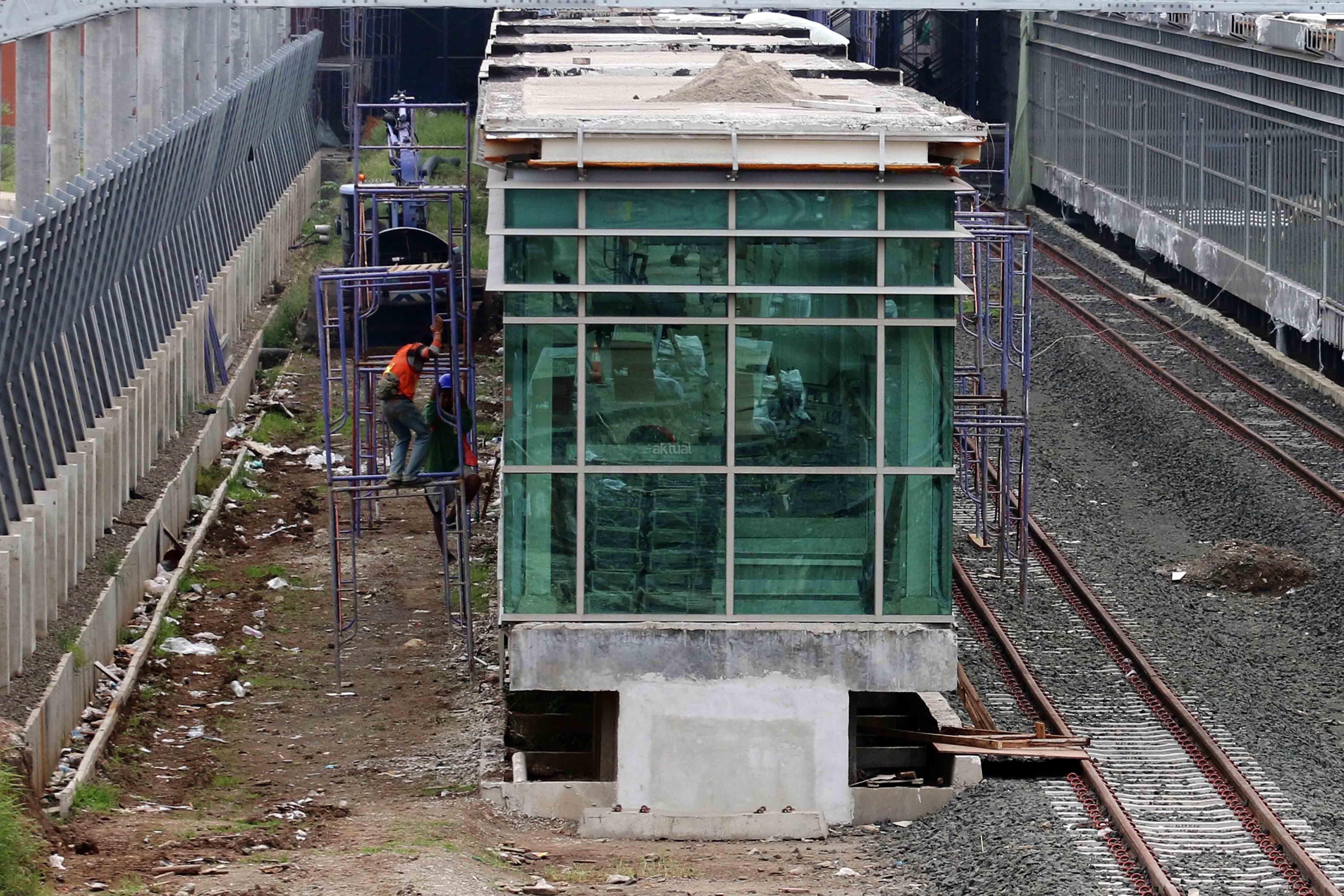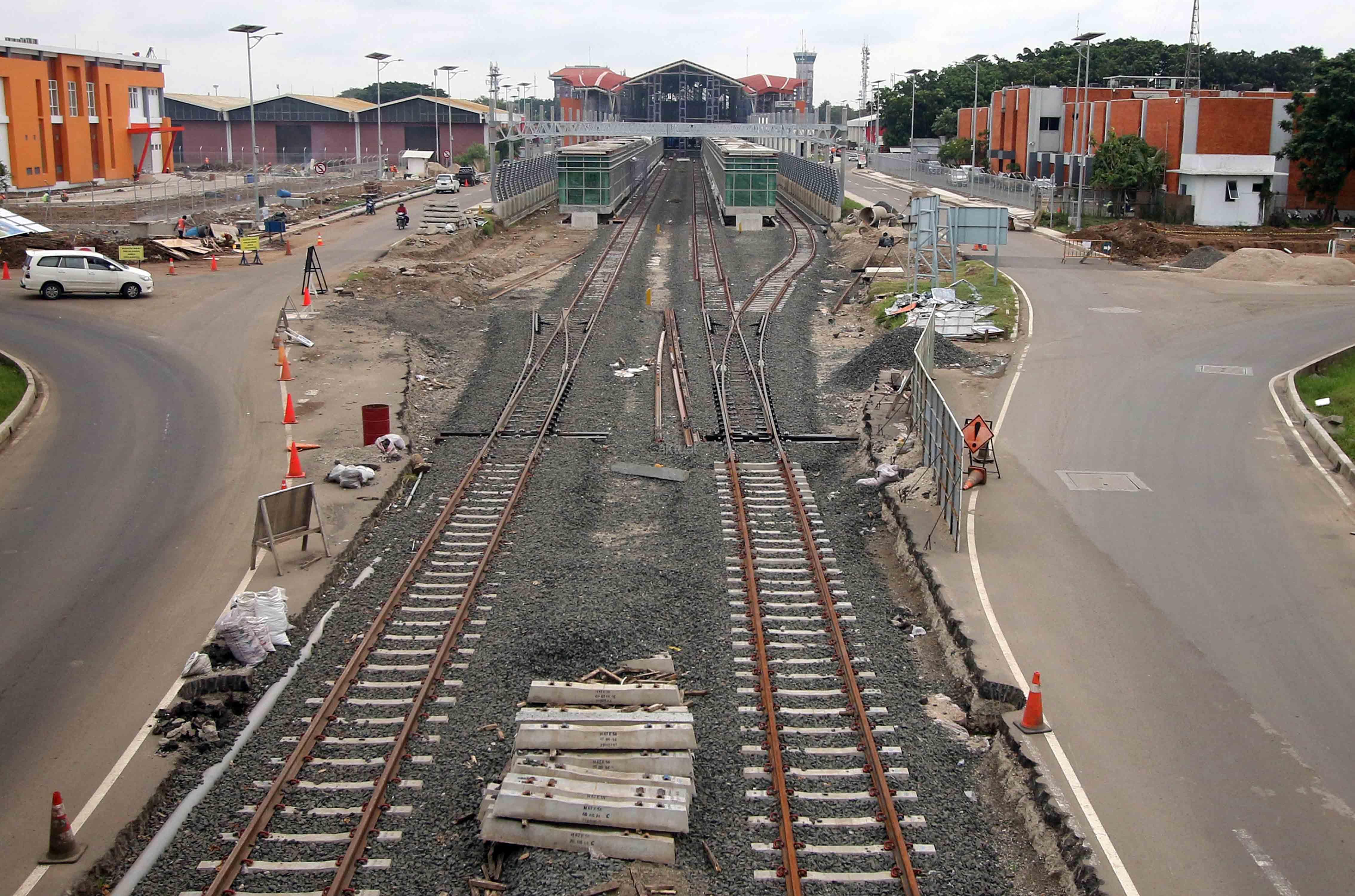 Pekerja menyelesaikan pembangunan Stasiun Kereta Api di Bandara Internasional Soekarno-Hatta, Tangerang, Banten, Jumat (10/2/2017). PT KAI optimistis pembangunan jalur kereta api Bandara Internasional Soekarno-Hatta akan rampung pada pertengahan 2017, dimana saat ini pencapaian pembangunan sudah mencapai di atas 80 persen, termasuk membangun proyek "double track". AKTUAL/Tino Oktaviano