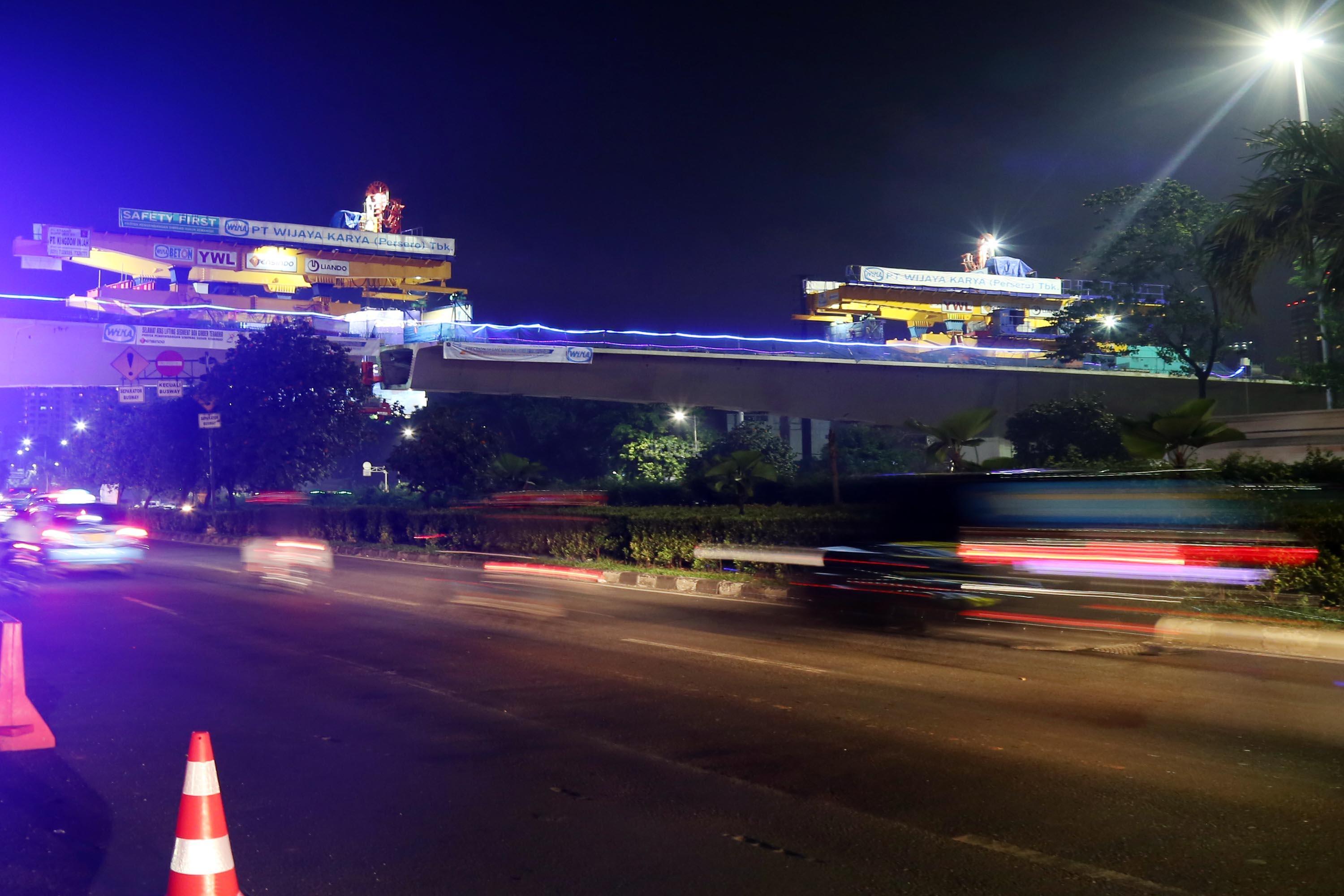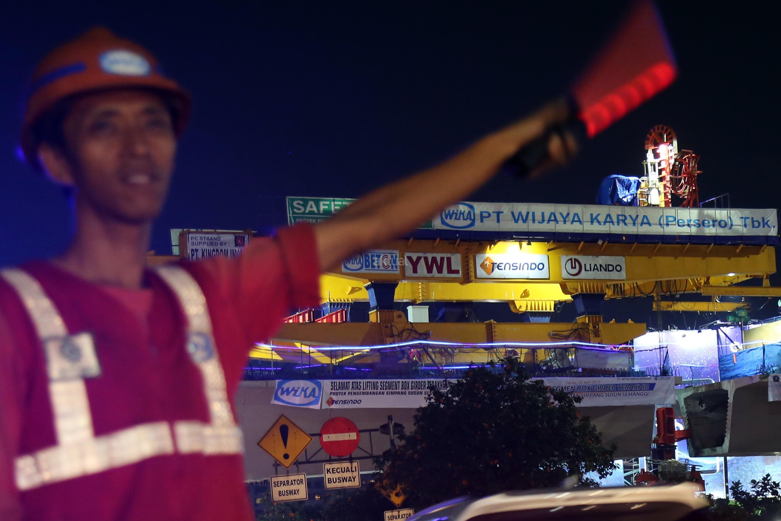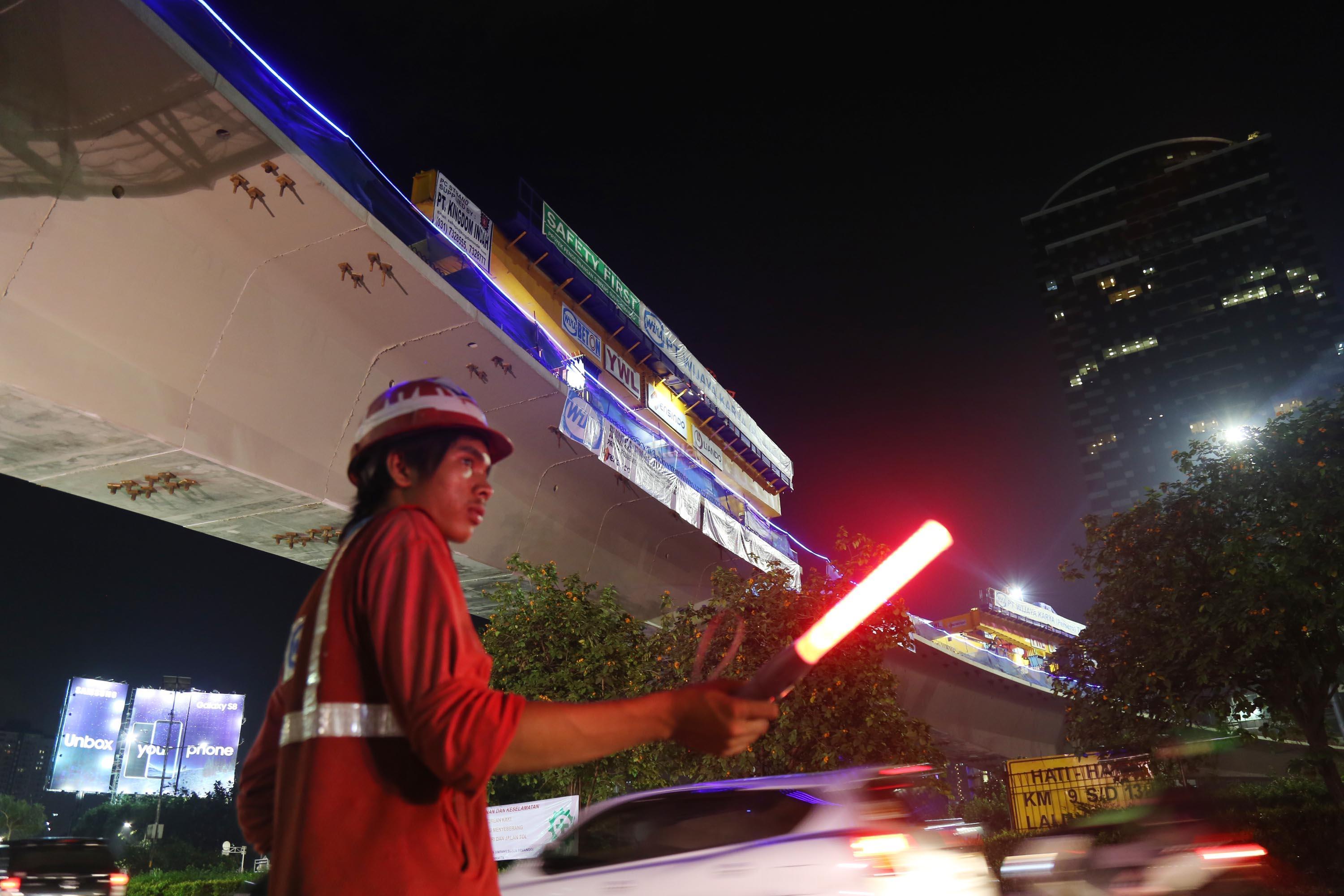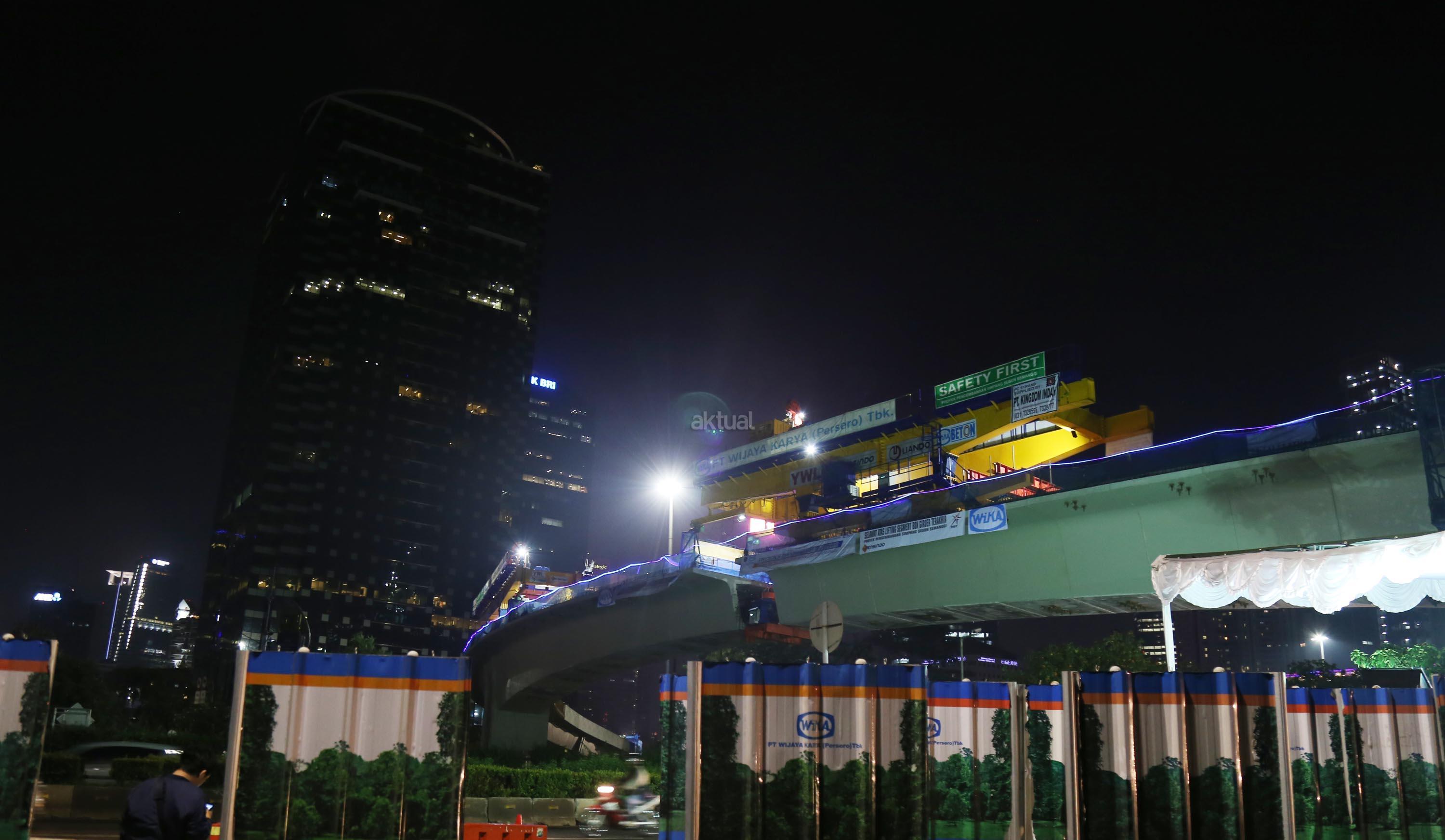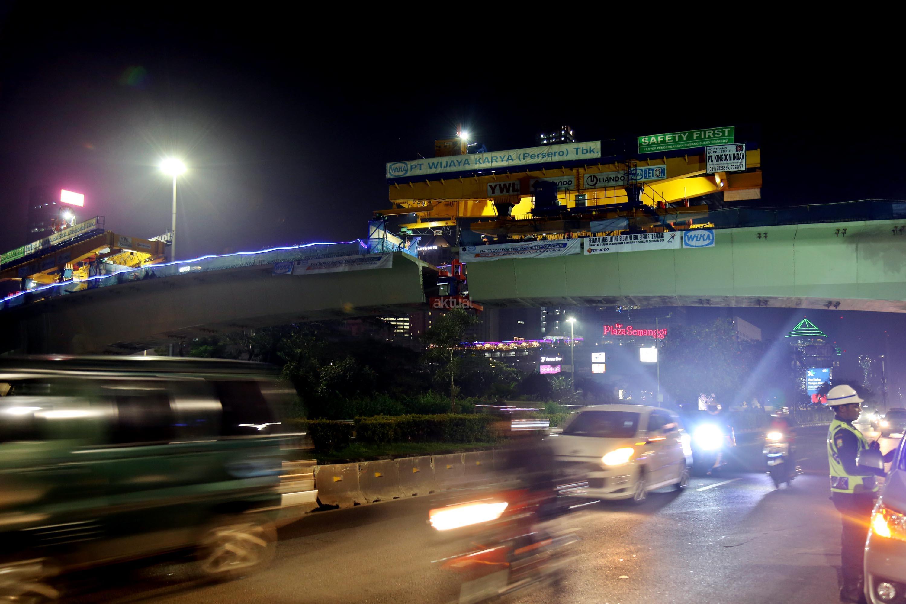 Pekerja mengatur kendaraan untuk berhati-hati saat dilakukan pemasangan box girder terakhir untuk jalan layang simpang susun Semanggi, di Jalan Gatot Subroto, Jakarta, Selasa (25/4) malam. Jalan layang sepanjang 1.622 meter tersebut sudah tersambung 100 persen sepenuhnya. Proyek ini selesai 1 bulan lebih cepat dari target. Diperkirakan jalan layang Simpang Semanggi rampung pada Juli 2017 sehingga bisa beroperasi pada 17 Agustus 2017 atau bertepatan dengan Hari Kemerdekaan RI. AKTUAL/Tino Oktaviano