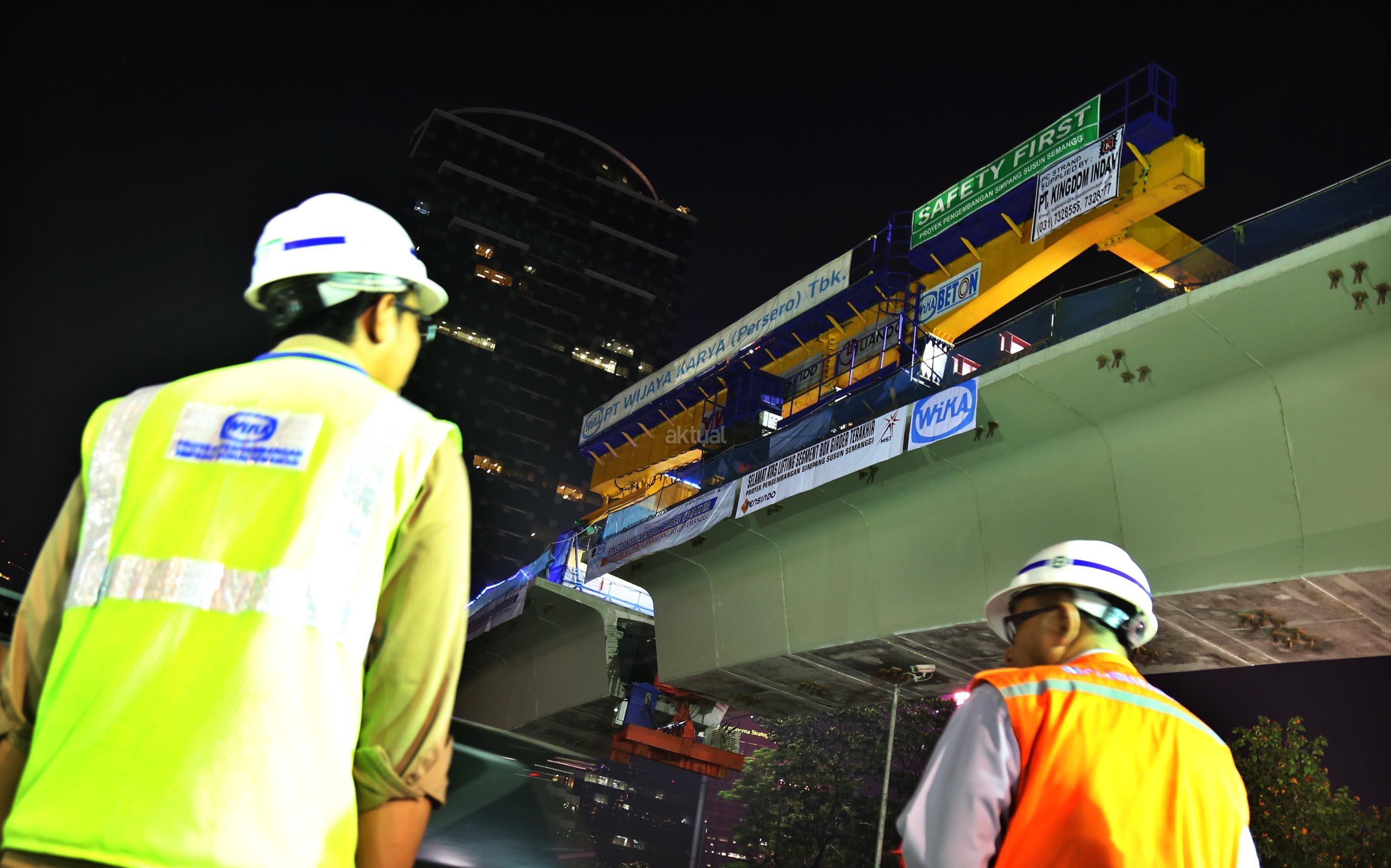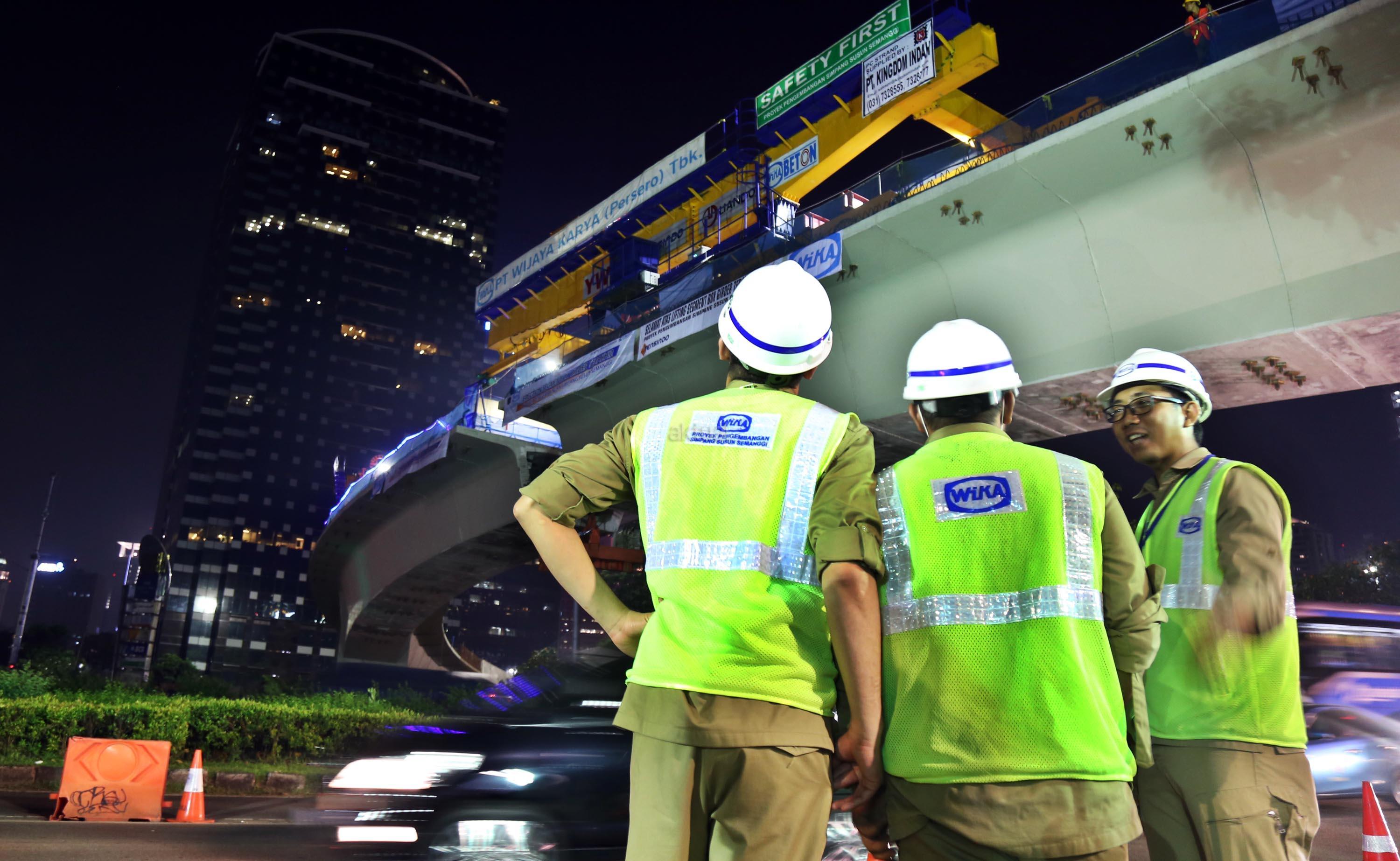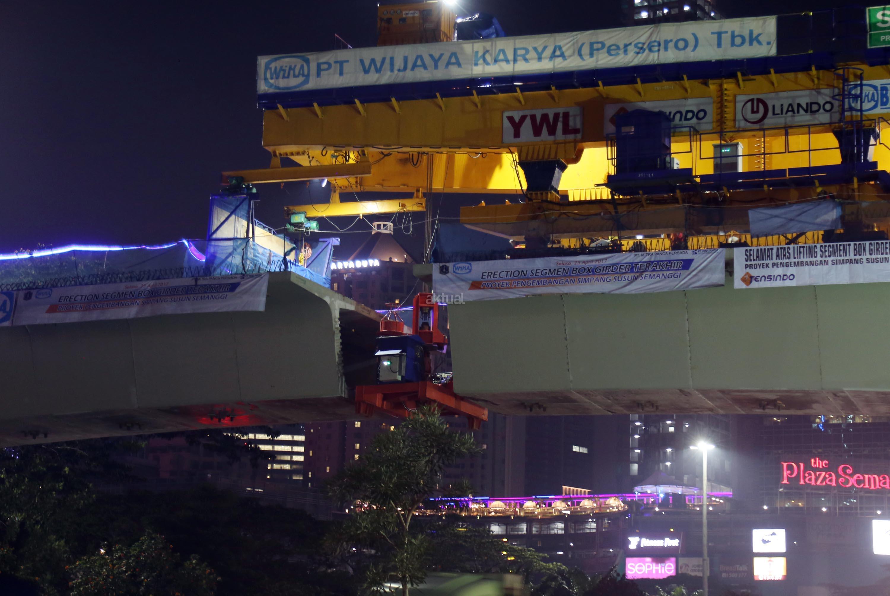 Pekerja memantau saat dilakukan pemasangan box girder terakhir untuk jalan layang simpang susun Semanggi, di Jalan Gatot Subroto, Jakarta, Selasa (25/4) malam. Jalan layang sepanjang 1.622 meter tersebut sudah tersambung 100 persen sepenuhnya. Proyek ini selesai 1 bulan lebih cepat dari target. Diperkirakan jalan layang Simpang Semanggi rampung pada Juli 2017 sehingga bisa beroperasi pada 17 Agustus 2017 atau bertepatan dengan Hari Kemerdekaan RI. AKTUAL/Tino Oktaviano