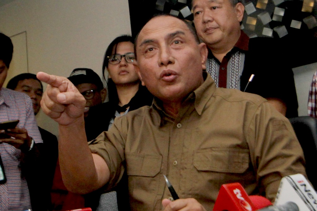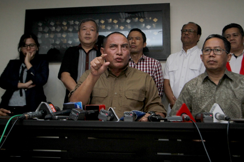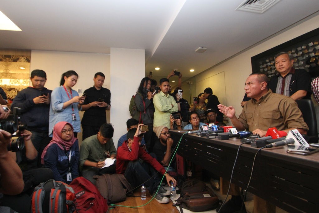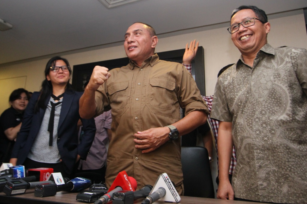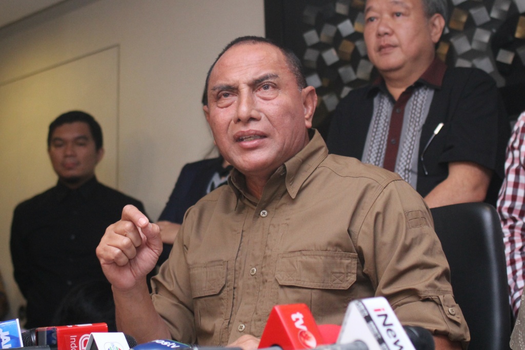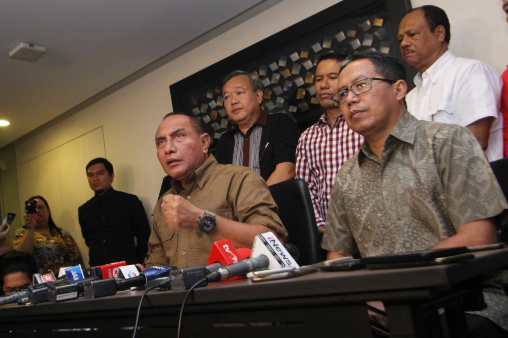 Ketua Umum PSSI Edy Rahmayadi (tengah) didampingi Wakil Ketua Umum PSSI Joko Driyono (kanan) memberikan keterangan kepada wartawan mengenai penghentian sementara kompetisi sepakbola Liga I di Jakarta, Selasa (25/9). PSSI memutuskan untuk menghentikan sementara kompetisi sepakbola Liga I sampai batas waktu yang tidak ditentukan menyusul tewasnya suporter Persija Jakarta jelang pertandingan antara Persib Bandung melawan Persija Jakarta di Stadion Gelora Bandung Lautan Api, Bandung pada Minggu (23/9) kemarin. AKTUAL/Tino Oktaviano