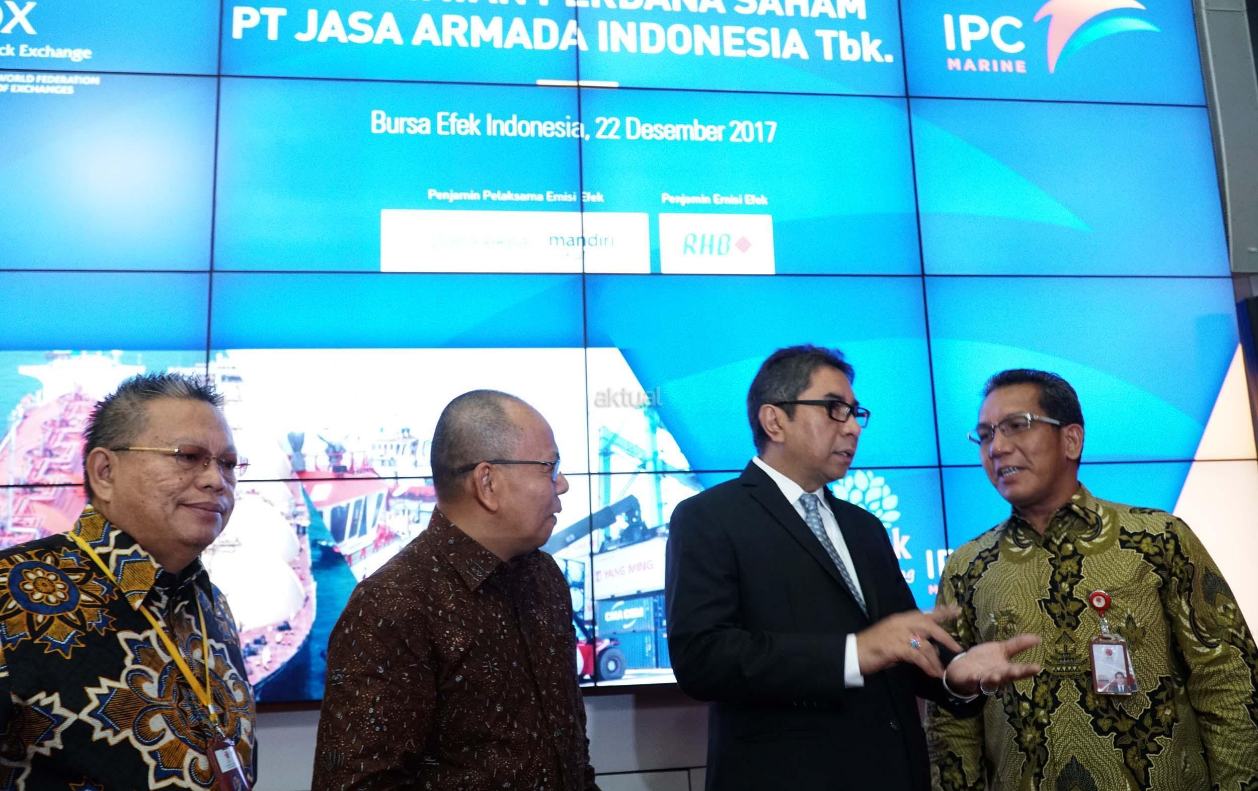 (dari kiri ke kanan) Direktur Keuangan dan SDM Bursa Efek Indonesia, Chaerudin Berlian, Direktur Utama PT Jasa Armada Indonesia Tbk, Dawam Atmosudiro Direktur Utama Pelindo II, Elvyn G Masassya, Direktur penilaian Perusahaan BEI, Samsul Hidayat berbincang disela pencatatan saham JAI di Jakarta, Jumat (22/12). JAI nak usaha PT Pelabuhan Indonesia II (persero) (IPC), telah resmi mencatatkan sahamnya di BEI,Perusahaan yang tercatat dengan kode saham "IPCM" ini telah melepas sejumlah 1,21 miliar lembar saham baru atau setara dengan 23% dari modal ditempatkan dan disetor.JAI resmi menjai emiten ke 36 yang melantai di Bursa pada tahun 2017. JAI bergerak di bidang pemantauan dan penundaan kapal di Pelabuhan milik Negra,terminal swasta (TUKS) dan terminal khusus lepas pantai (oil & Gas Ship to Ship/STS) dibidang usaha sejenis,JAI adalah perusahaan pertama melakukan IPO. AKTUAL/Eko S Hilman