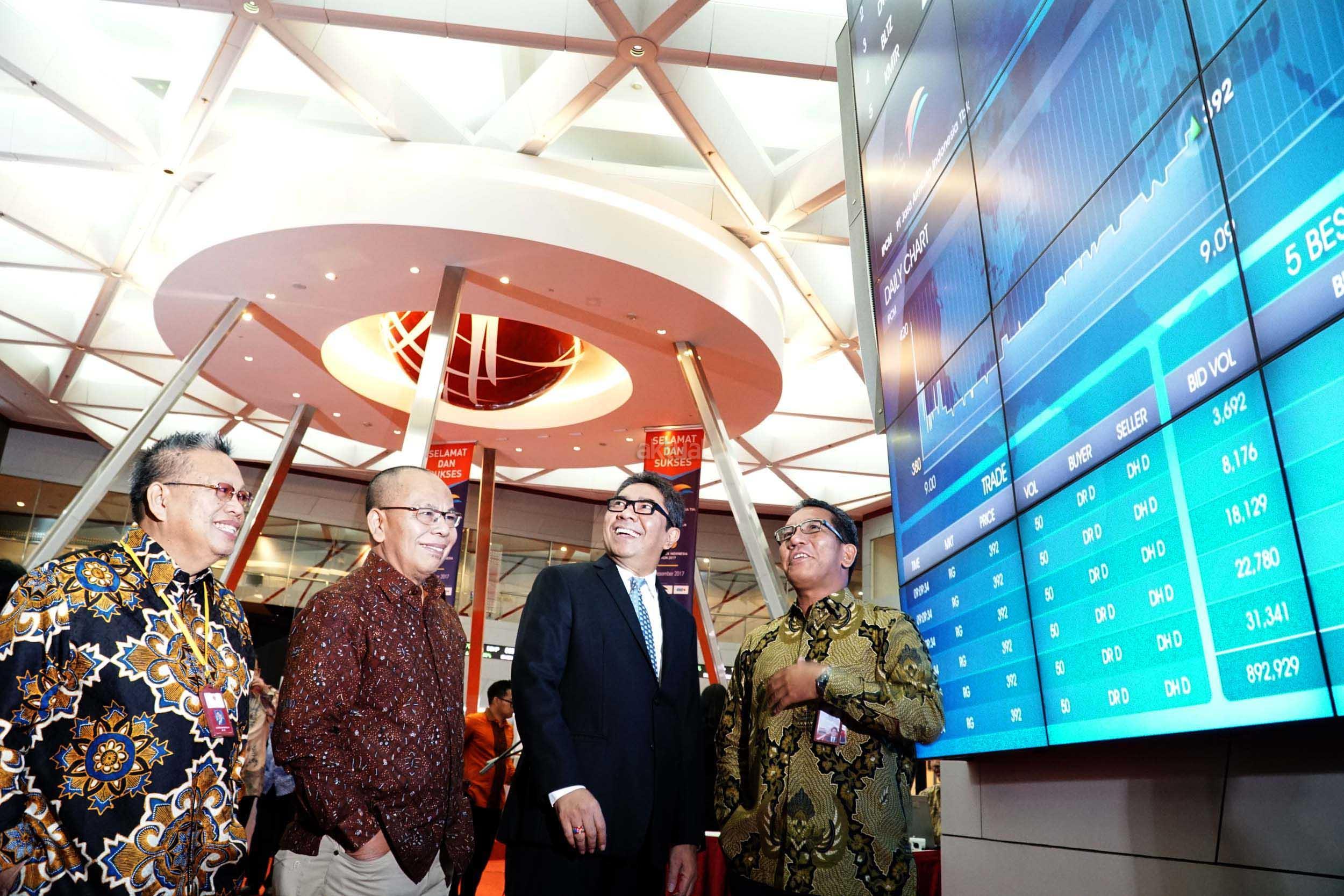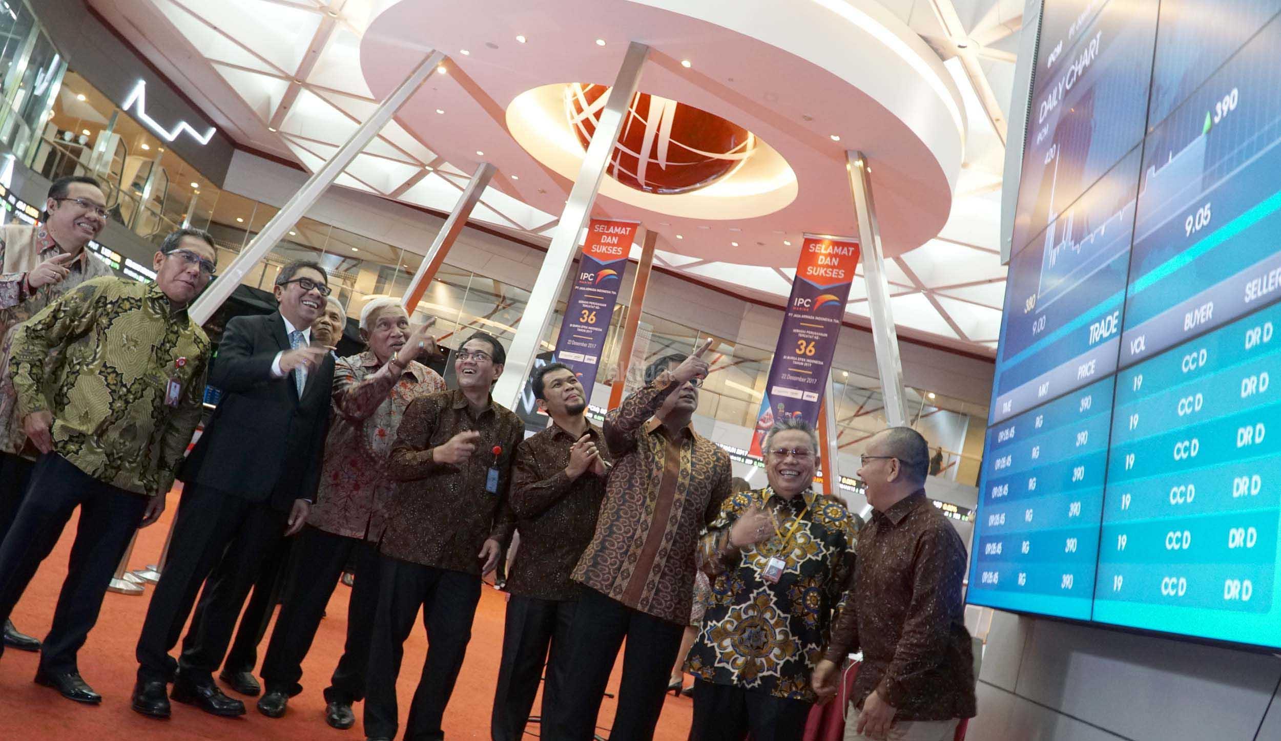Direktur Utama Pelindo II, Elvyn G Masassya (ketiga dari kiri), Direktur penilaian Perusahaan BEI, Samsul Hidayat (kedua dari kiri),Direktur Utama PT Jasa Armada Indonesia Tbk, Dawam Atmosudiro (kanan) dan jajaran direksi JAI dan BEI lainnya memantau pergerakan saham disela pencatatan saham JAI di Jakarta, Jumat (22/12). JAI nak usaha PT Pelabuhan Indonesia II (persero) (IPC), telah resmi mencatatkan sahamnya di BEI,Perusahaan yang tercatat dengan kode saham “IPCM” ini telah melepas sejumlah 1,21 miliar lembar saham baru atau setara dengan 23% dari modal ditempatkan dan disetor.JAI resmi menjai emiten ke 36 yang melantai di Bursa pada tahun 2017. JAI bergerak di bidang pemantauan dan penundaan kapal di Pelabuhan milik Negra,terminal swasta (TUKS) dan terminal khusus lepas pantai (oil & Gas Ship to Ship/STS) dibidang usaha sejenis,JAI adalah perusahaan pertama melakukan IPO. AKTUAL/Eko S Hilman