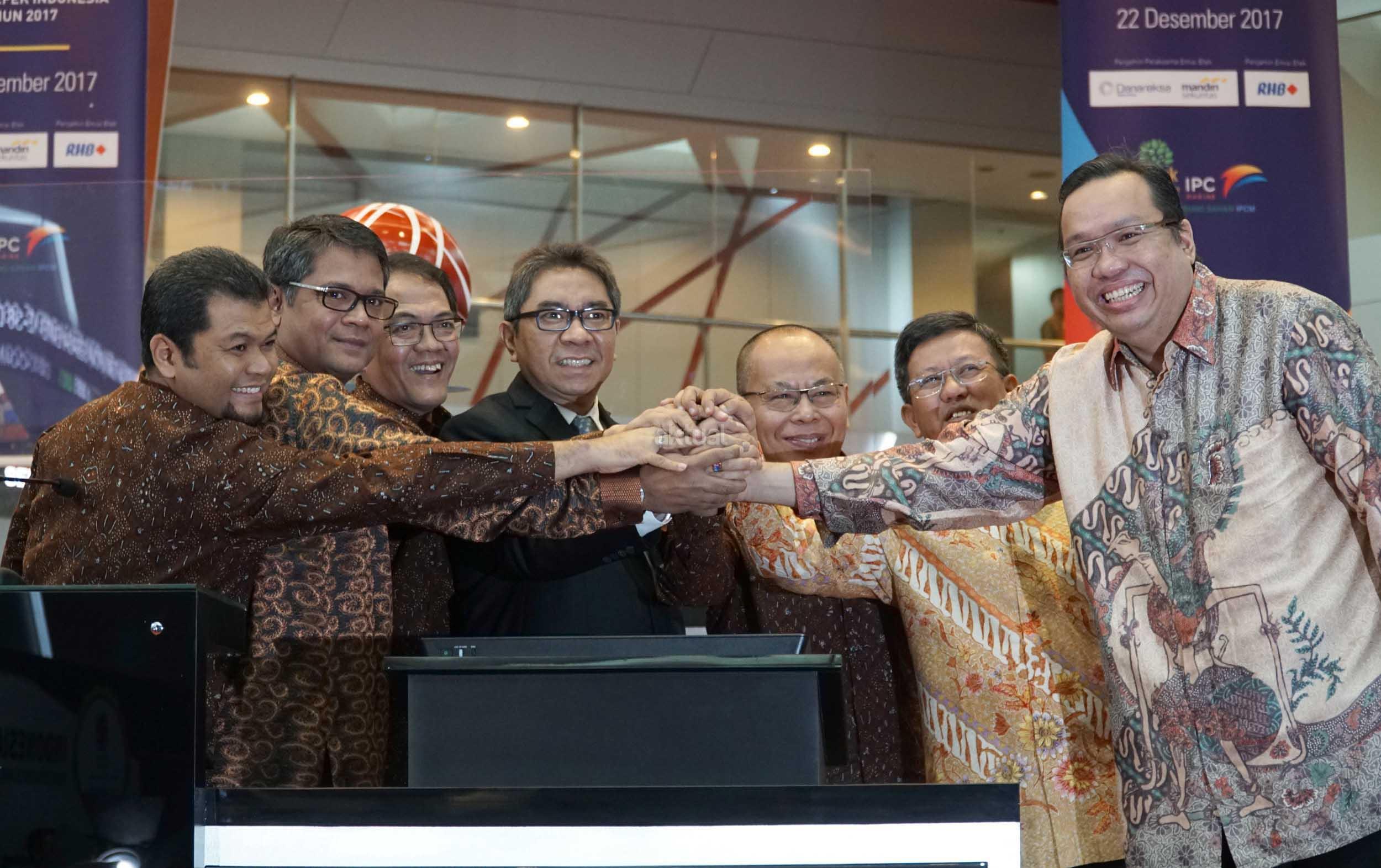 Direktur Utama Pelindo II, Elvyn G Masassya ( tengah) bersama Jajaran Direksi PT Jasa Armada Indonesia Tbk saat pencatatan saham JAI di Jakarta, Jumat (22/12). JAI nak usaha PT Pelabuhan Indonesia II (persero) (IPC), telah resmi mencatatkan sahamnya di BEI,Perusahaan yang tercatat dengan kode saham “IPCM” ini telah melepas sejumlah 1,21 miliar lembar saham baru atau setara dengan 23% dari modal ditempatkan dan disetor.JAI resmi menjai emiten ke 36 yang melantai di Bursa pada tahun 2017. JAI bergerak di bidang pemantauan dan penundaan kapal di Pelabuhan milik Negra,terminal swasta (TUKS) dan terminal khusus lepas pantai (oil & Gas Ship to Ship/STS) dibidang usaha sejenis,JAI adalah perusahaan pertama melakukan IPO. AKTUAL/Eko S Hilman