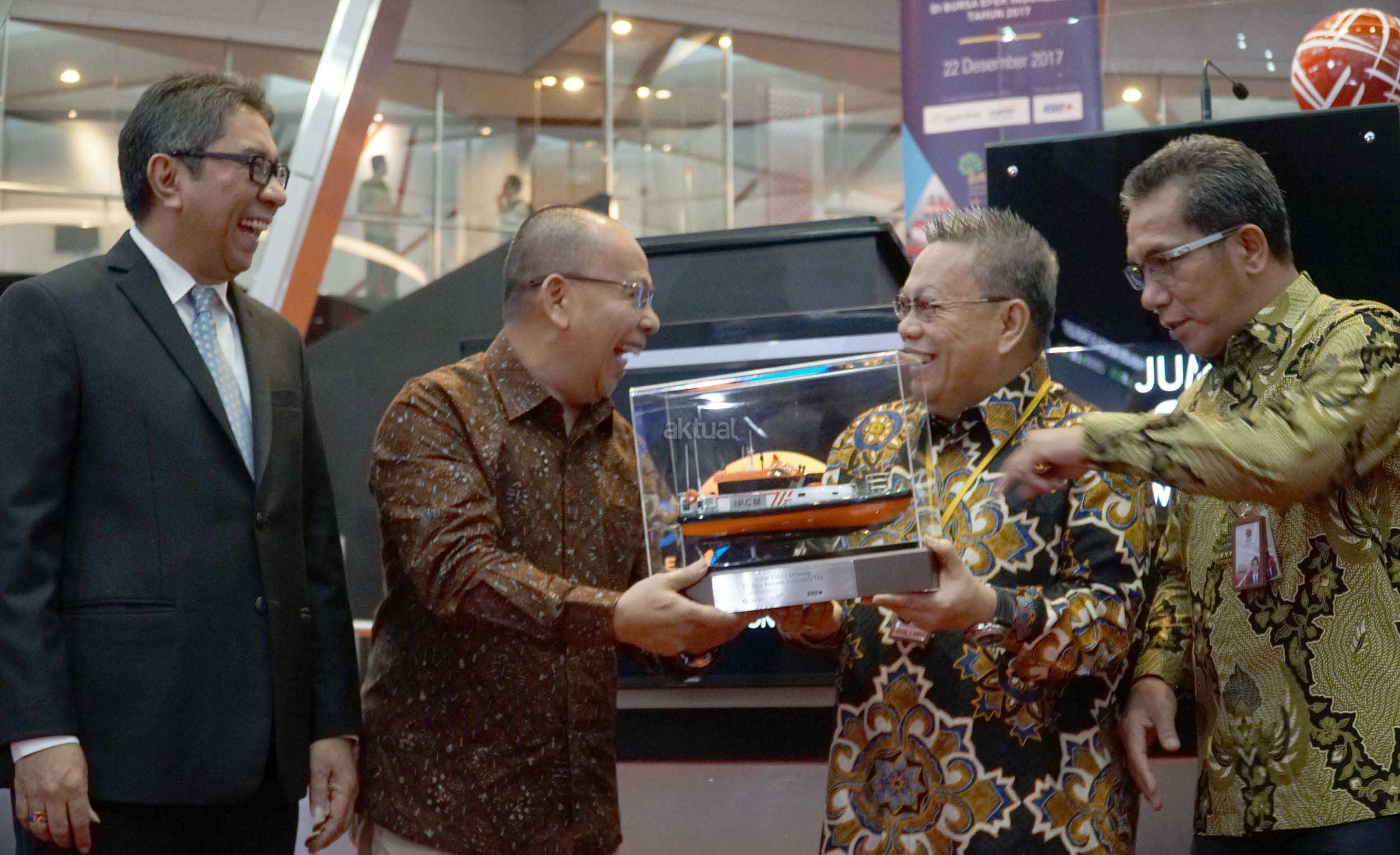 Direktur Utama Pelindo II, Elvyn G Masassya ( kiri), Direktur penilaian Perusahaan BEI, Samsul Hidayat (kanan),Direktur Utama PT Jasa Armada Indonesia Tbk, Dawam Atmosudiro (kedua dari kiri),Direktur Keuangan dan SDM Bursa Efek Indonesia, Chaerudin Berlian (kedua dari kanan) bertukar cinderamata disela pencatatan saham JAI di Jakarta, Jumat (22/12). JAI nak usaha PT Pelabuhan Indonesia II (persero) (IPC), telah resmi mencatatkan sahamnya di BEI,Perusahaan yang tercatat dengan kode saham “IPCM” ini telah melepas sejumlah 1,21 miliar lembar saham baru atau setara dengan 23% dari modal ditempatkan dan disetor.JAI resmi menjai emiten ke 36 yang melantai di Bursa pada tahun 2017. JAI bergerak di bidang pemantauan dan penundaan kapal di Pelabuhan milik Negra,terminal swasta (TUKS) dan terminal khusus lepas pantai (oil & Gas Ship to Ship/STS) dibidang usaha sejenis,JAI adalah perusahaan pertama melakukan IPO. AKTUAL/Eko S Hilman
