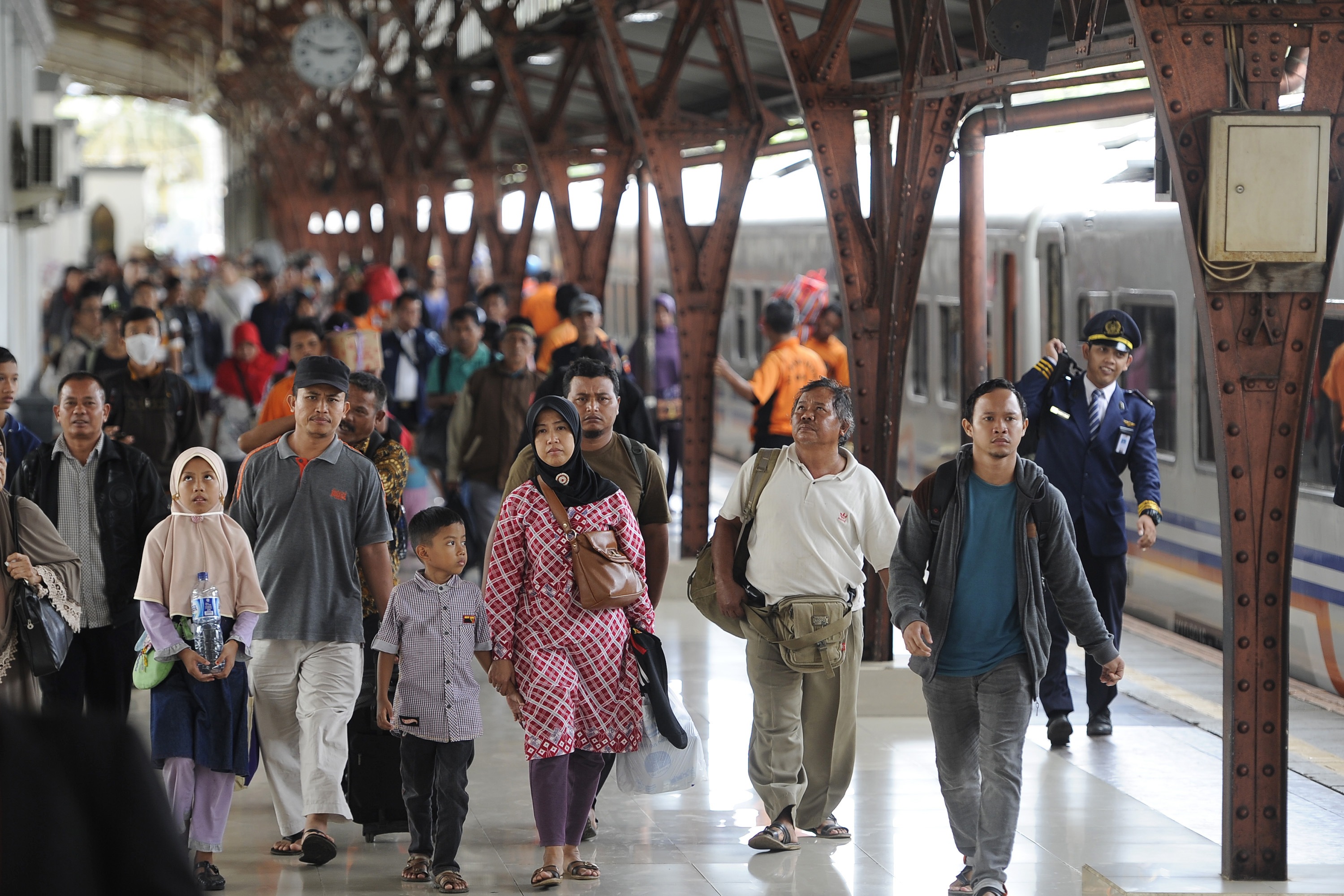Penumpang kereta Sawunggalih dari Kutoarjo, Jawa Tengah tiba di Stasiun Pasar Senen, Jakarta, Sabtu (30/4). PT Kereta Api Indonesia menyediakan 38 perjalanan kereta api tambahan atau 22.360 kursi per hari untuk mudik Lebaran yang penjualannya dimulai pada Sabtu (30/4). ANTARA FOTO/Sigid Kurniawan/16.