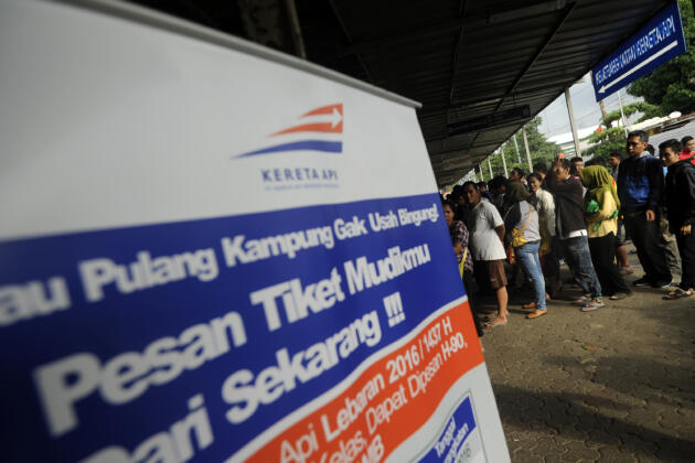 Calon penumpang kereta api antre mencetak tiket secara mandiri di Stasiun Pasar Senen, Jakarta, Sabtu (30/4). PT Kereta Api Indonesia menyediakan 38 perjalanan kereta api tambahan atau 22.360 kursi per hari untuk mudik Lebaran yang penjualannya dimulai pada Sabtu (30/4). ANTARA FOTO/Sigid Kurniawan/pd/16.