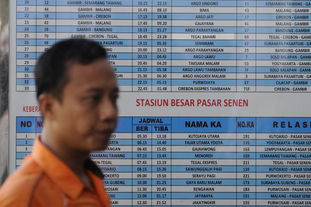 Warga melintas di samping jadwal kereta api di Stasiun Pasar Senen, Jakarta, Sabtu (30/4). PT Kereta Api Indonesia menyediakan 38 perjalanan kereta api tambahan atau 22.360 kursi per hari untuk mudik Lebaran yang penjualannya dimulai pada Sabtu (30/4). ANTARA FOTO/Sigid Kurniawan/pd/16.