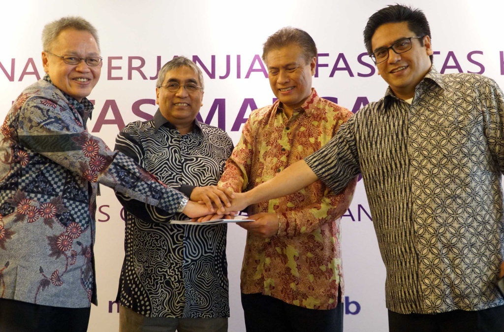 Direktur Utama PT Lintas Marga Sedaya Datuk Ir. Mohd Zulastri Mohd Amin (kedua kanan), Direktur PT Bank Central Asia Tbk (BCA) Rudy Susanto (kiri), Senior Executive Vice President Group Corporate Banking BCA Wira Chandra (kanan) dan Komisaris PT Lintas Marga Sedaya Dato’ Noorazman Abd Aziz (kedua kiri) usai menandatangani Perjanjian Kredit Sindikasi yang diberikan oleh pihak perbankan dan lembaga keuangan non perbankan senilai Rp8,889 Triliun berjangka waktu 15 tahun untuk Proyek Pengembangan Tol Cipali dan Pembangunanan Airport Link Tol BIJB Kertajati di Jakarta, Senin (17/09). AKTUAL/Eko S Hilman