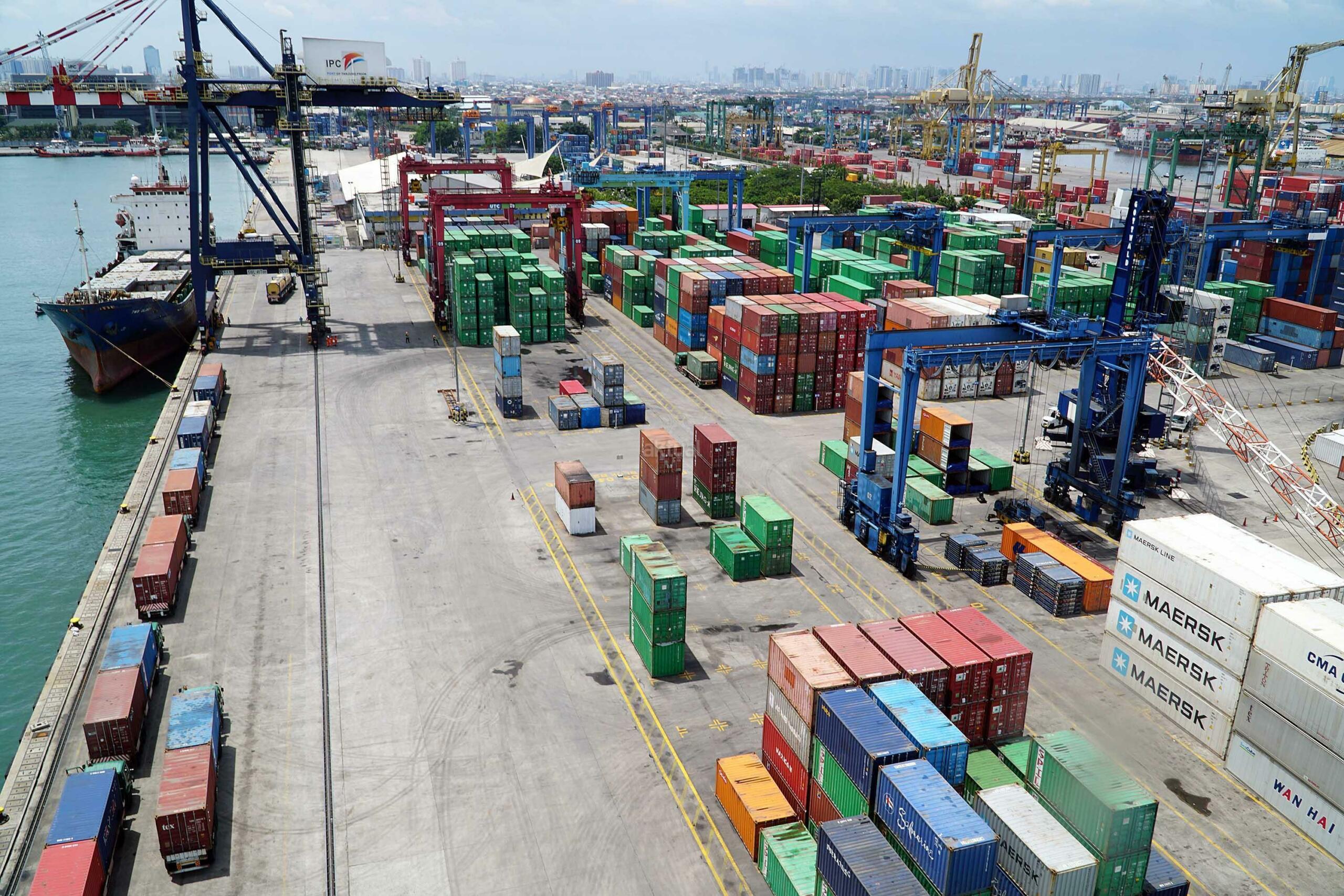 Sejumlah truk beraktifitas di areal PT Nusantara Pelabuhan Handal (NPH), pelabuhan peti kemas,Tanjung Priok,Selasa (7/2). NPH yang mengoperasikan terminal peti kemas dengan kapasitas 600 ribu TEUS pertahun.Direksi dan Komisaris NPH dalam kunjungannya untuk memastikan kegiatan bongkar muat peti kemas berjalan dengan baik, Selain mengoperasikan terminal peti kemas, NPH juga mensupplay peralatan pelabuhan dan jasa perawatan alat pelabuhan,Saat ini NPH sedang mempersiapkan diri untuk IPO dalam waktu dekat. AKTUAL/Eko S Hilman