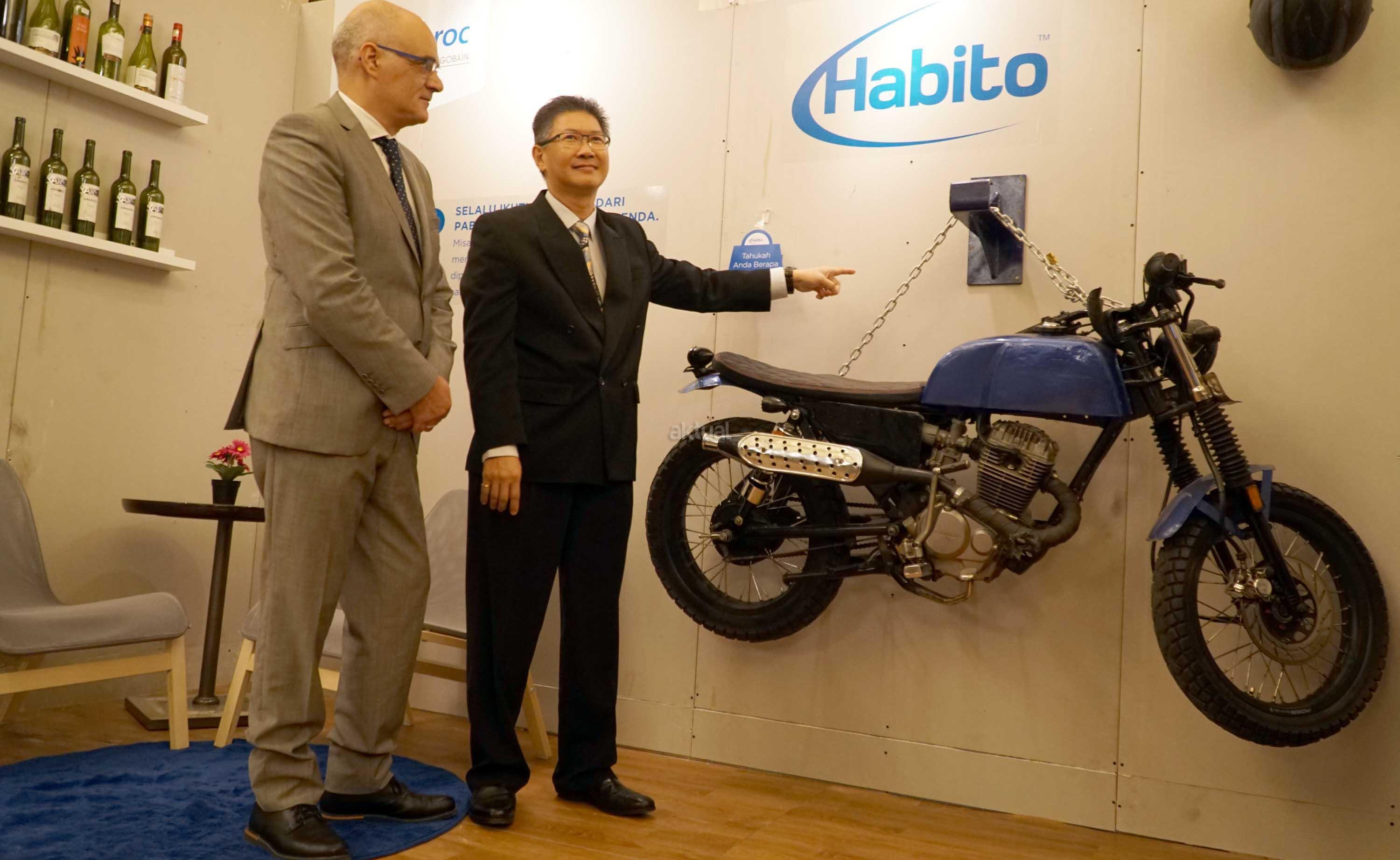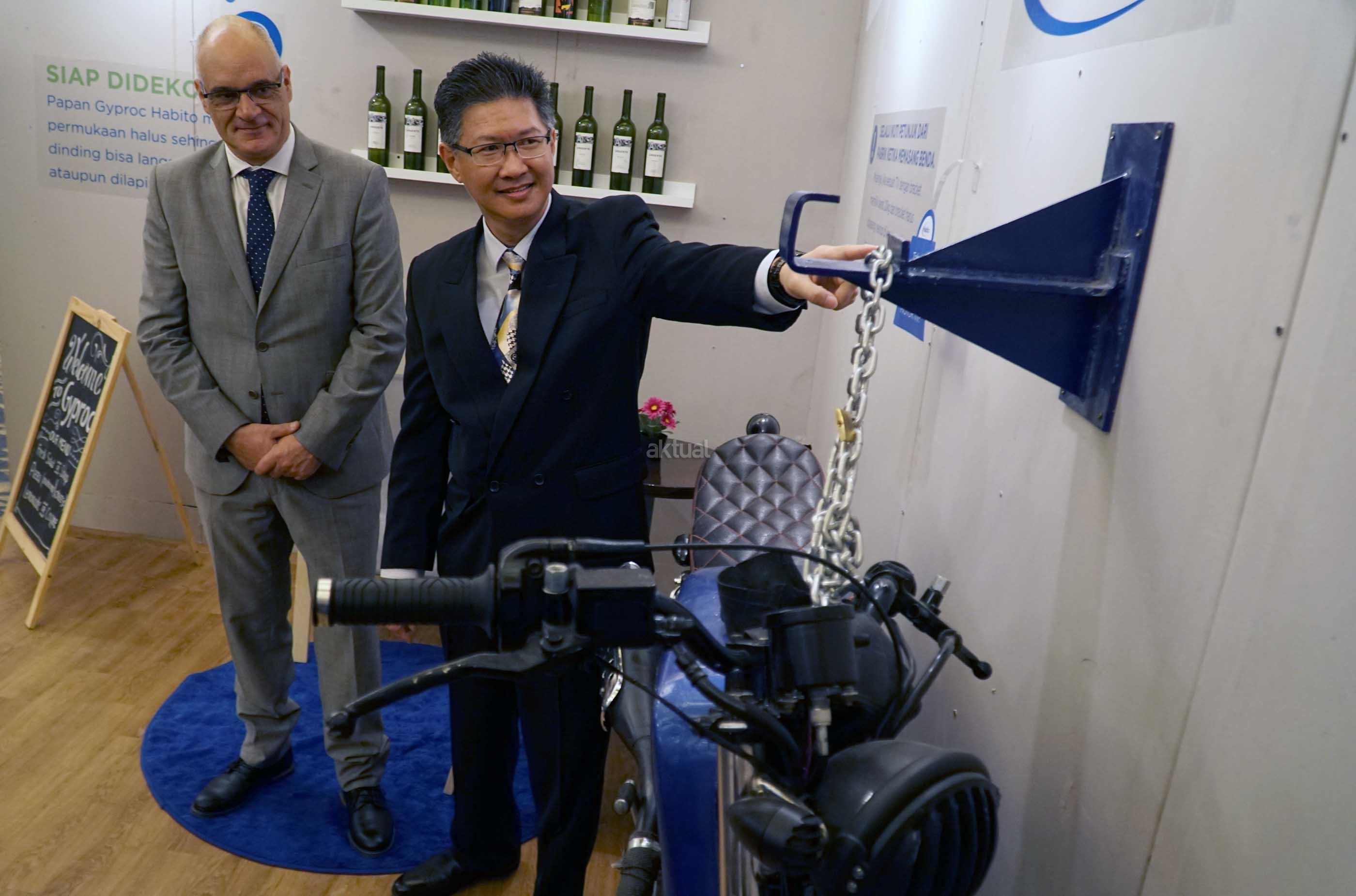 Technical Sales Development Manager Saint Gobain Construction Products South East Asia, Jose Carlos Pereira (kiri) bersama Managing Director PT Saint GobainConstruction Products Indonesia, Hantarman Budiono berbincang saat melakukan simulasi dan peluncuran penggunaan papan gypsum dengan merek dagang Gyproc di Jakarta, Rabu (2/8). Kali ini Gyproc kembali dengan inovasi paling canggih dari sebuah dinding dengan memperkenalkan tiga produk terbaru yaitu, Habito, Glasroc H dan XRoc. AKTUAL/Eko S Hilman