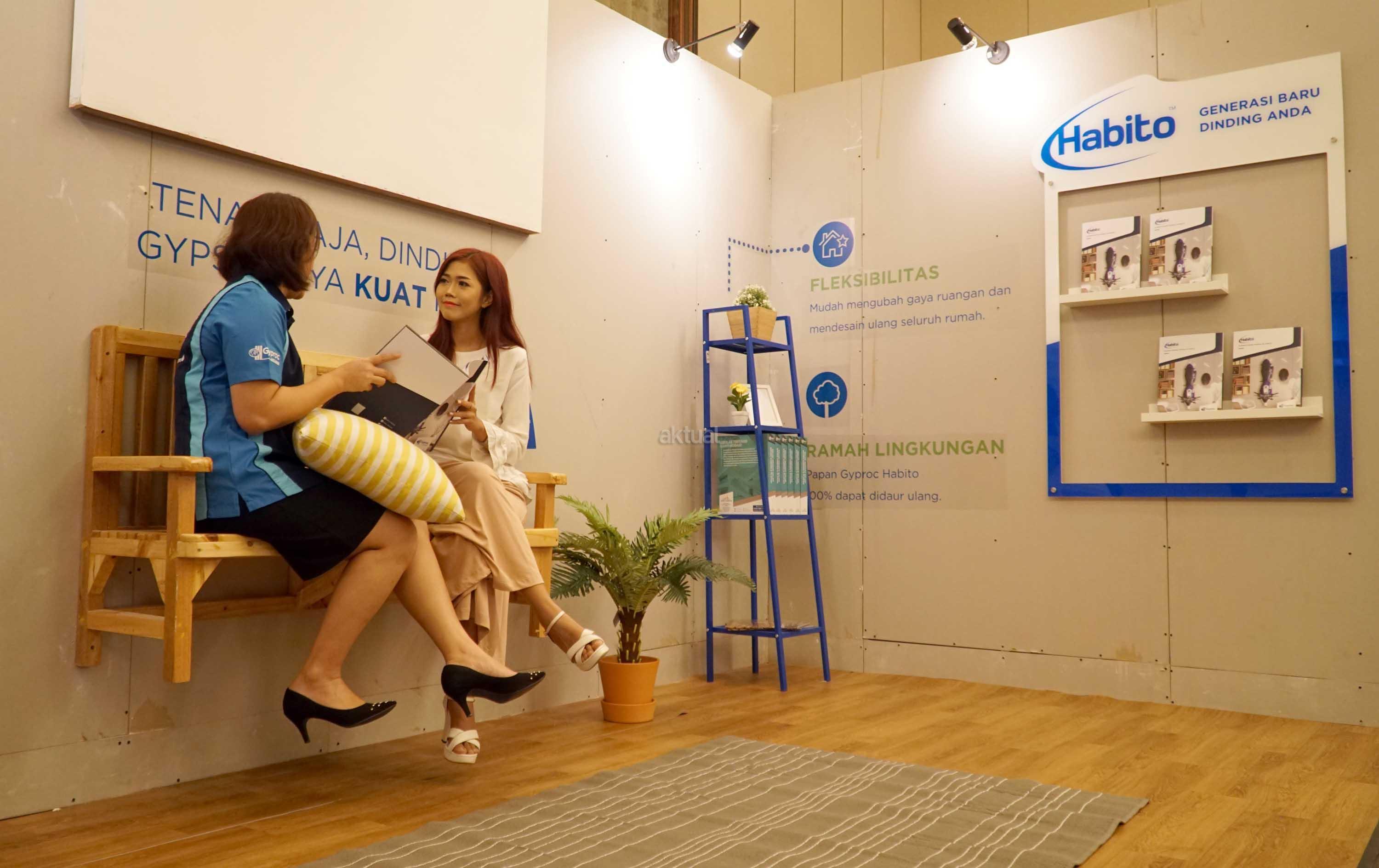 Pengunjung saat memperoleh penjelasan dari Sales Promotion Girl disela gelar produk dan peluncuran penggunaan papan gypsum dengan merek dagang Gyproc di Jakarta, Rabu (2/8). Kali ini Gyproc kembali dengan inovasi paling canggih dari sebuah dinding, dengan memperkenalkan tiga produk terbaru yaitu, Habito,Glasroc H dan XRoc. AKTUAL/Eko S Hilman
