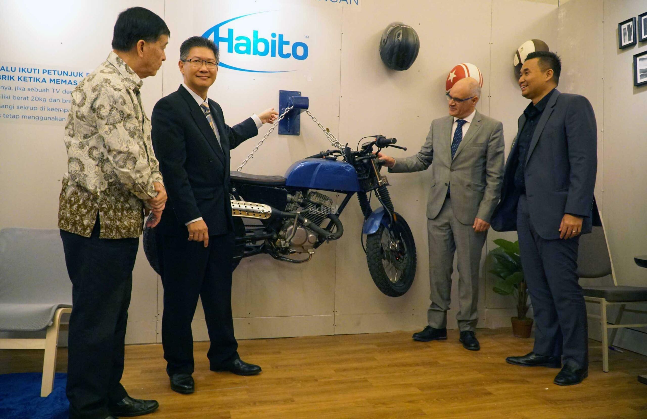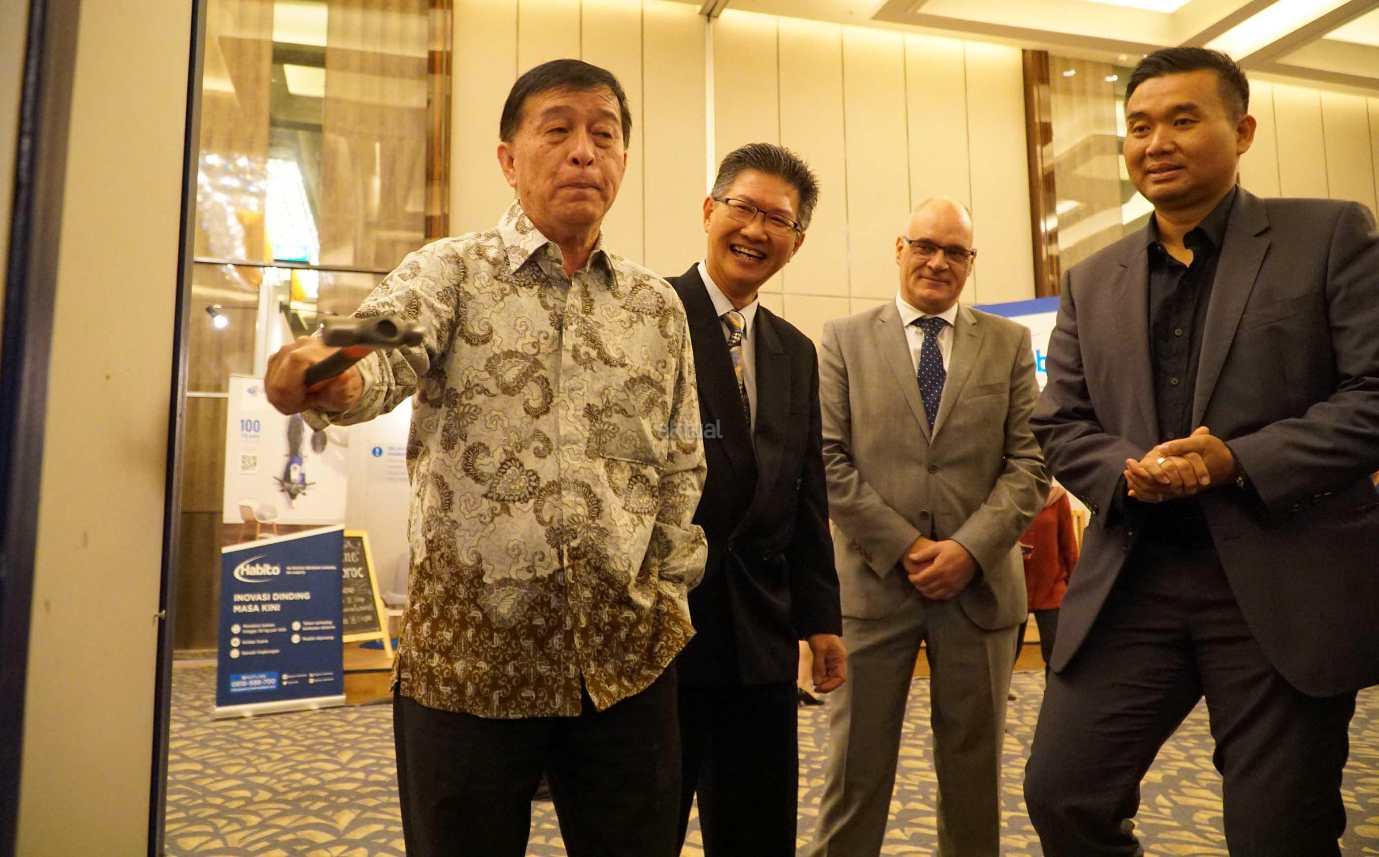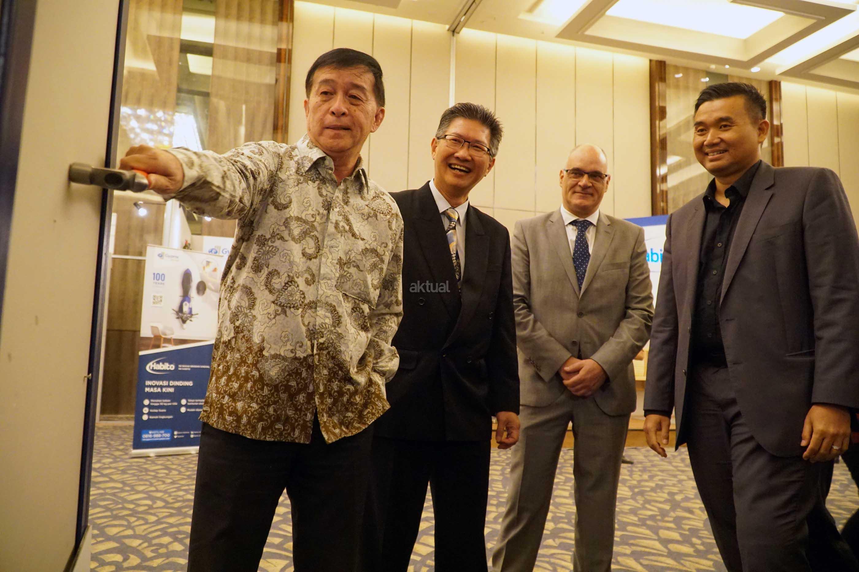 Technical Sales Development Manager Saint Gobain Construction Products South East Asia, Jose Carlos Pereira (kedua dari kiri), Chairman of Green Product Council Indonesia, Hendrata Atmoko (kiri), Managing Director PT Saint GobainConstruction Products Indonesia, Hantarman Budiono (kedua kanan) serta Managing Director, Architect & Urban Designer of PDW Architects, Tiyok Prasetyoadi berbincang (kanan) saat melakukan simulasi kekuatan produk disela sela peluncuran penggunaan papan gypsum dengan merek dagang Gyproc di Jakarta, Rabu (2/8). Kali ini Gyproc kembali dengan inovasi paling canggih dari sebuah dinding, dengan memperkenalkan tiga produk terbaru yaitu, Habito,Glasroc H dan XRoc. AKTUAL/Eko S Hilman