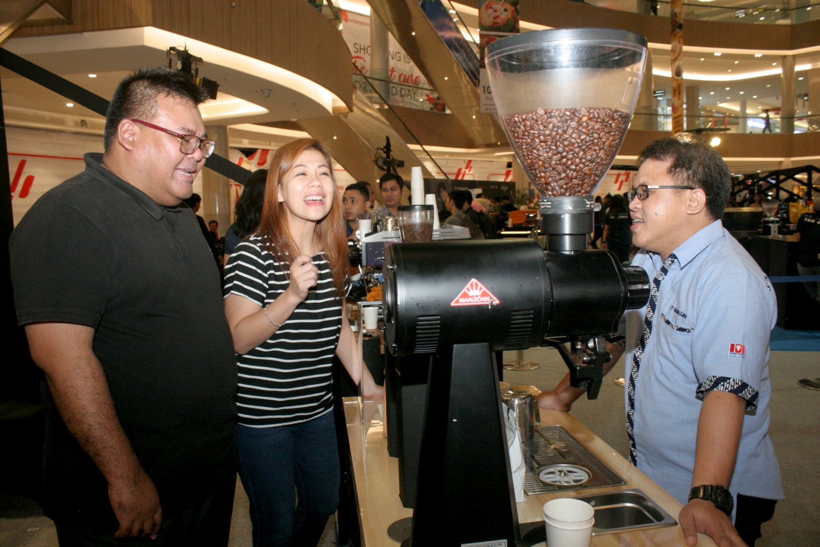 Group General Manager Corporate Communication PT Sukanda Djaya Nino Sari (kiri), Senior Technical Sales Manager Meliawati Djap (tengah), dan General Manager Basuki Soedjatmiko berbincang mengenai mesin kopi premium La Marzocco saat berlangsung Indonesia Coffee Event 2018 (ICE) di Surabaya, Jumat (19/1/2018). Event yang berlangsung dari 19 hingga 21 Januari ini disponsori oleh PT Sukanda Djaya selaku distributor pemegang hak distribusi untuk mesin-mesin kopi seperti Mahlkonig, Marco, dan Caffeto. ICE merupakan ajang kompetisi kopi nasional tahunan, dimana pemenang akan dikirim sebagai wakil Indonesia pada ajang kompetisi peracik kopi tingkat dunia. AKTUAL/HO