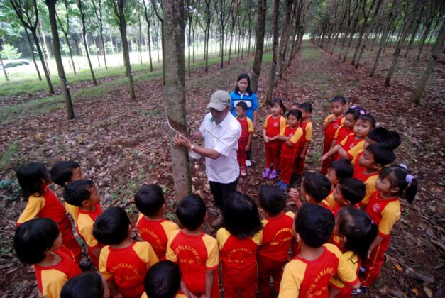 Petugas memberikan informasi tentang cara menyadap getah karet kepada sejumlah siswa TK dalam wisata edukasi karet di Perkebunan Ngobo milik PT Perkebunan Nusantara (PTPN) IX, Bergas, Kabupaten Semarang, Jawa Tengah, Rabu (11/5). Wisata edukasi tersebut memberikan wawasan kepada masyarakat mengenai pohon karet, cara penyadapan, pengolahan, dan manfaat karet bagi kehidupan sehari-hari. ANTARA FOTO/Aditya Pradana Putra/foc/16.