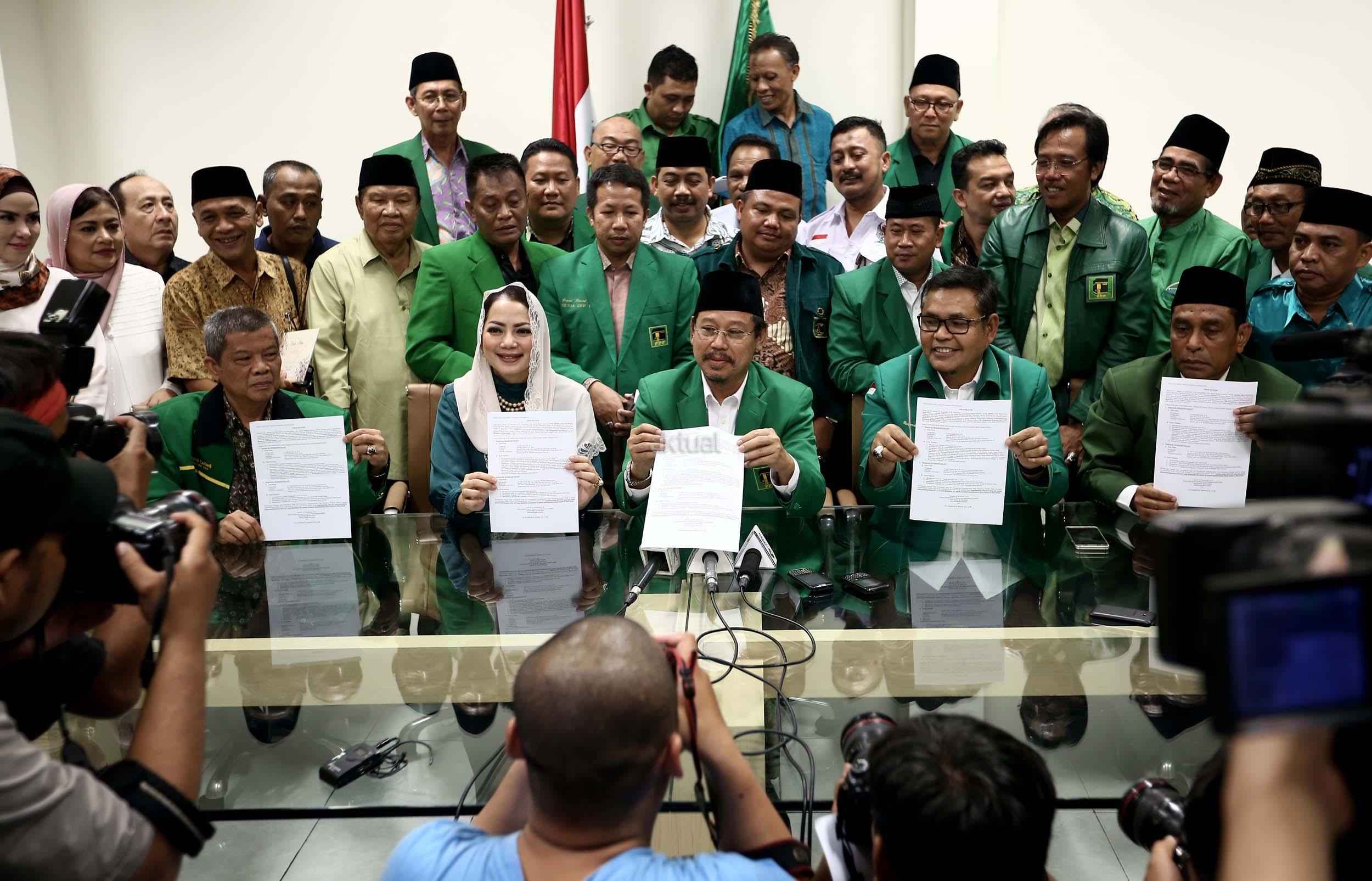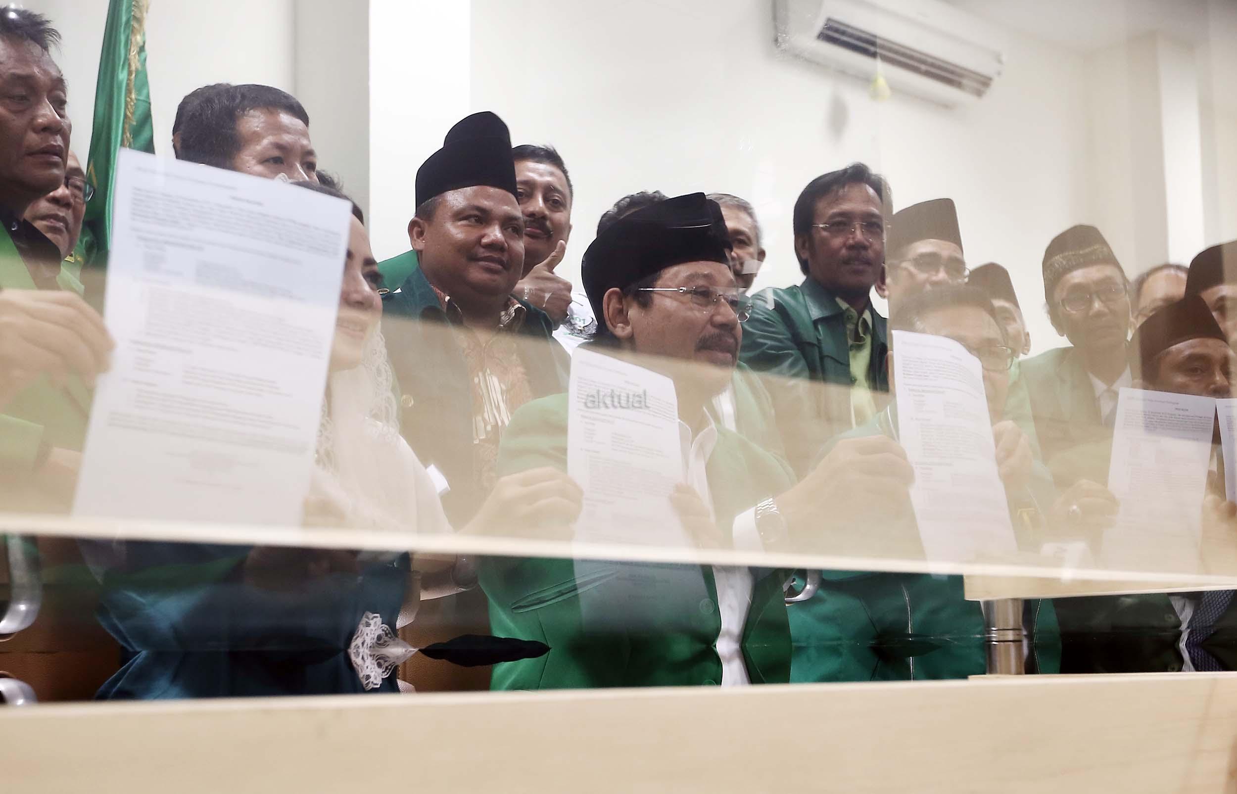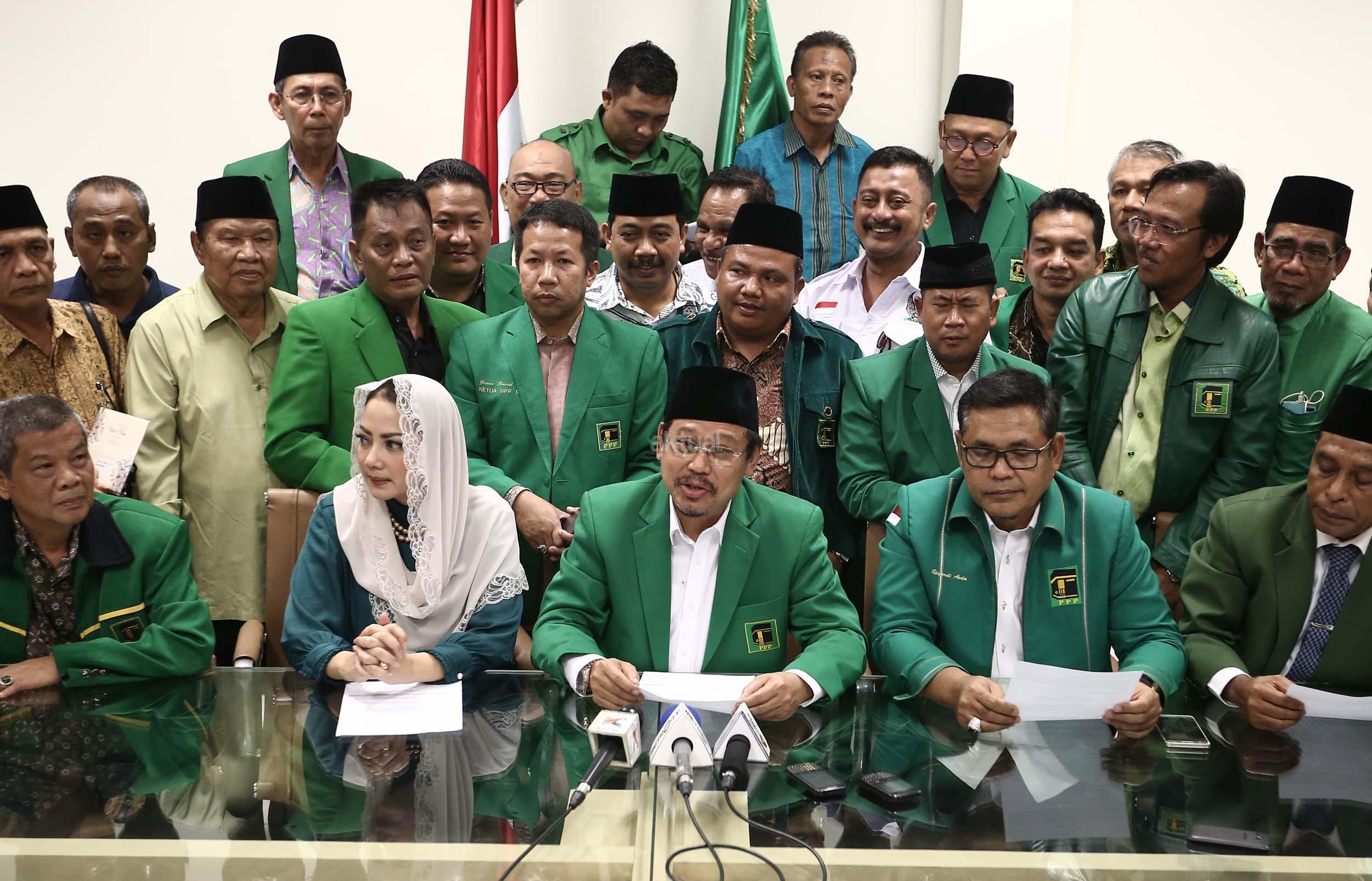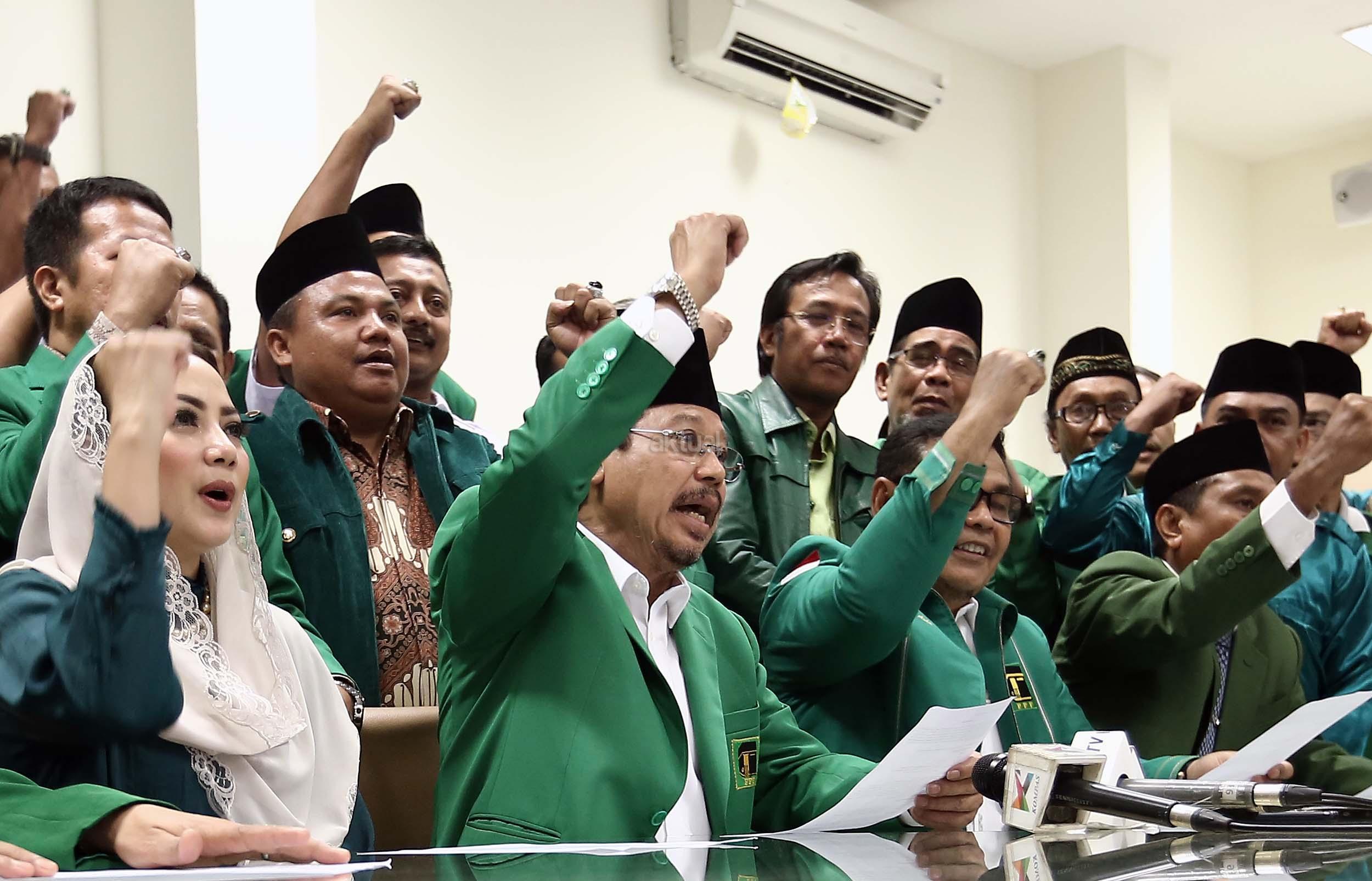 Ketua Umum PPP hasil Munas Jakarta, Djan Faridz, didampingi pengurus partai memberikan keterangan terkait putusan PTUN di Kantor DPP PPP, Jakarta, Selasa (22/11/2016). Pengadilan Tata Usaha Negara Jakarta kembali memenangkan gugatan yang dilayangkan oleh PPP kubu Djan Faridz atas SK Kemenkumham yang mengesahkan kepengurusan Romahurmuziy. AKTUAL/Munzir