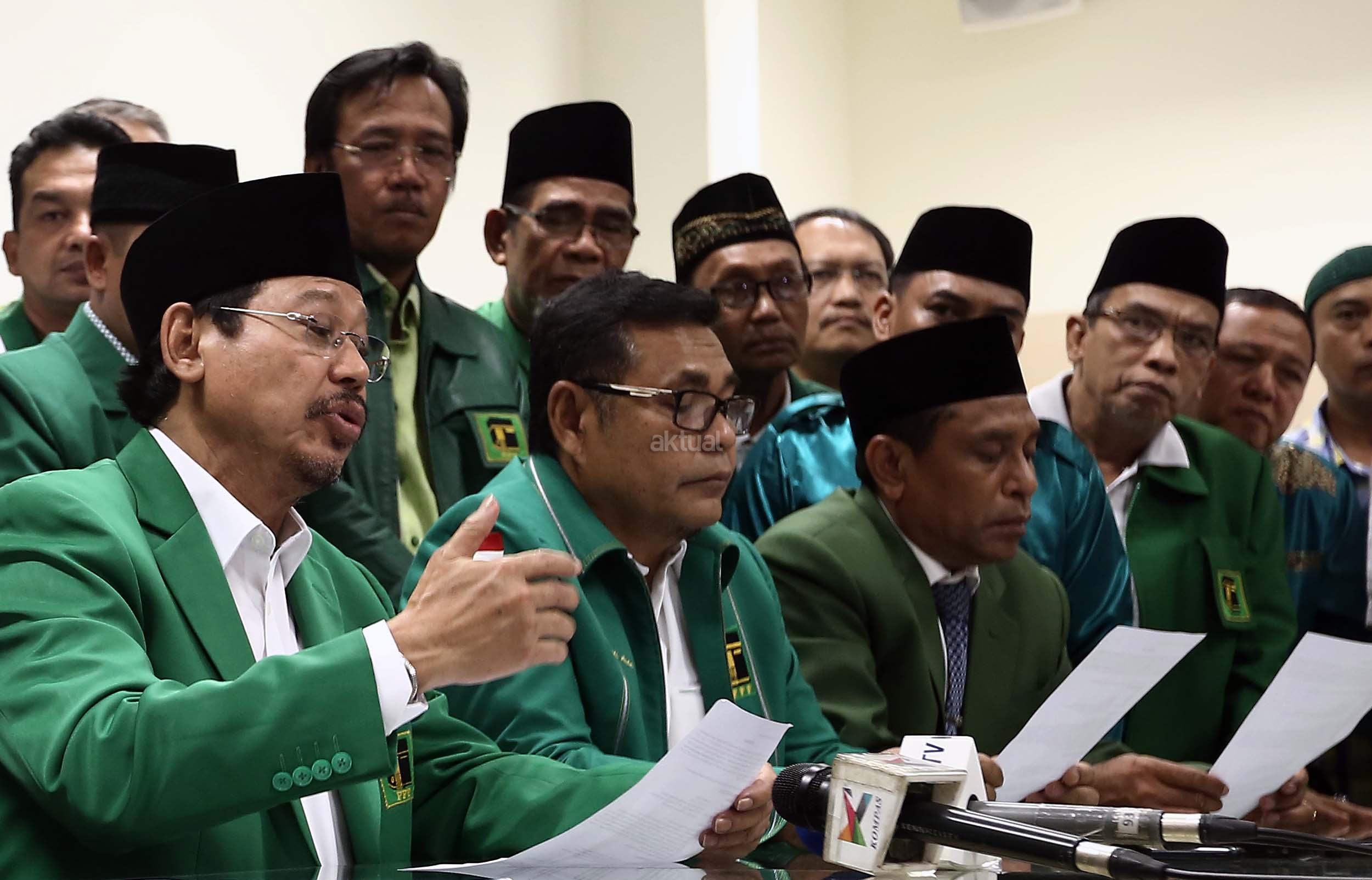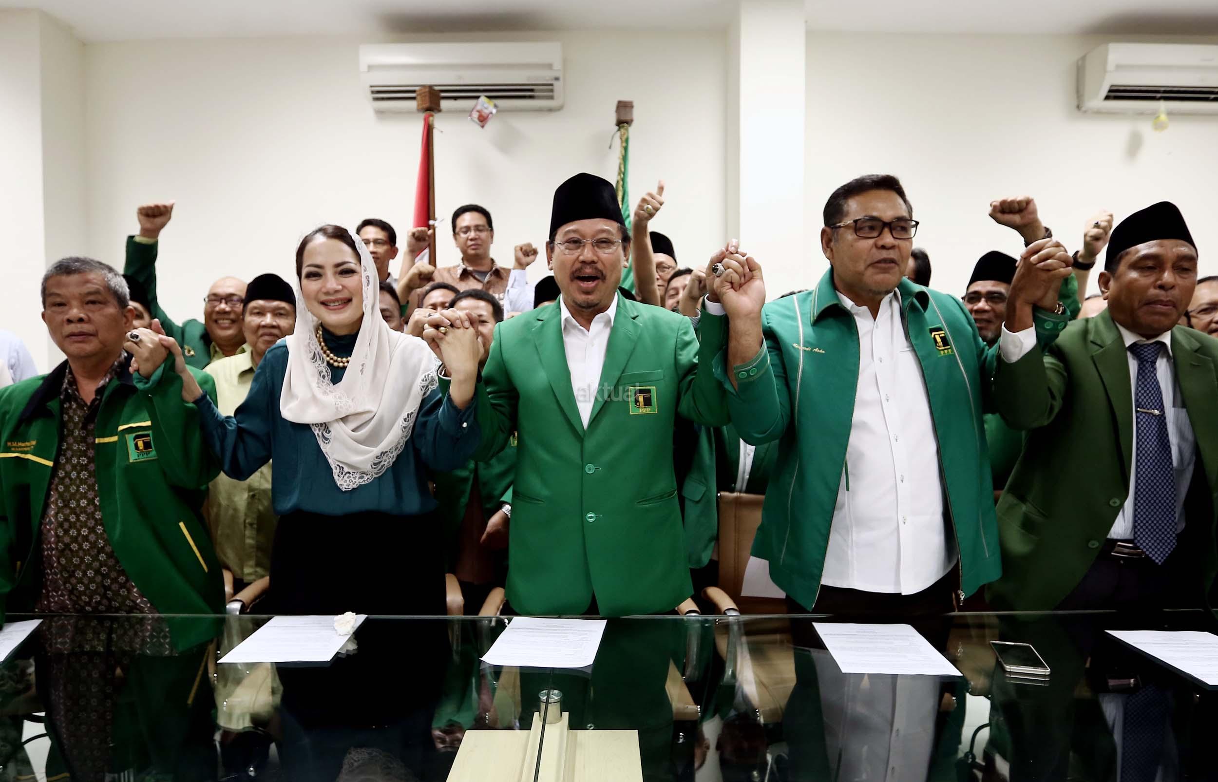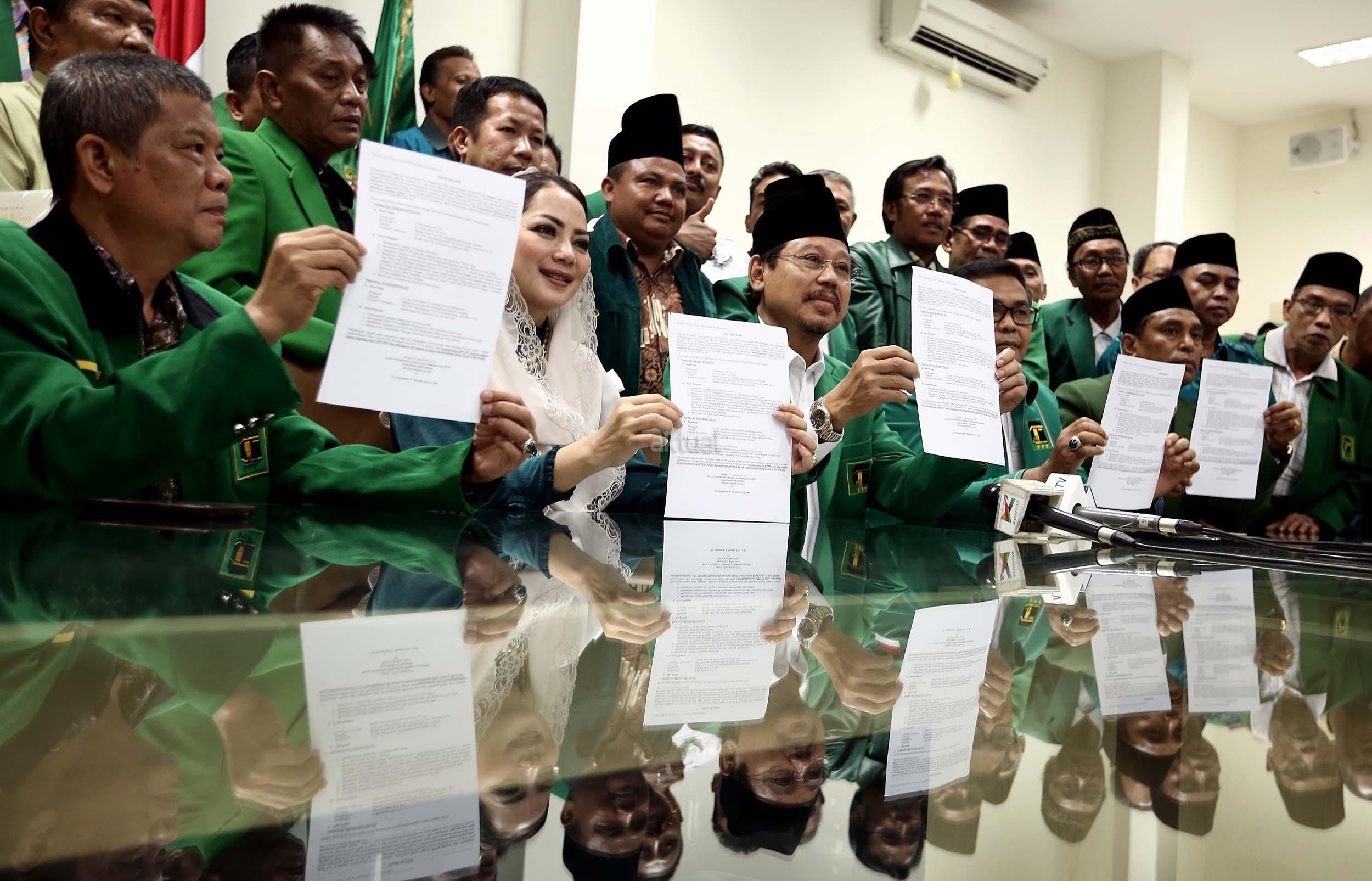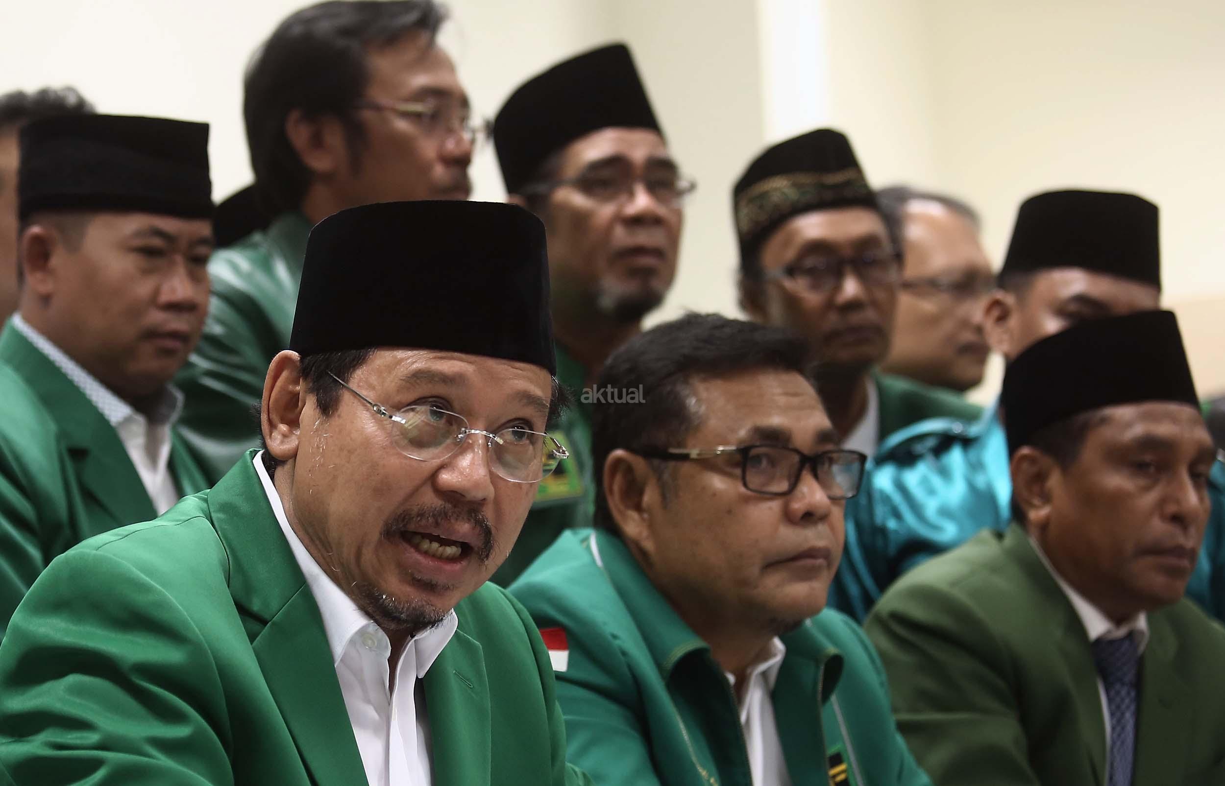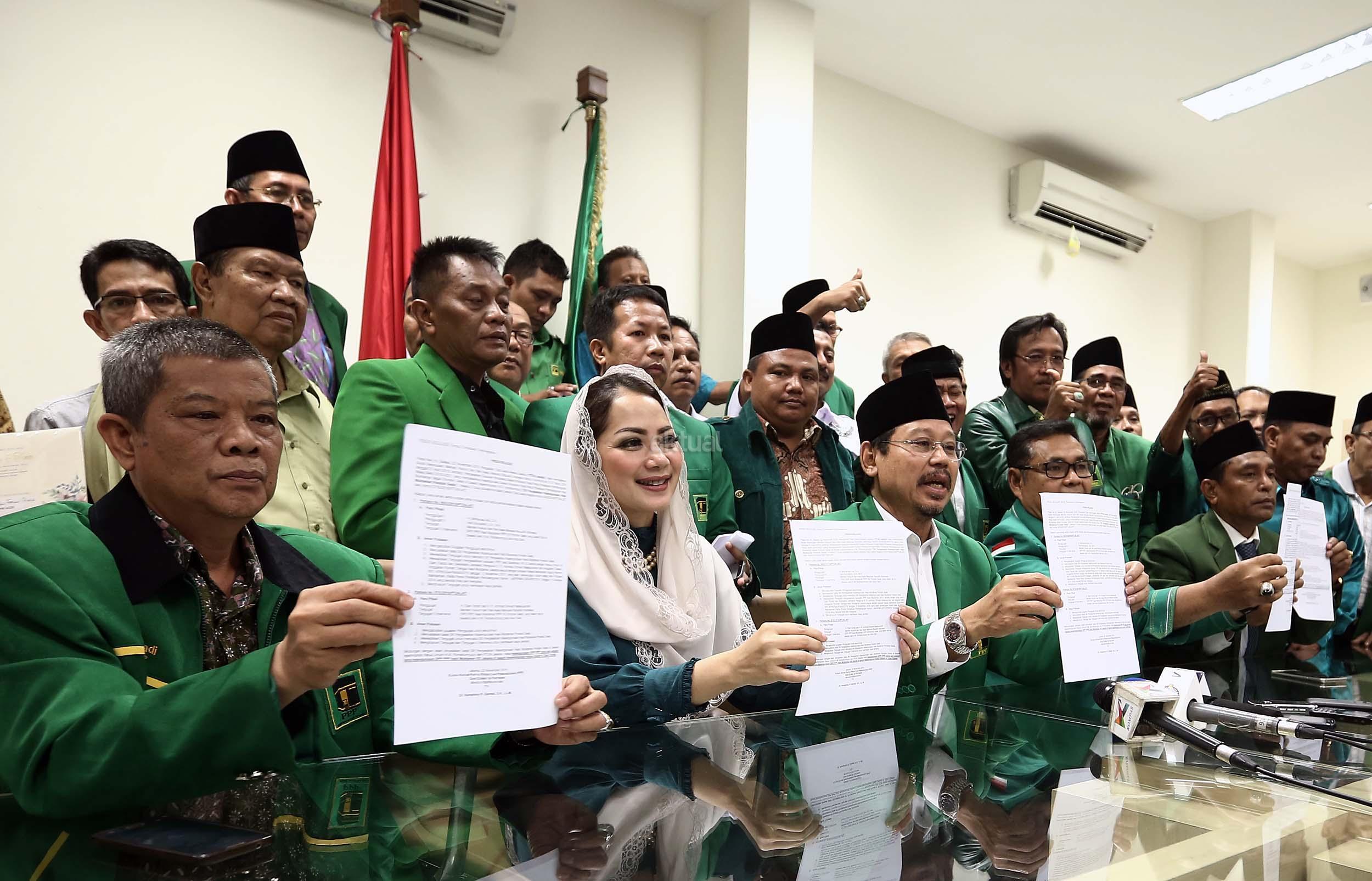 Ketua Umum PPP hasil Munas Jakarta, Djan Faridz, didampingi pengurus partai memberikan keterangan terkait putusan PTUN di Kantor DPP PPP, Jakarta, Selasa (22/11/2016). Pengadilan Tata Usaha Negara Jakarta kembali memenangkan gugatan yang dilayangkan oleh PPP kubu Djan Faridz atas SK Kemenkumham yang mengesahkan kepengurusan Romahurmuziy. AKTUAL/Munzir