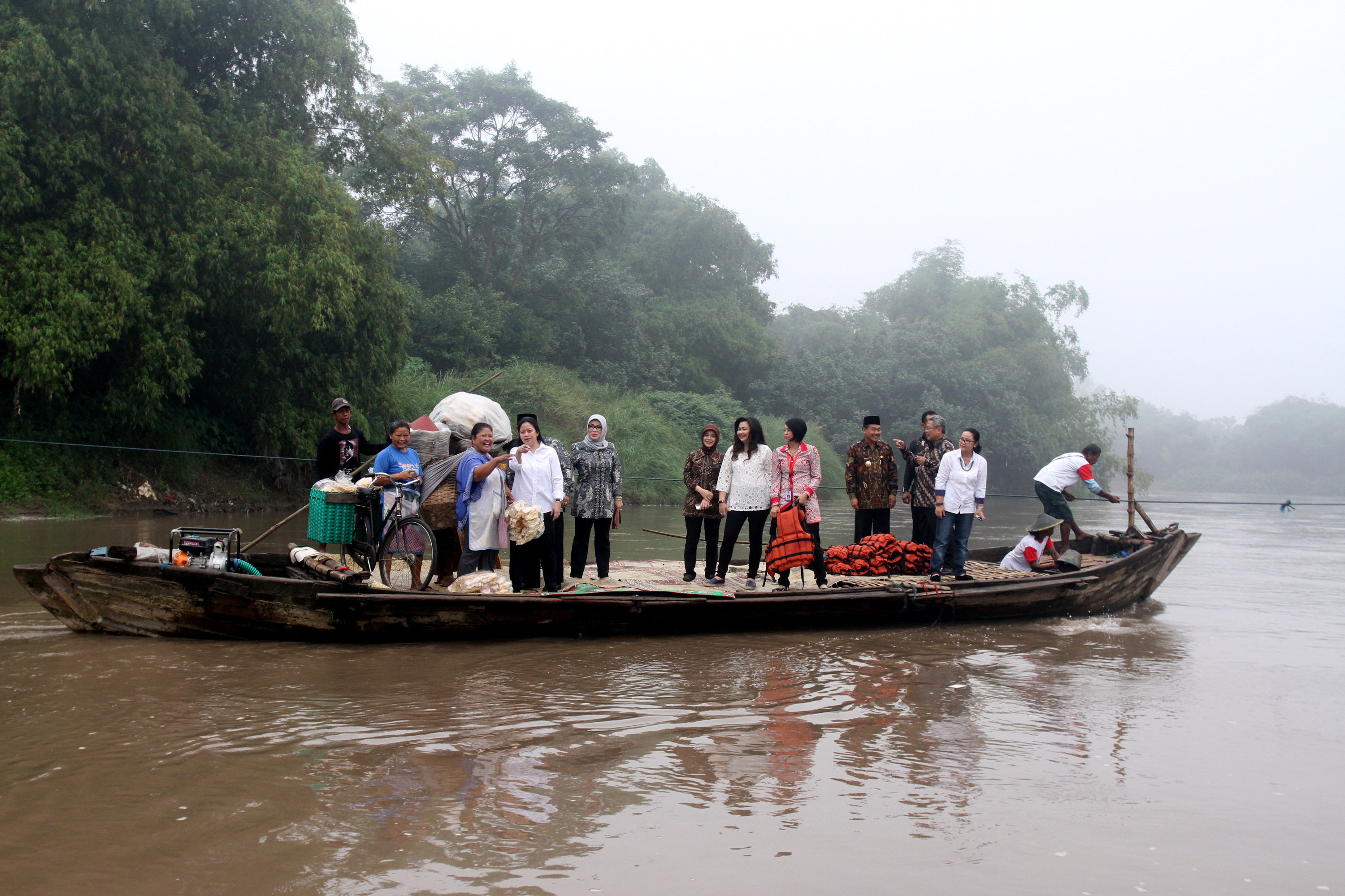 Menko Pembangunan Masyarakat dan Kebudayaan Puan Maharani (keempat kiri) berbincang dengan warga saat menyeberangi sungai Bengawan Solo menggunakan rakit di Kabupaten Sukoharjo, Jawa Tengah, Jumat (13/5). Warga berharap dibangunnya jembatan gantung yang menghubungkan desa Gadingan Sukoharjo dan Solo agar mempermudah aktivitas warga. ANTARAFOTO/Yulius Satria Wijaya/aww/16.