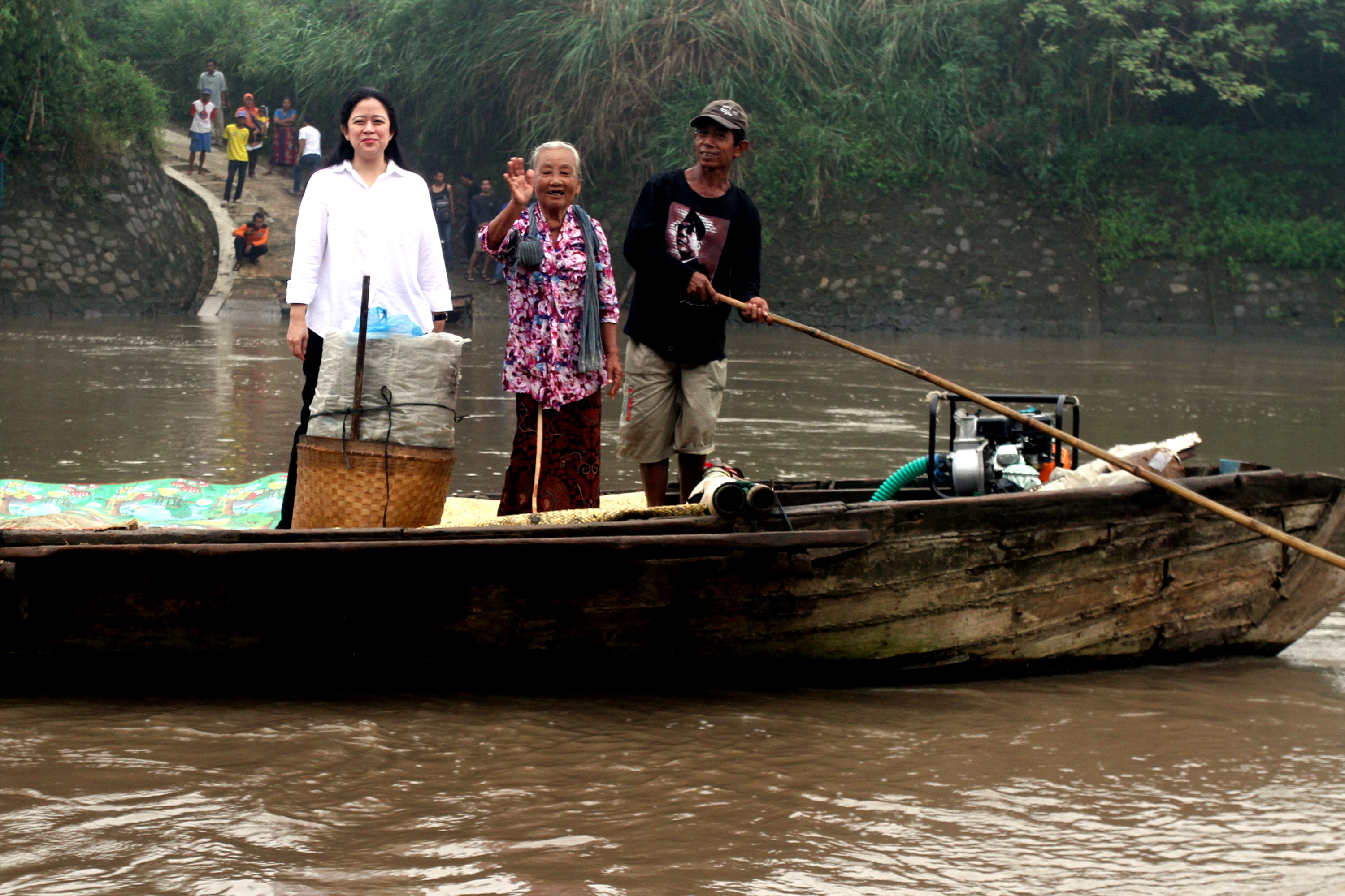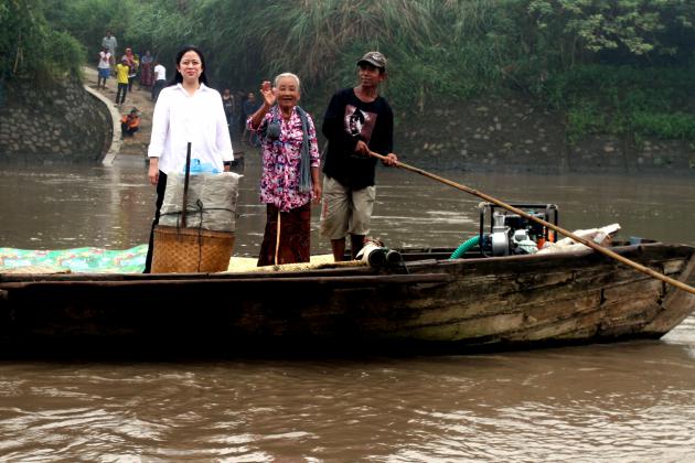 Menko Pembangunan Masyarakat dan Kebudayaan Puan Maharani (kiri) menyeberangi sungai Bengawan Solo menggunakan rakit di Kabupaten Sukoharjo, Jawa Tengah, Jumat (13/5). Warga berharap dibangunnya jembatan gantung yang menghubungkan desa Gadingan Sukoharjo dan Solo agar mempermudah aktivitas warga. ANTARAFOTO/Yulius Satria Wijaya/aww/16.