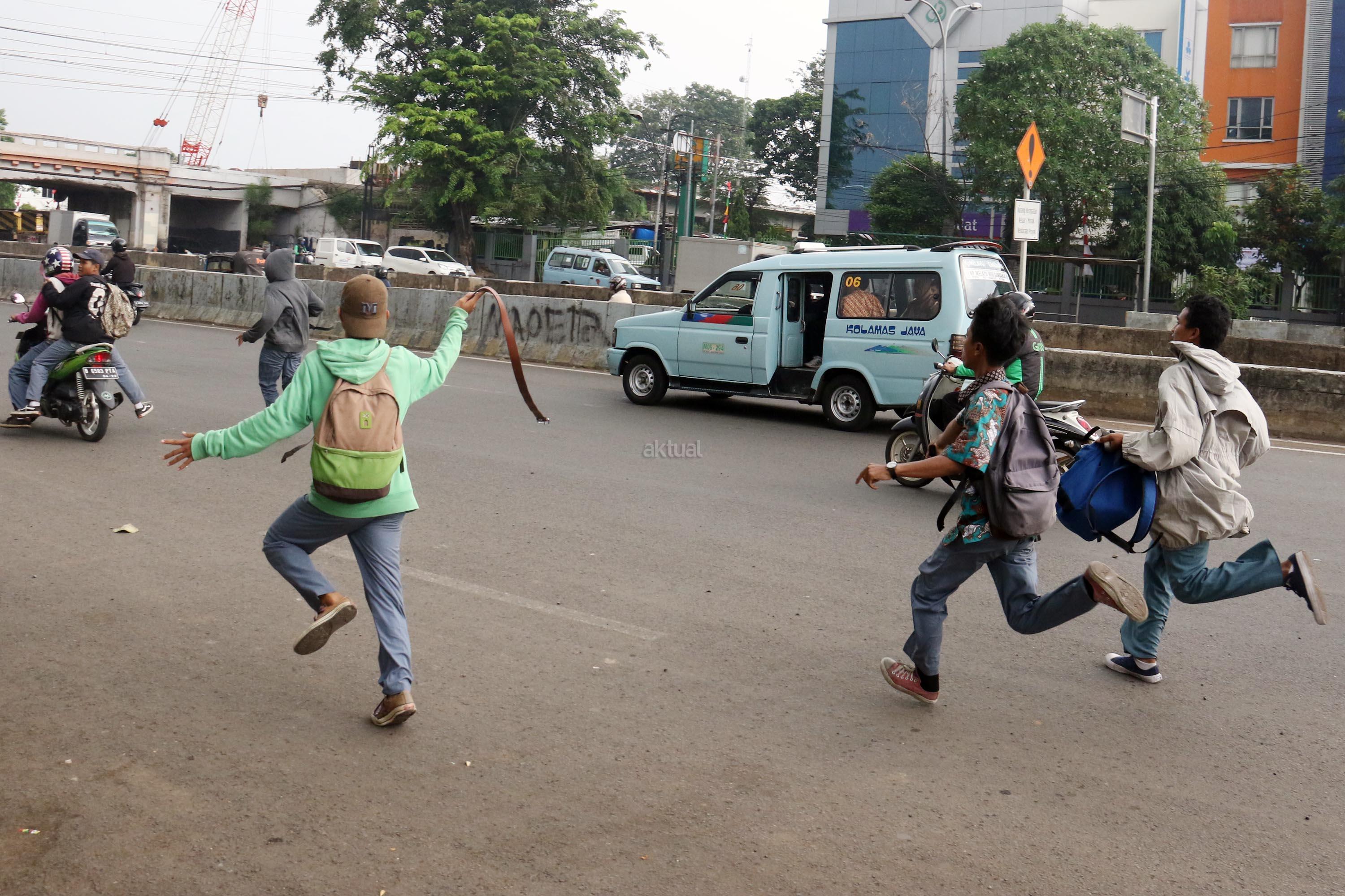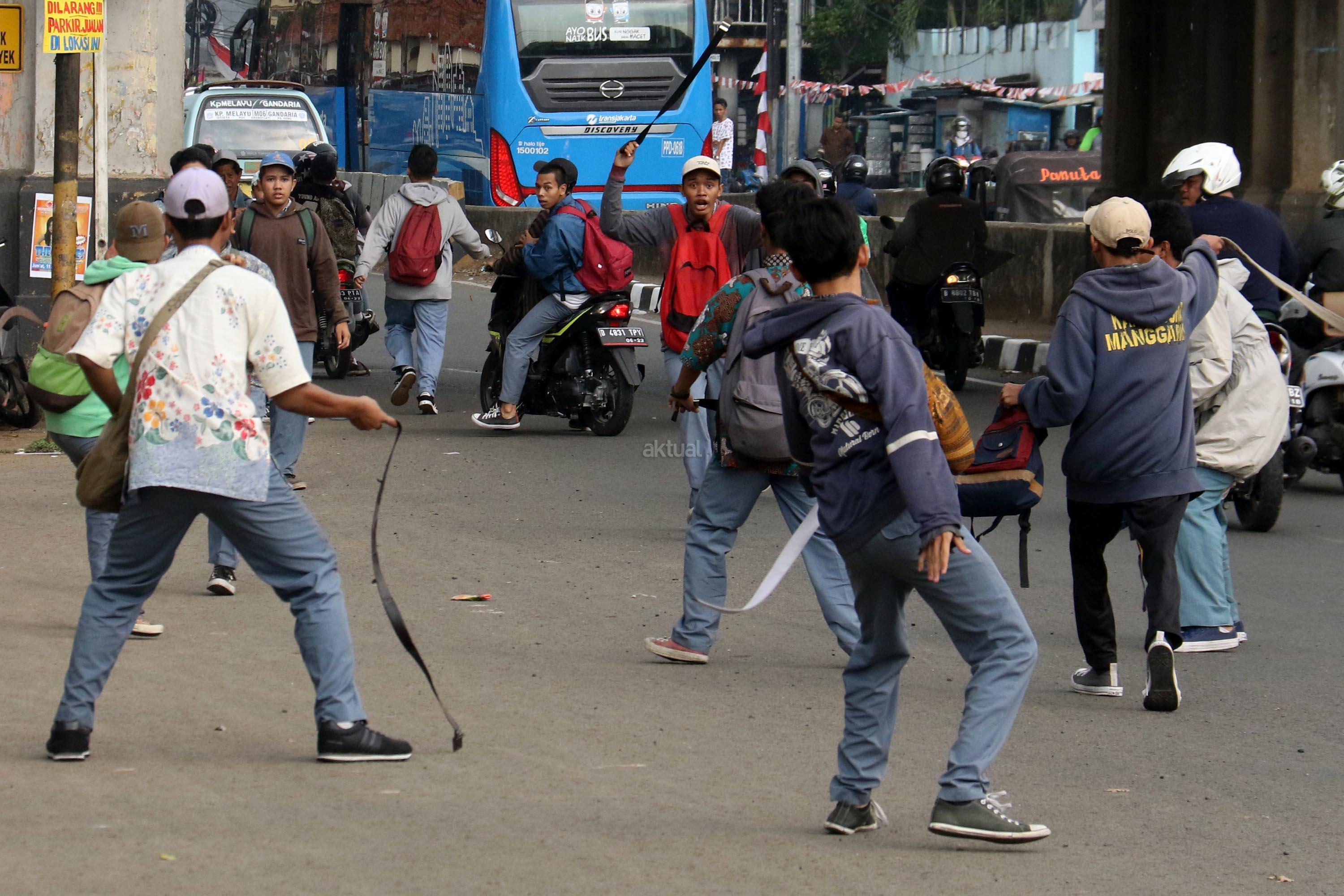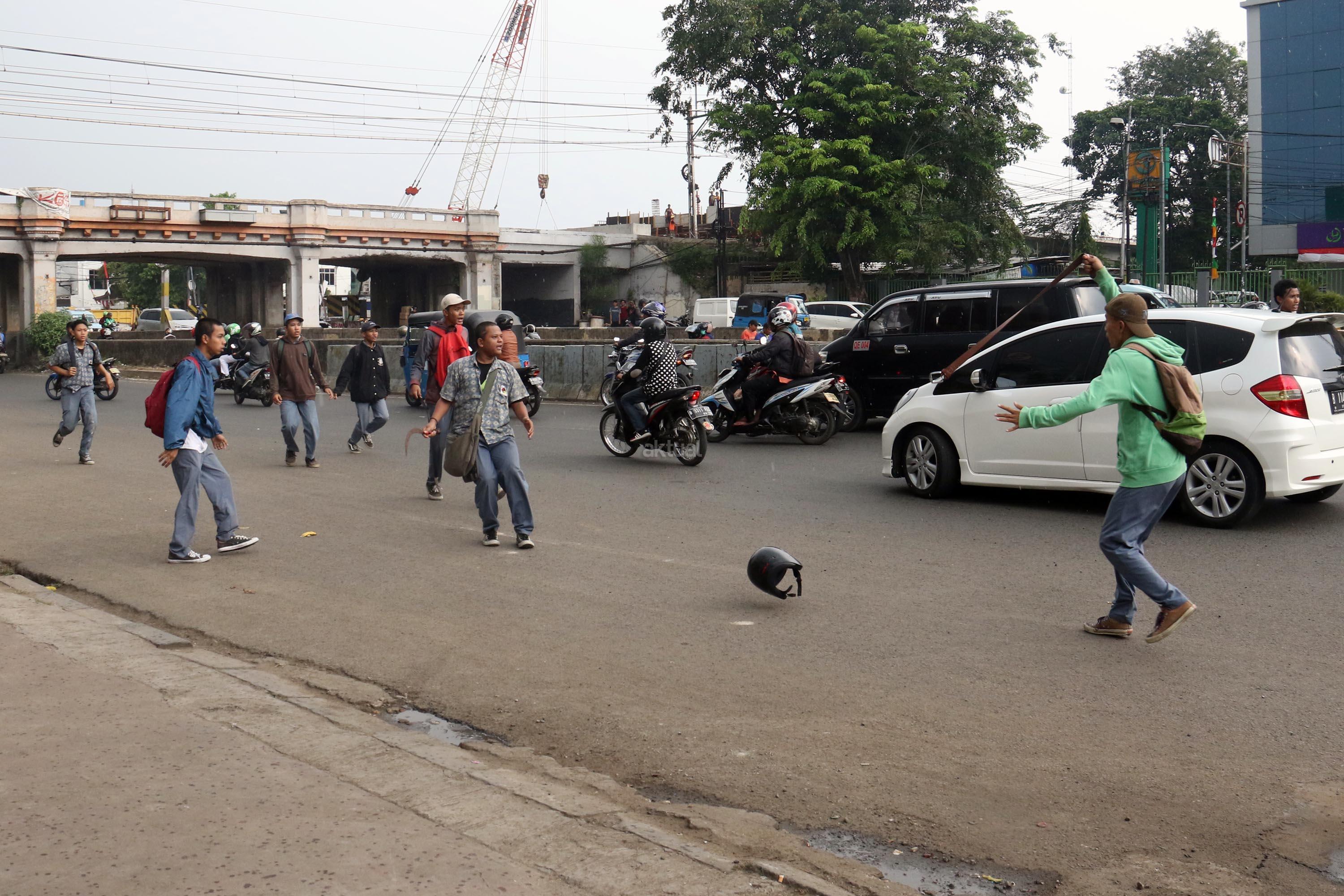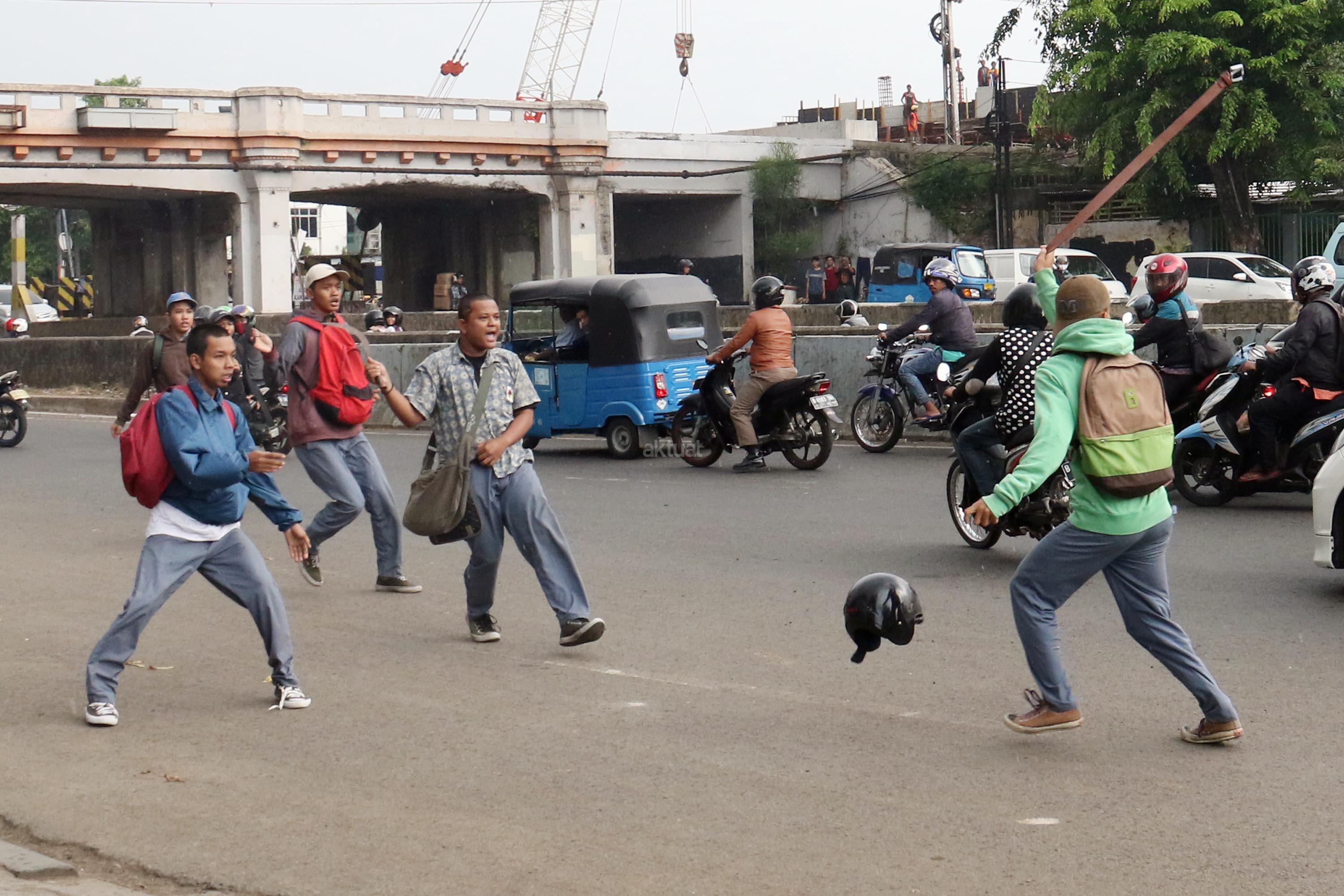 Terlihat puluhan pelajar Sekolah Menengah Kejuruan (SMK) terlibat aksi saling serang di Jalan Matraman Raya, Jatinegara, Jakarta Timur, Kamis (10/8/2017). Tawuran pelajar ini kerap terjadi hampir setiap siang hari dan para pelajar membawa berbagai senjata tajam serta membawa ikat pinggang. AKTUAL/Munzir