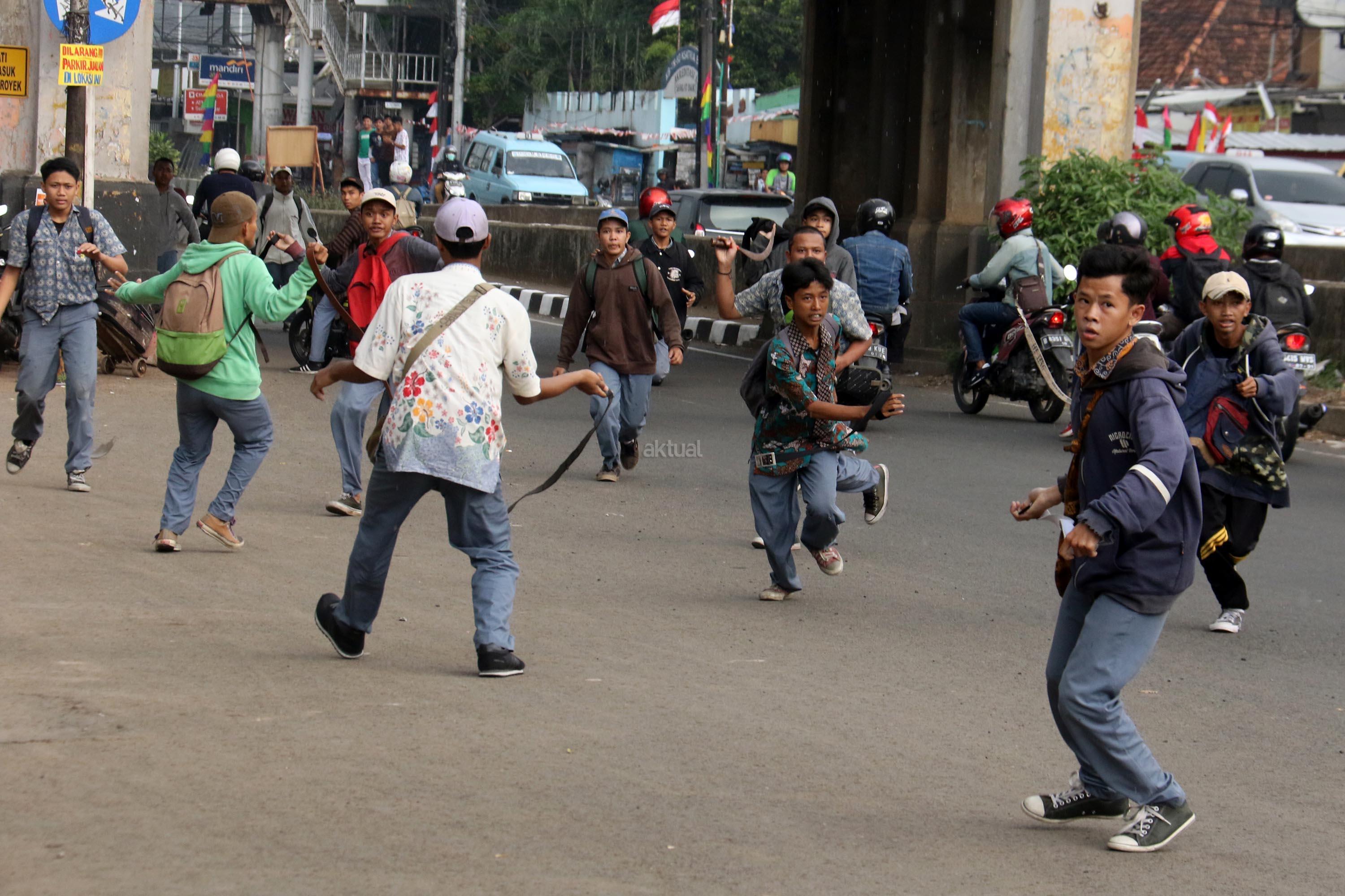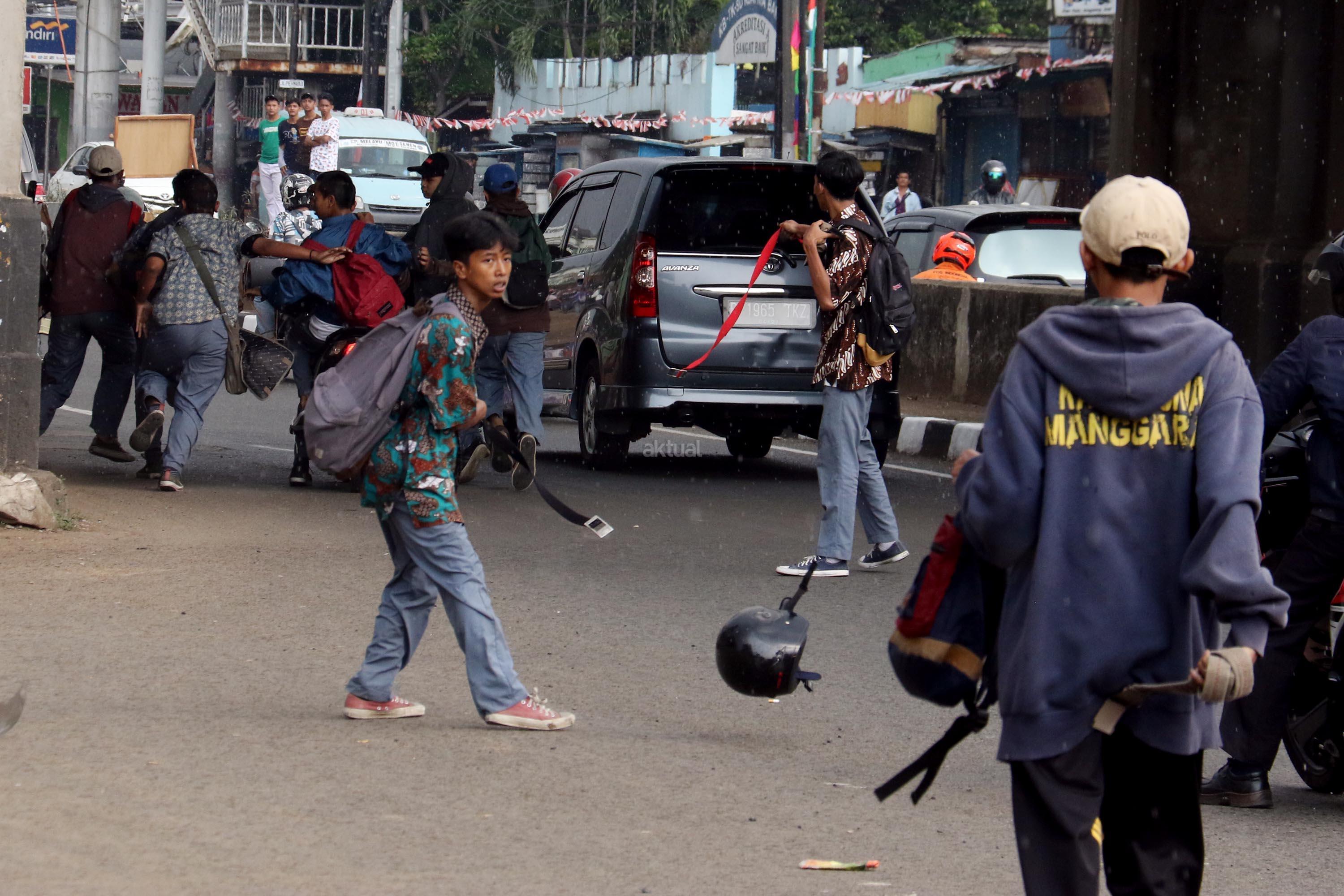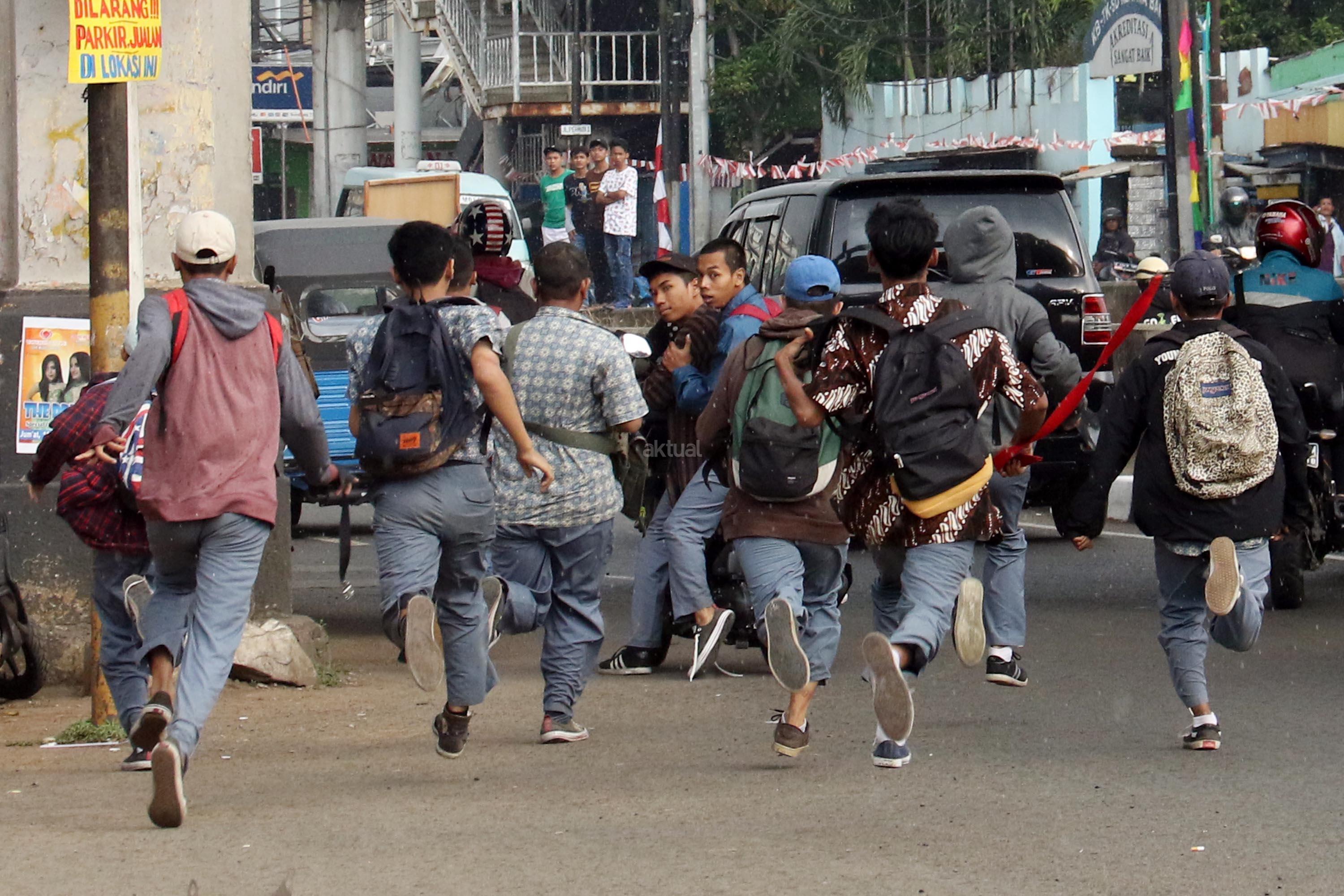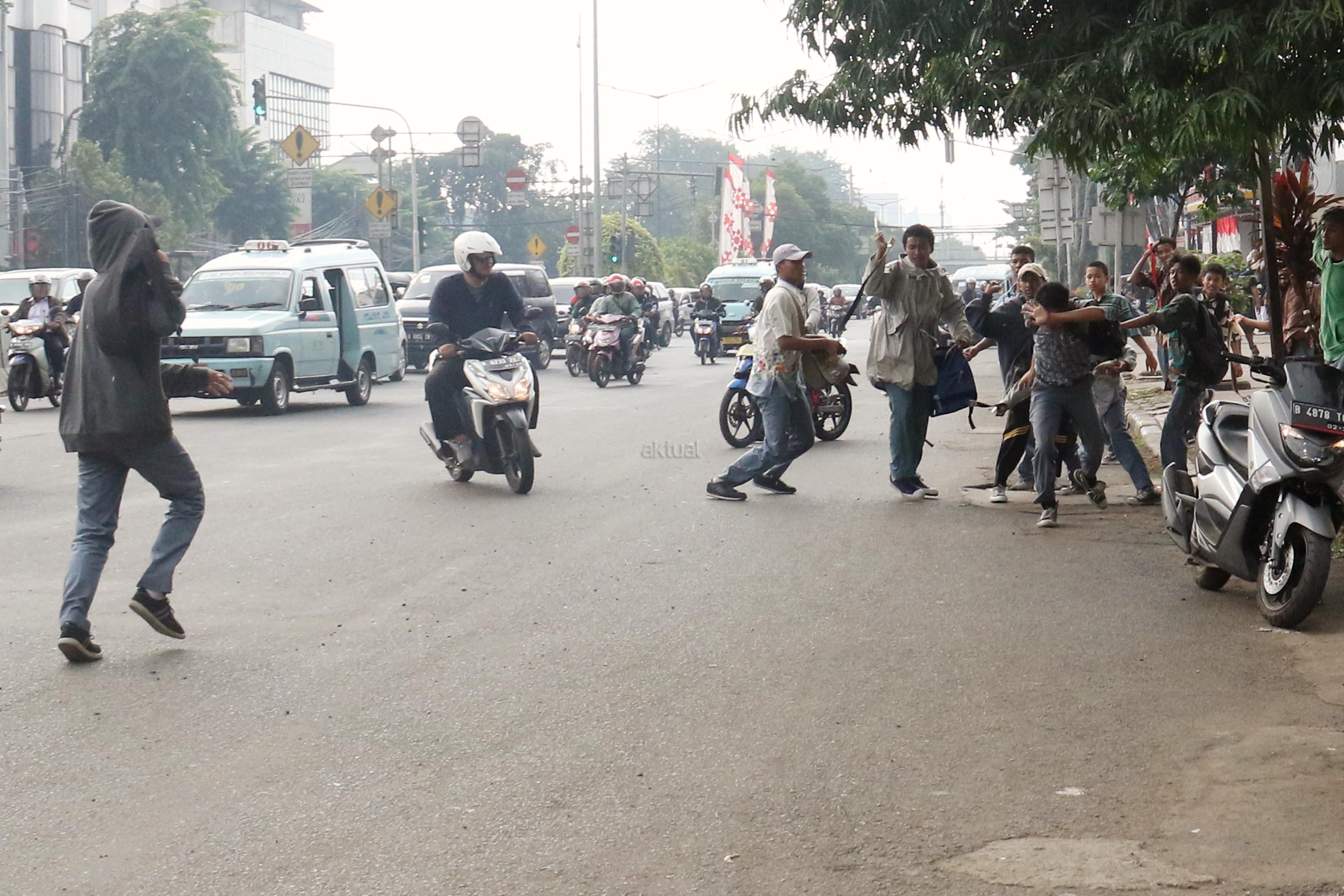 Terlihat puluhan pelajar Sekolah Menengah Kejuruan (SMK) terlibat aksi saling serang di Jalan Matraman Raya, Jatinegara, Jakarta Timur, Kamis (10/8/2017). Tawuran pelajar ini kerap terjadi hampir setiap siang hari dan para pelajar membawa berbagai senjata tajam serta membawa ikat pinggang. AKTUAL/Munzir