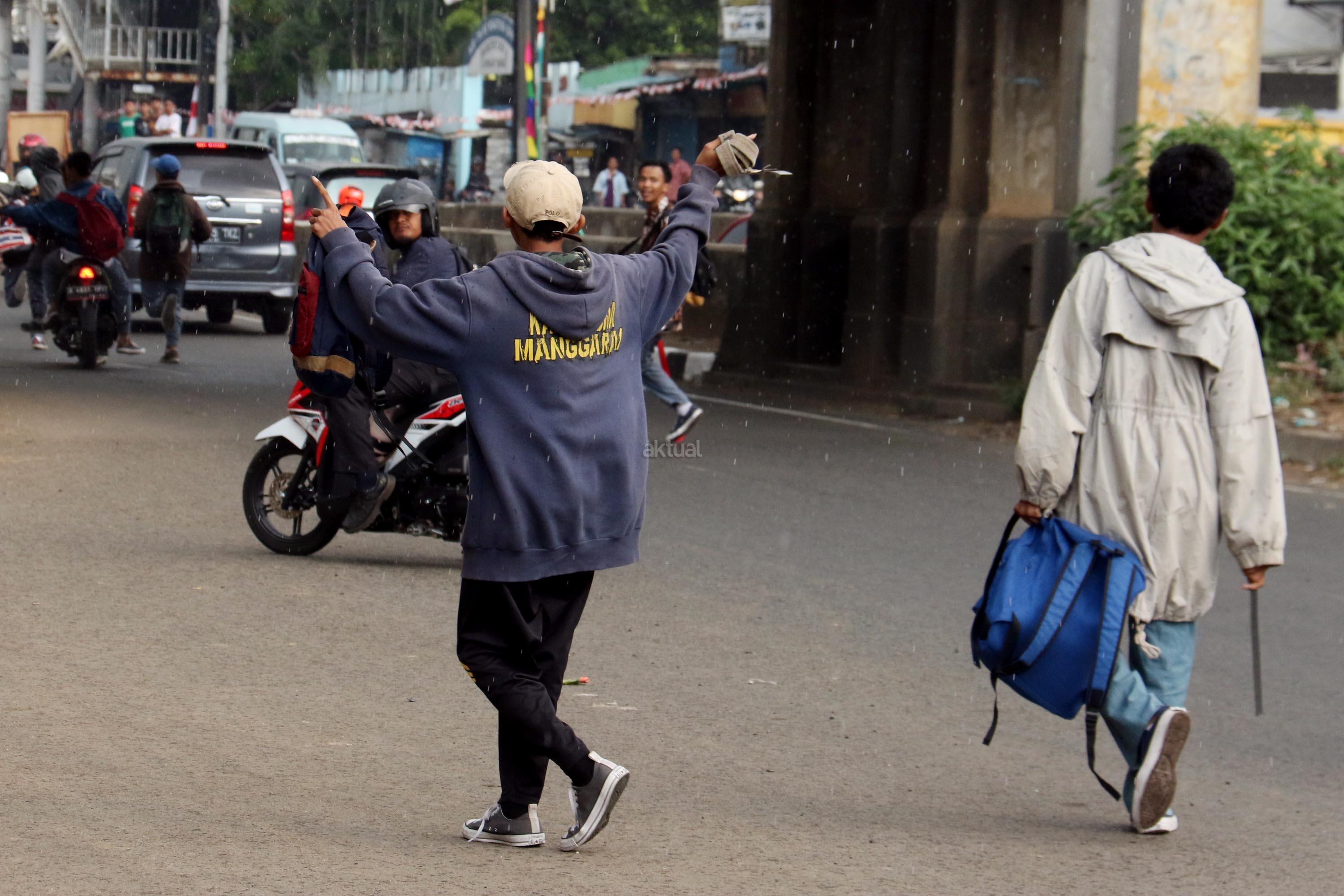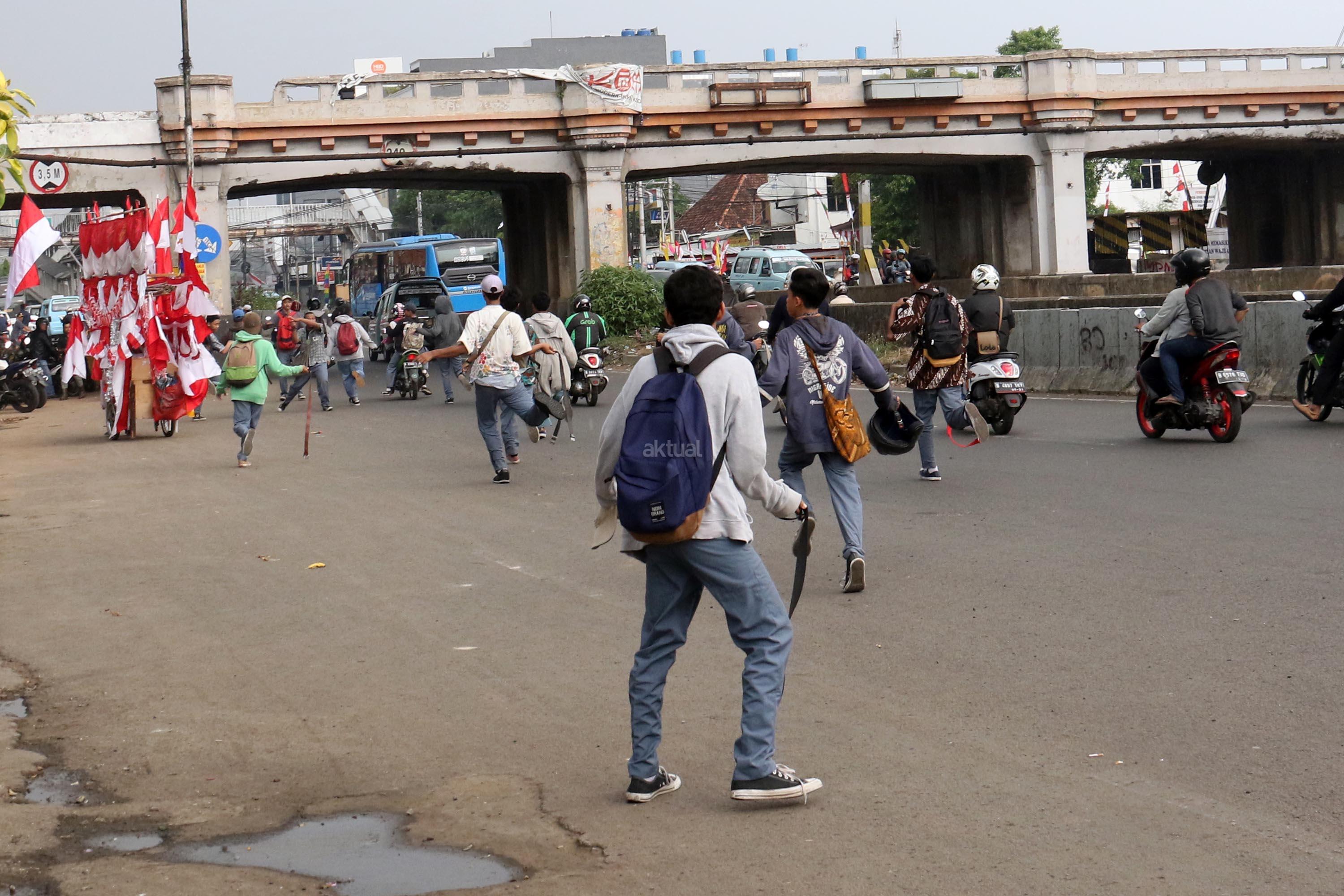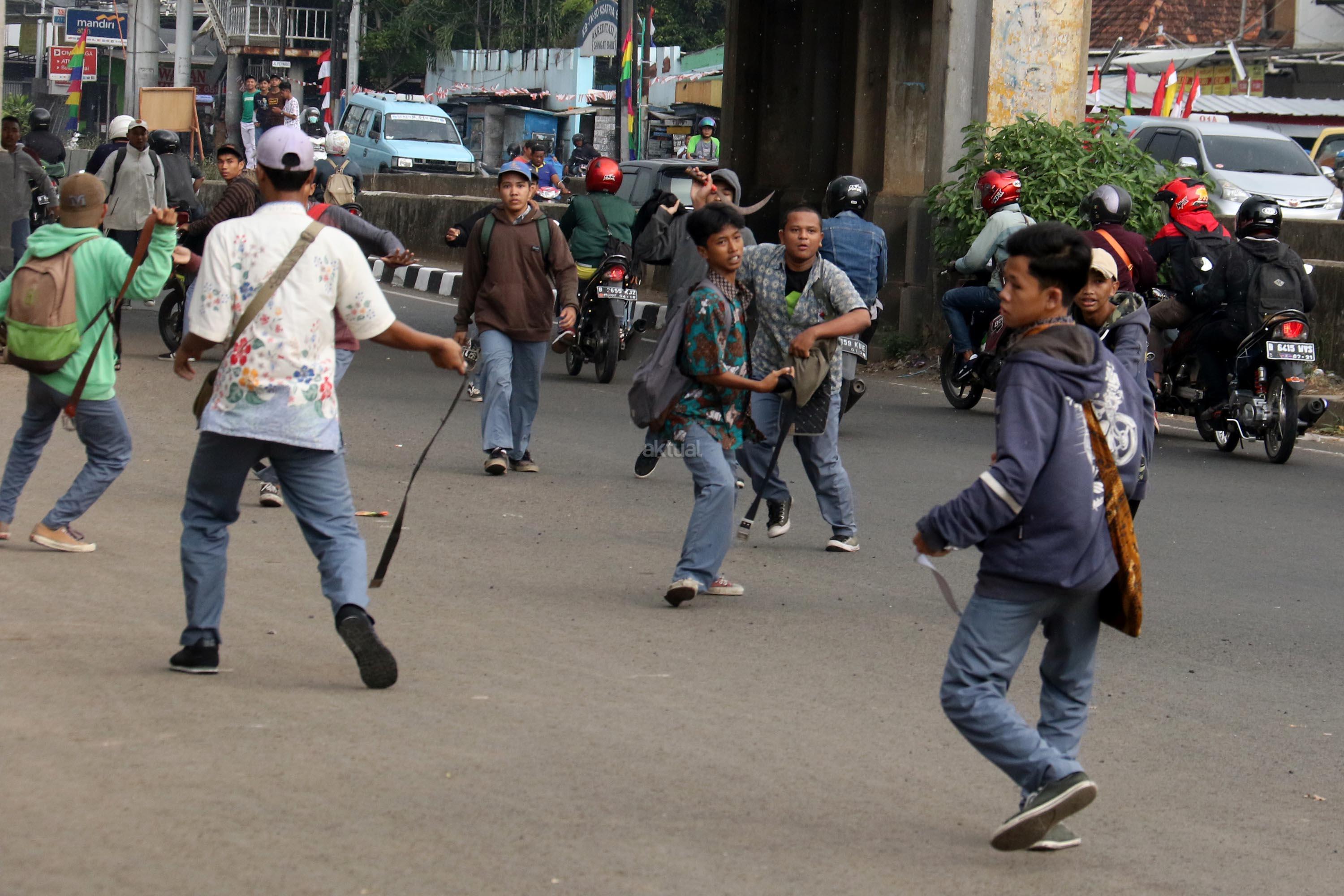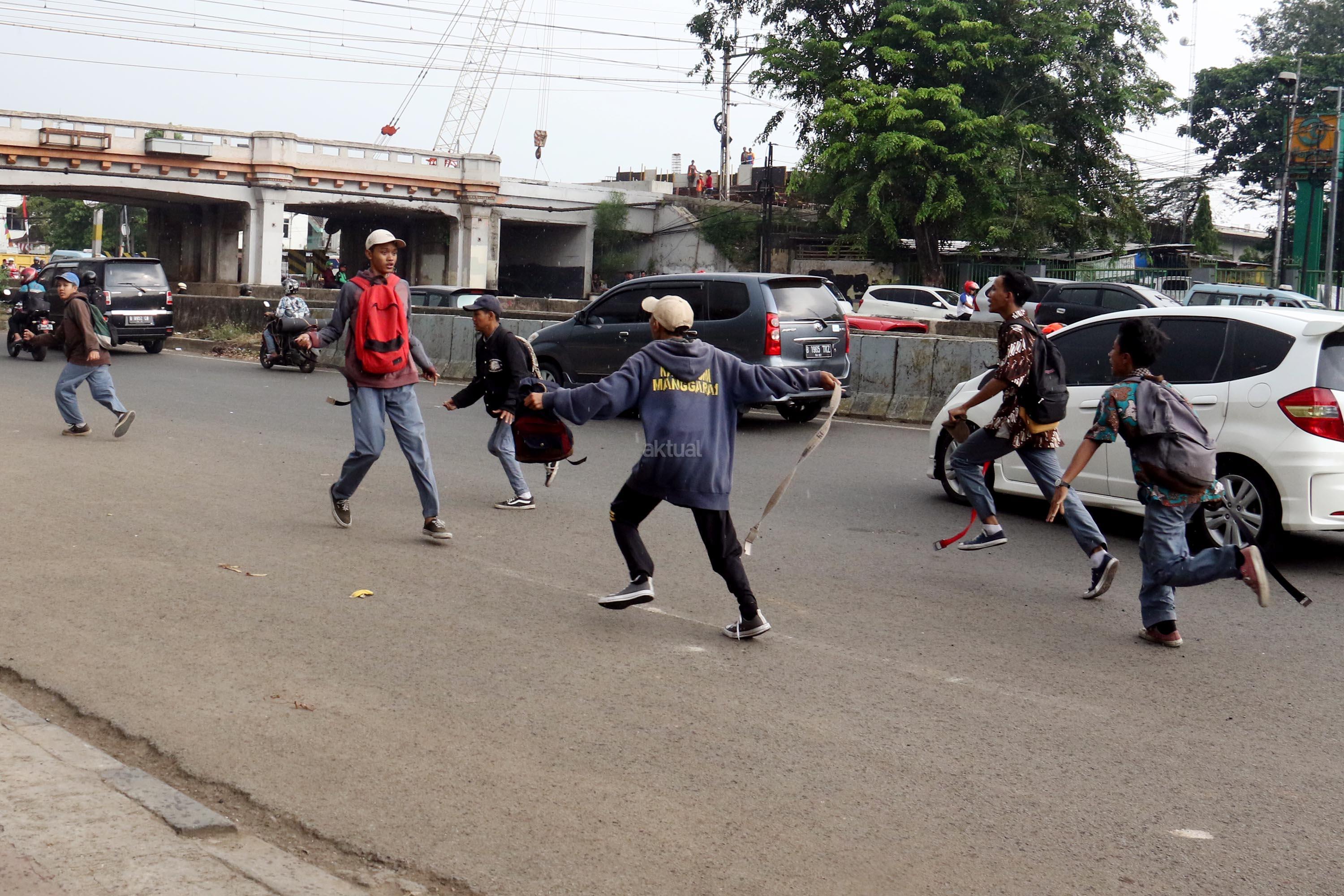 Terlihat puluhan pelajar Sekolah Menengah Kejuruan (SMK) terlibat aksi saling serang di Jalan Matraman Raya, Jatinegara, Jakarta Timur, Kamis (10/8/2017). Tawuran pelajar ini kerap terjadi hampir setiap siang hari dan para pelajar membawa berbagai senjata tajam serta membawa ikat pinggang. AKTUAL/Munzir