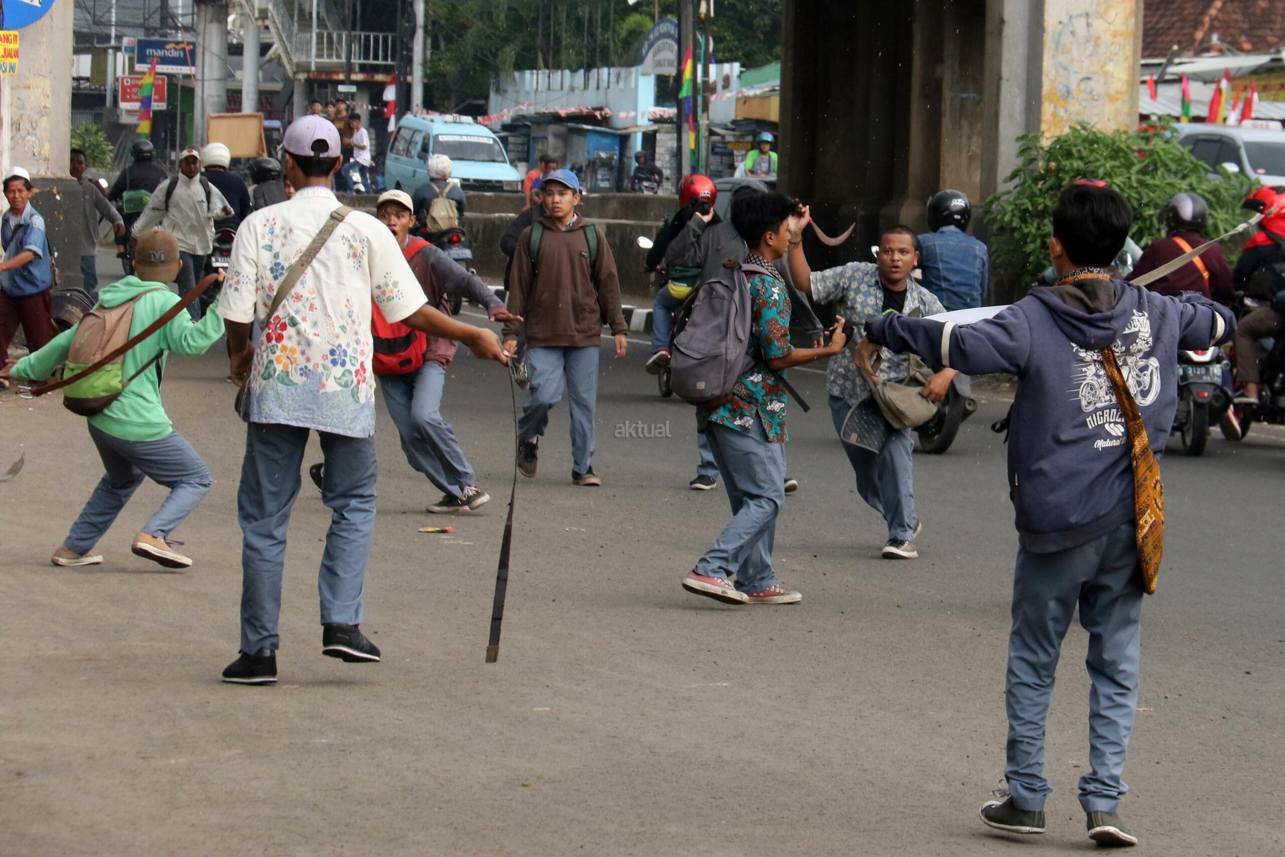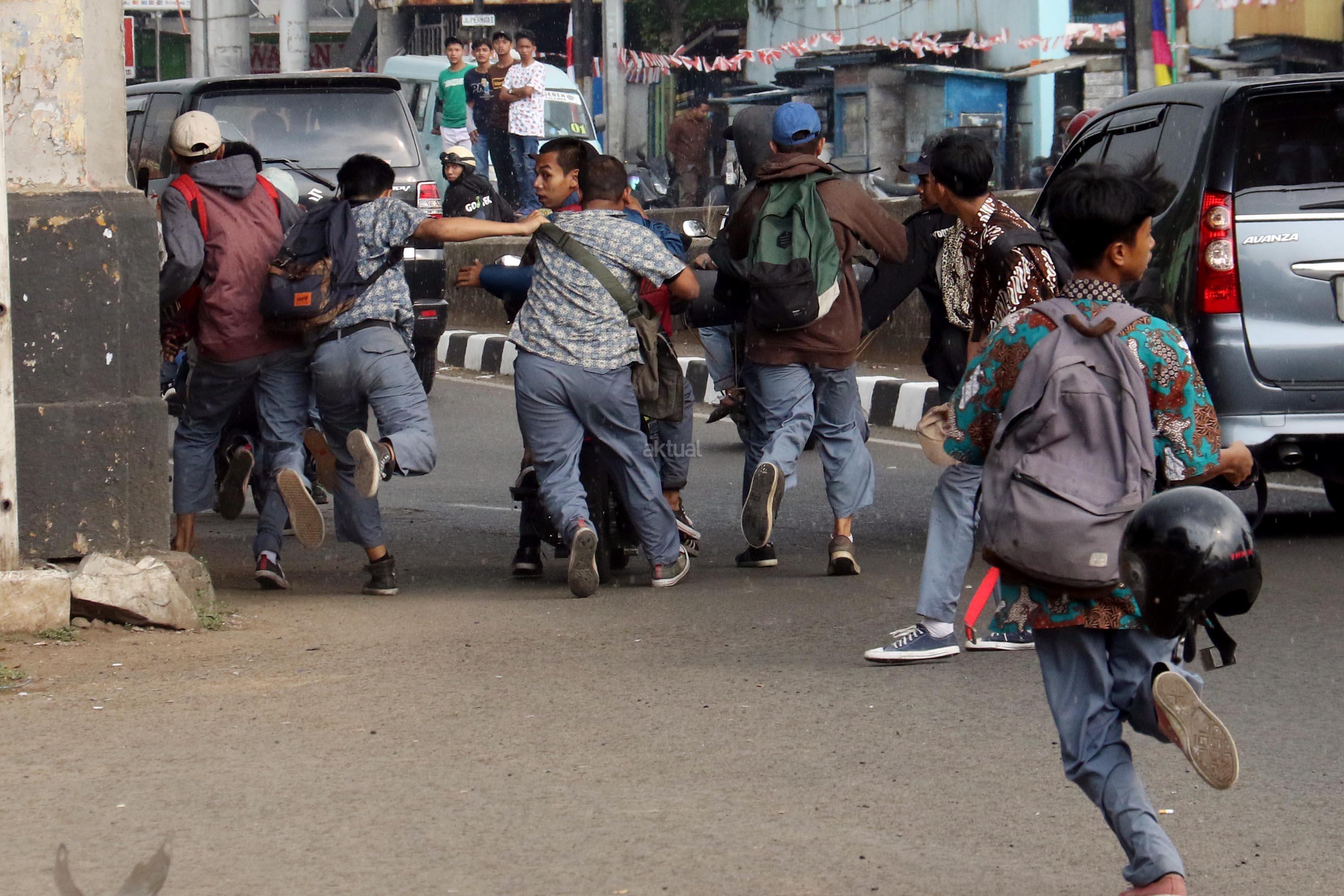 Terlihat puluhan pelajar Sekolah Menengah Kejuruan (SMK) terlibat aksi saling serang di Jalan Matraman Raya, Jatinegara, Jakarta Timur, Kamis (10/8/2017). Tawuran pelajar ini kerap terjadi hampir setiap siang hari dan para pelajar membawa berbagai senjata tajam. AKTUAL/Munzir