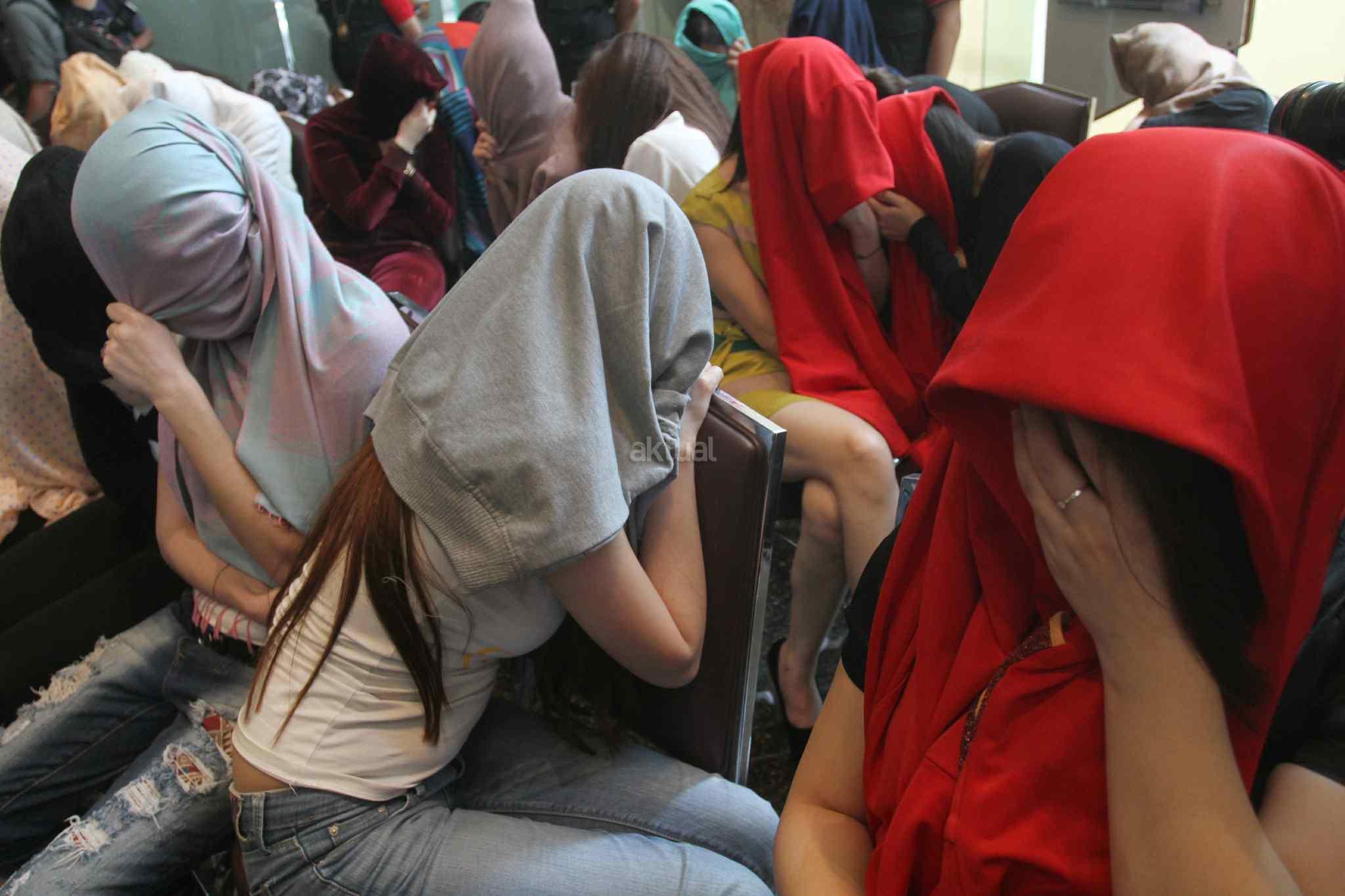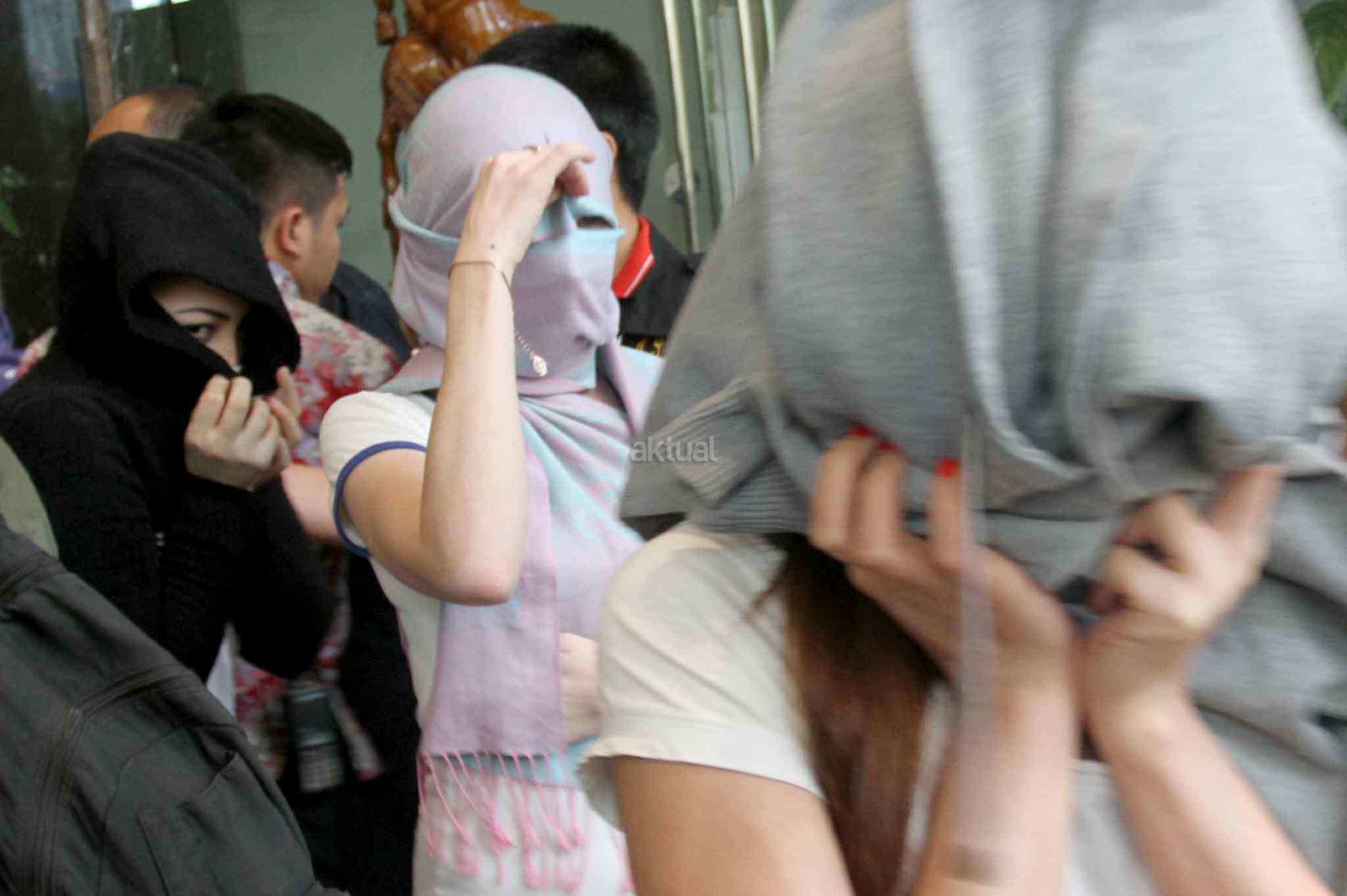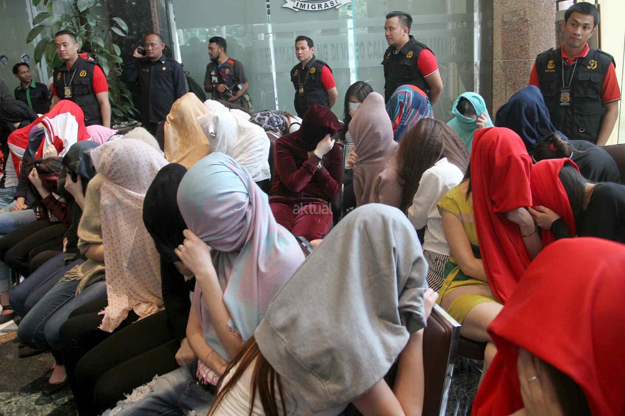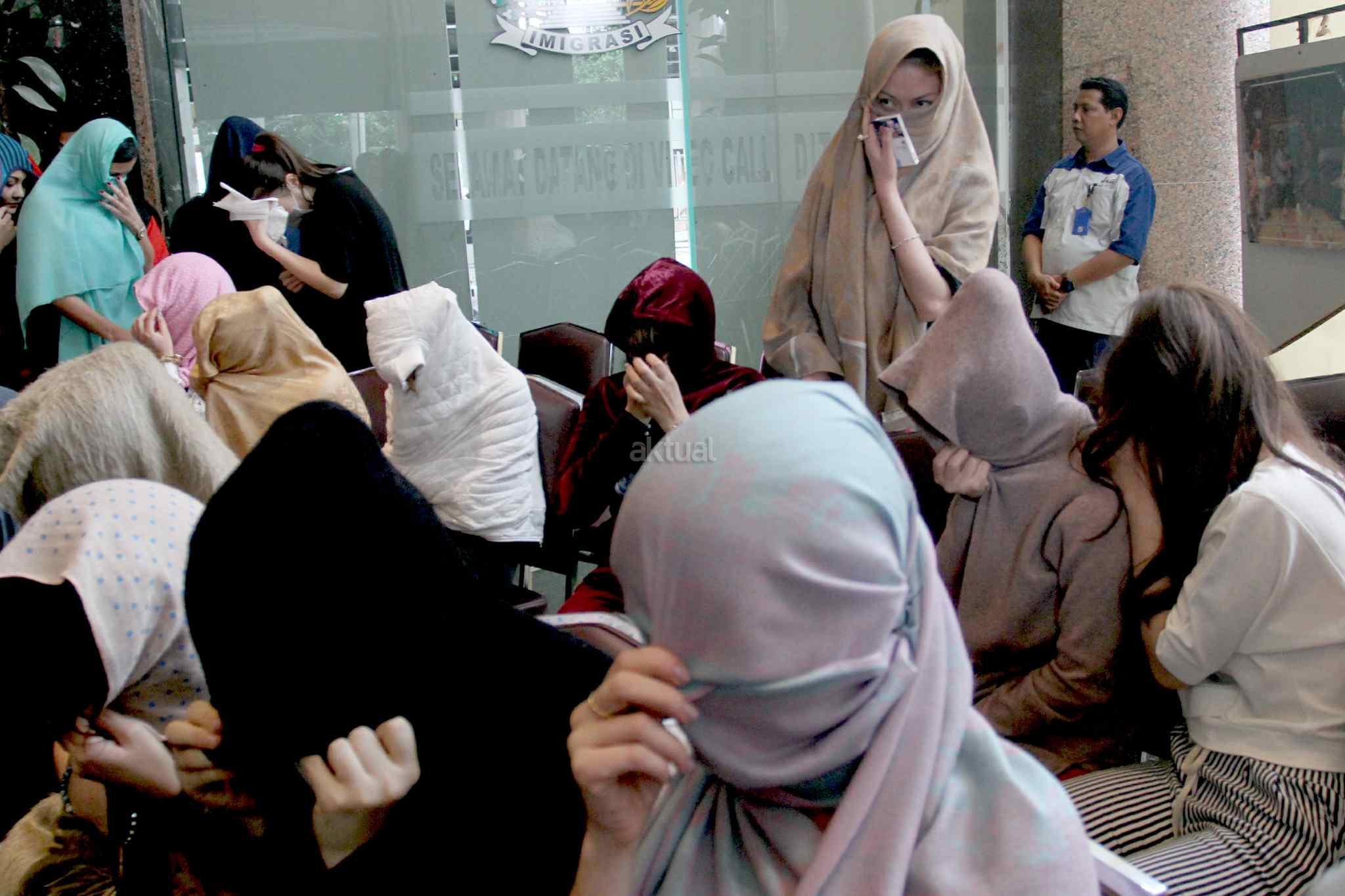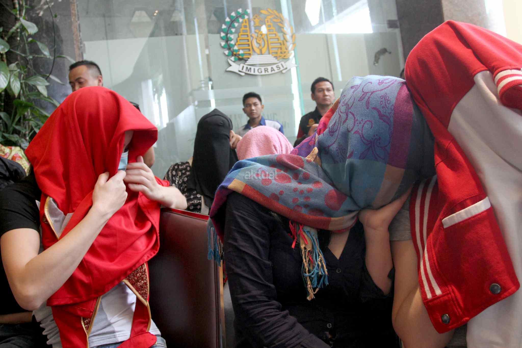 Puluhan perempuan warga negara asing (WNA) menutup wajahnya seusai operasi pengawasan orang asing di Jakarta, Jumat (13/1). Operasi tersebut mengamankan 32 perempuan dari enam negara antara lain Vietnam, Kazakhstan, Uzbekistan, Tiongkok, Maroko, dan Rusia yang dipekerjakan sebagai pemandu karaoke dan PSK.