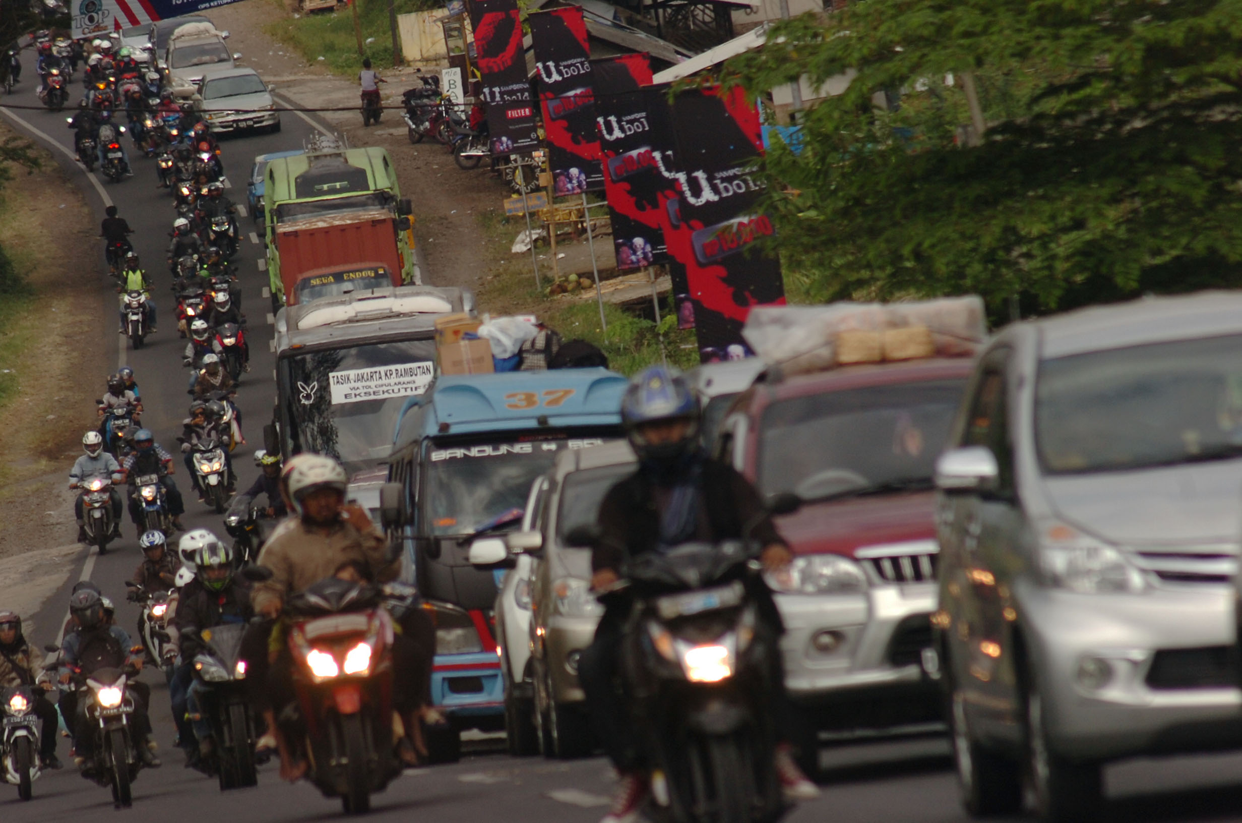 Kendaraan memadati Jalur Selatan Ciawi, Kabupaten Tasikmalaya, Jawa Barat, Minggu (10/7). Pada H+4 arus balik Lebaran kendaraan yang melintas di Jalur Selatan menuju Bandung dan Jakarta masih terpantau padat. ANTARA FOTO/Adeng Bustomi/kye/16