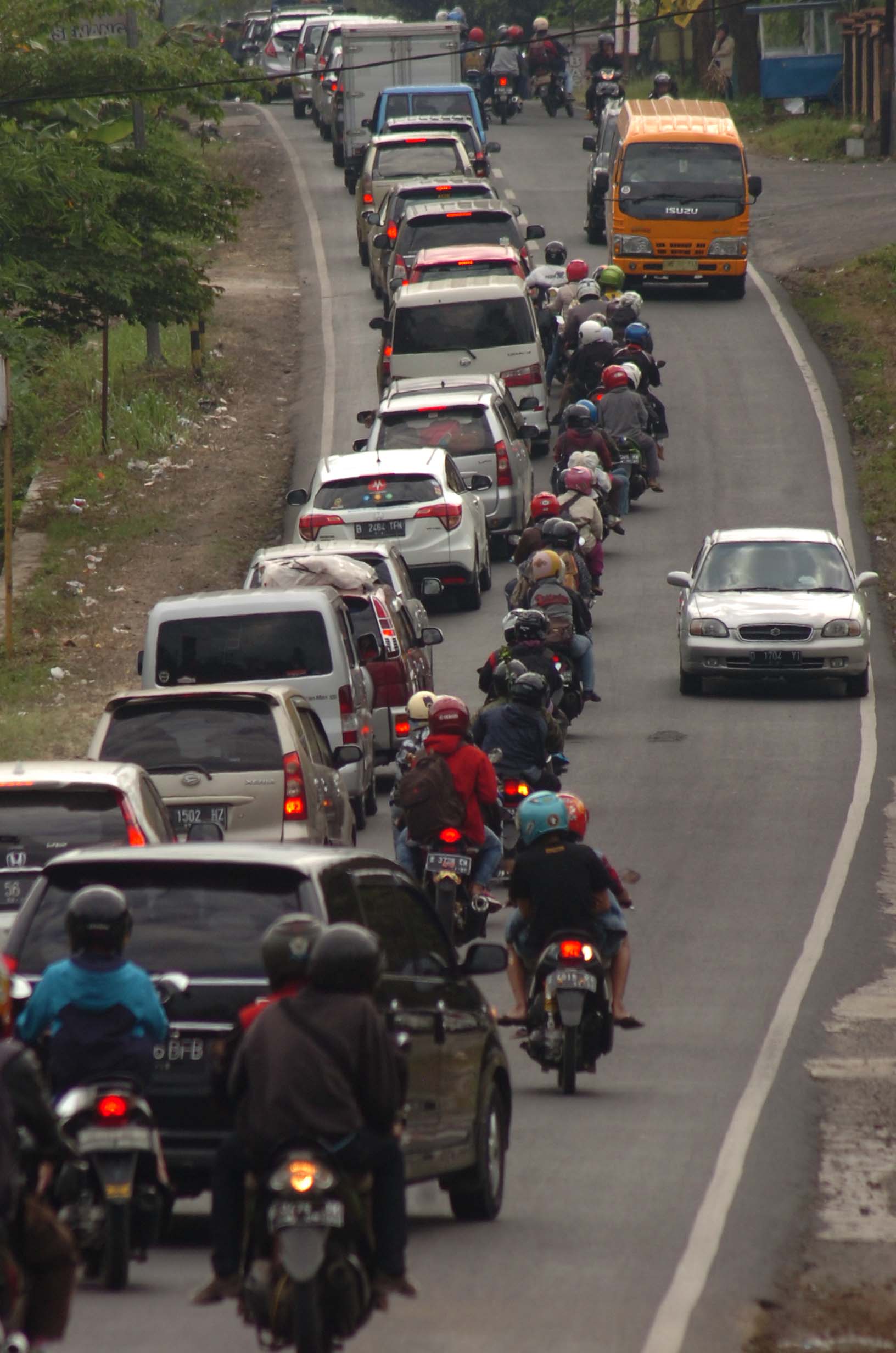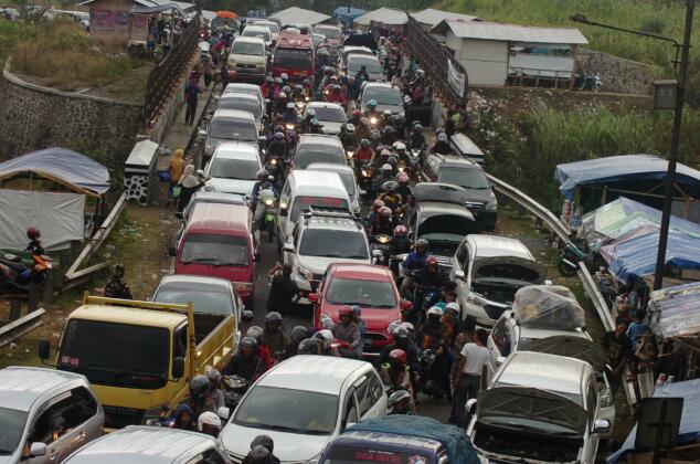 Kendaraan terjebak kemacetan di ruas Jalan Lingkar Gentong, Kabupaten Tasikmalaya, Jawa Barat, Minggu (10/7). Satuan Lalu Lintas Polres Tasikmalaya Kota memberlakukan sistem satu arah (one way) untuk mengurai kemacetan saat puncak arus balik berlangsung di jalur selatan. ANTARA FOTO/Adeng Bustomi/kye/16