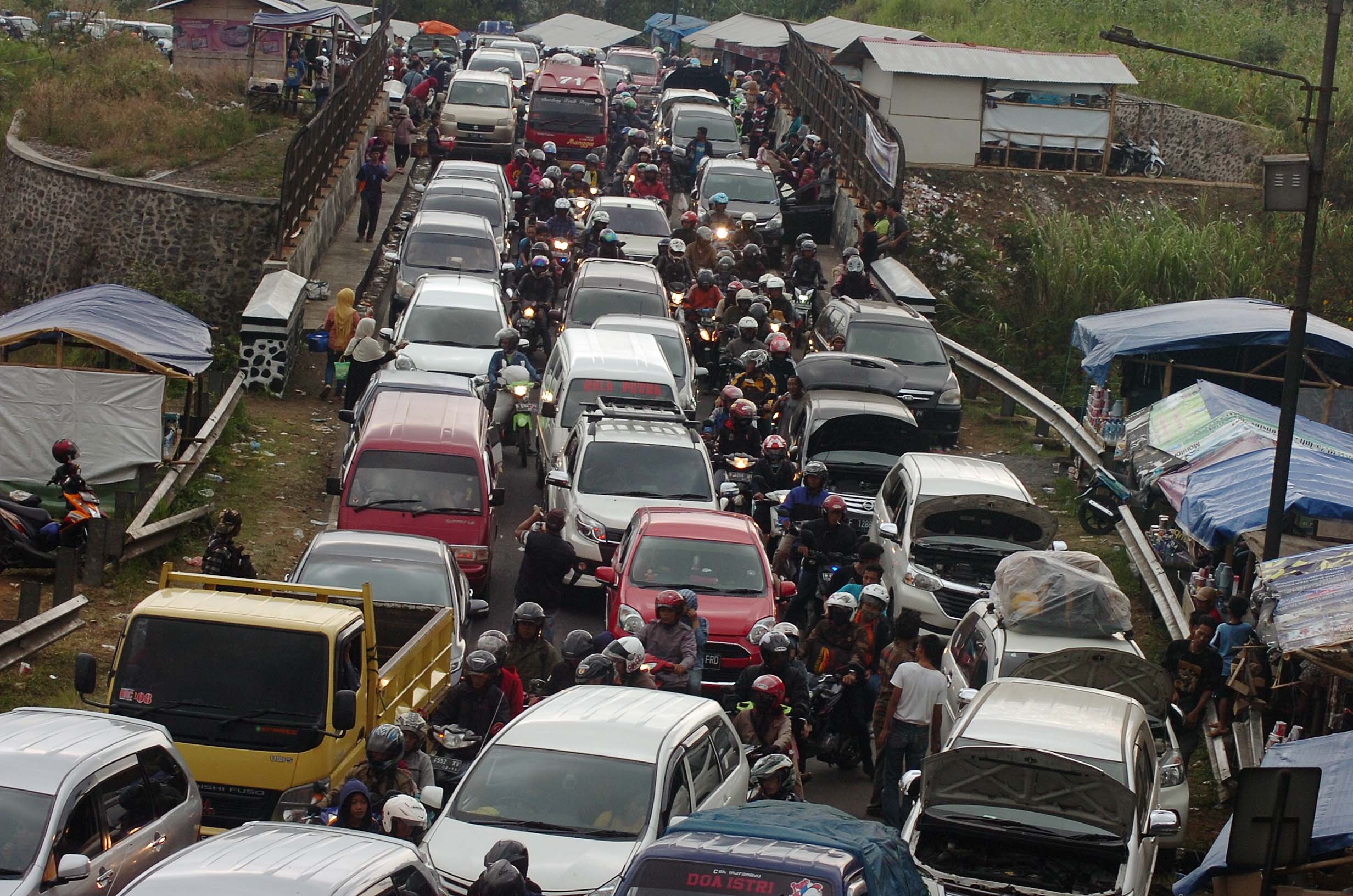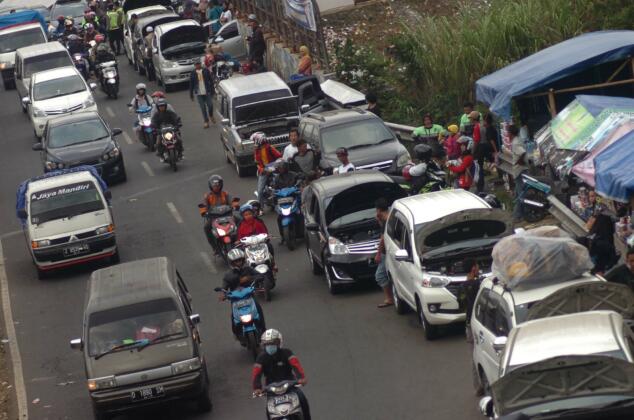 Sejumlah kendaraan pemudik diparkir di pinggir jalan karena mengalami kerusakan mesin di Lingkar Gentong, Kabupaten Tasikmalaya, Jawa Barat, Minggu (10/7). Puluhan mobil pemudik arus balik mengalami kerusakan mesin akibat terjebak kemacetan dan kendala jalan di jalur selatan yang banyak menanjak. ANTARA FOTO/Adeng Bustomi/kye/16
